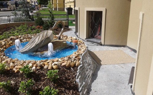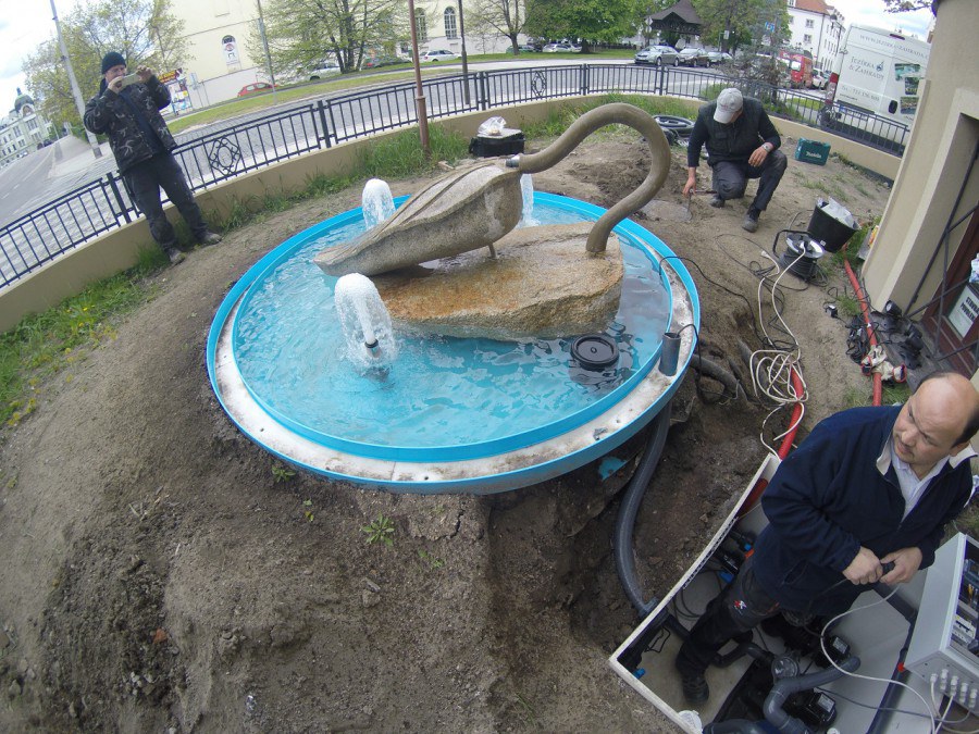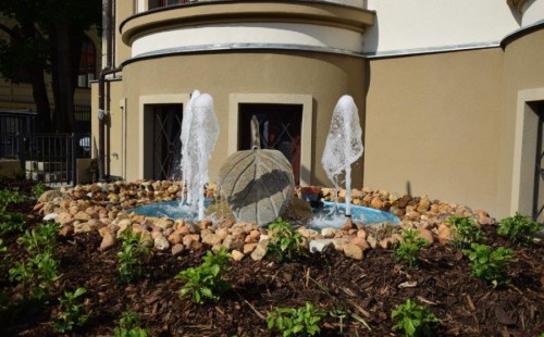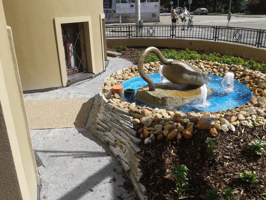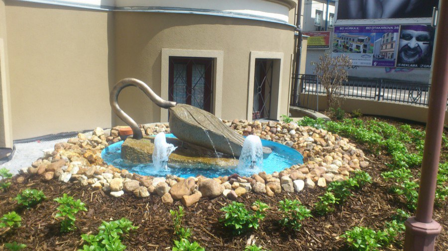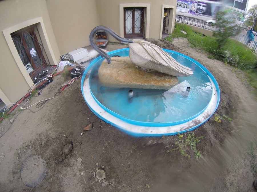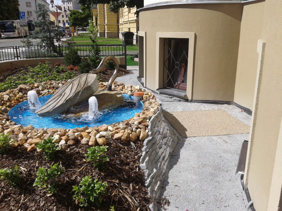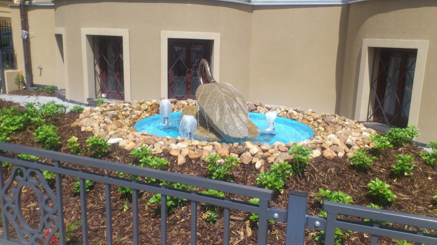 U této specifické realizace okrasné fontány v Českých Budějovicích jsme byli požádáni o dodávku technologie. K ústřednímu okrasnému listu byl požadavek na padající vodu z listu, následně pak samostatné 3x trysky, osvětlení celé fontány a hlavně byla požadována čistá voda. Na tuto fontánu byla použita technologie: filtrační set Azur KIT 380 4m3 s čerpadlem Preva 25, dávkovač chemie Rainbow 320, bazénové čerpadlo Winner 100T pro efekty trysek, čerpadlo Pontec Pondovario 2500 na efekt padající voda z listu. Byl zde nainstalován trubkový skimmer Oase AquaSkim Gravity a bazénový skimmer. Celá fontána byla nasvětlena ledkovým reflektorem Oase Lunaqua 10 led a dále pak ještě ledkovými světly Oase Lunaqua 3 led set 3. Nyní již tato okrasná fontána dělá radost všem v okolí.