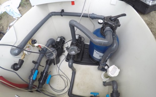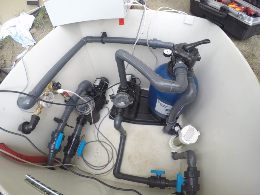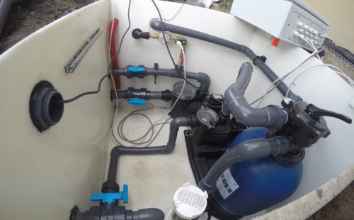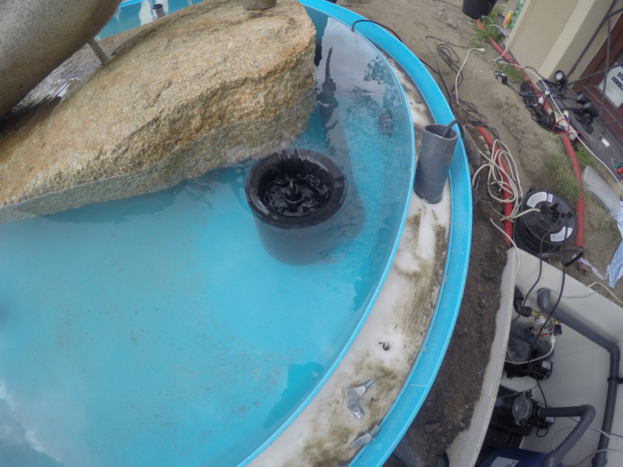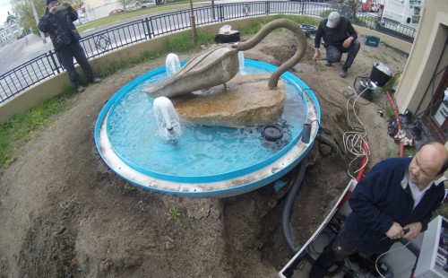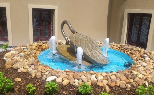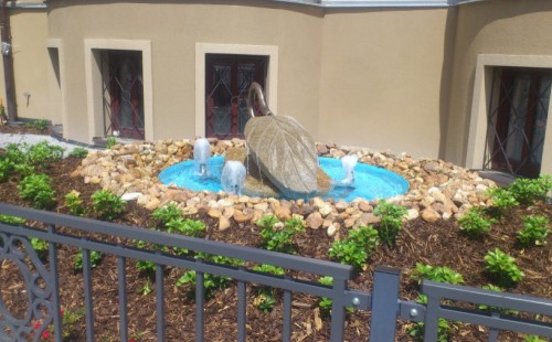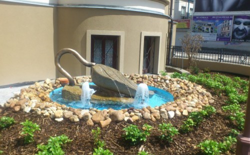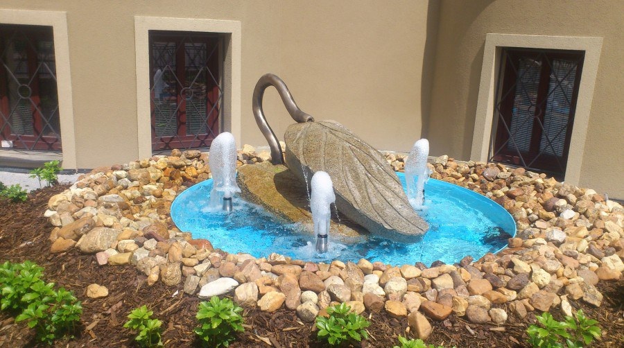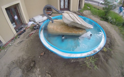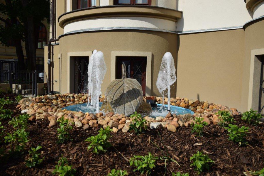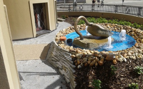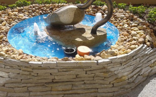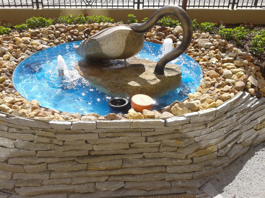 U této specifické realizace okrasné fontány v Českých Budějovicích jsme byli požádáni o dodávku technologie. K ústřednímu okrasnému listu byl požadavek na padající vodu z listu, následně pak samostatné 3x trysky, osvětlení celé fontány a hlavně byla požadována čistá voda. Na tuto fontánu byla použita technologie: filtrační set Azur KIT 380 4m3 s čerpadlem Preva 25, dávkovač chemie Rainbow 320, bazénové čerpadlo Winner 100T pro efekty trysek, čerpadlo Pontec Pondovario 2500 na efekt padající voda z listu. Byl zde nainstalován trubkový skimmer Oase AquaSkim Gravity a bazénový skimmer. Celá fontána byla nasvětlena ledkovým reflektorem Oase Lunaqua 10 led a dále pak ještě ledkovými světly Oase Lunaqua 3 led set 3. Nyní již tato okrasná fontána dělá radost všem v okolí.