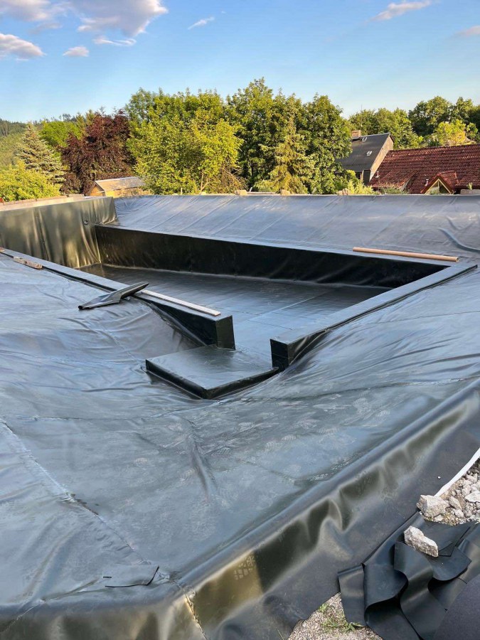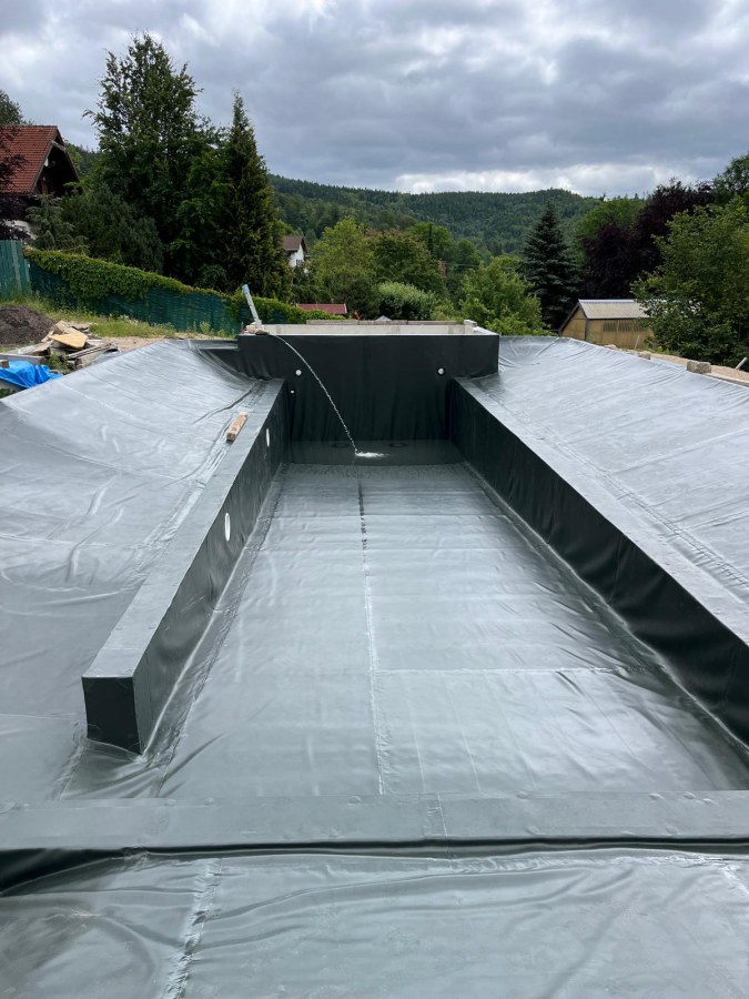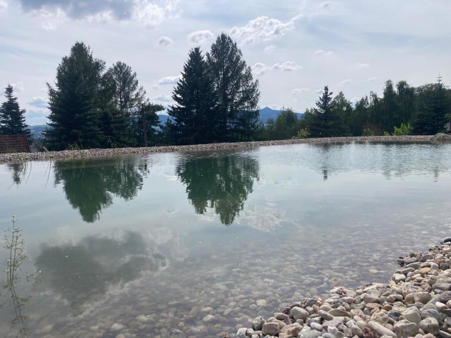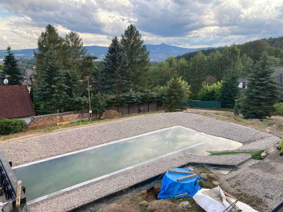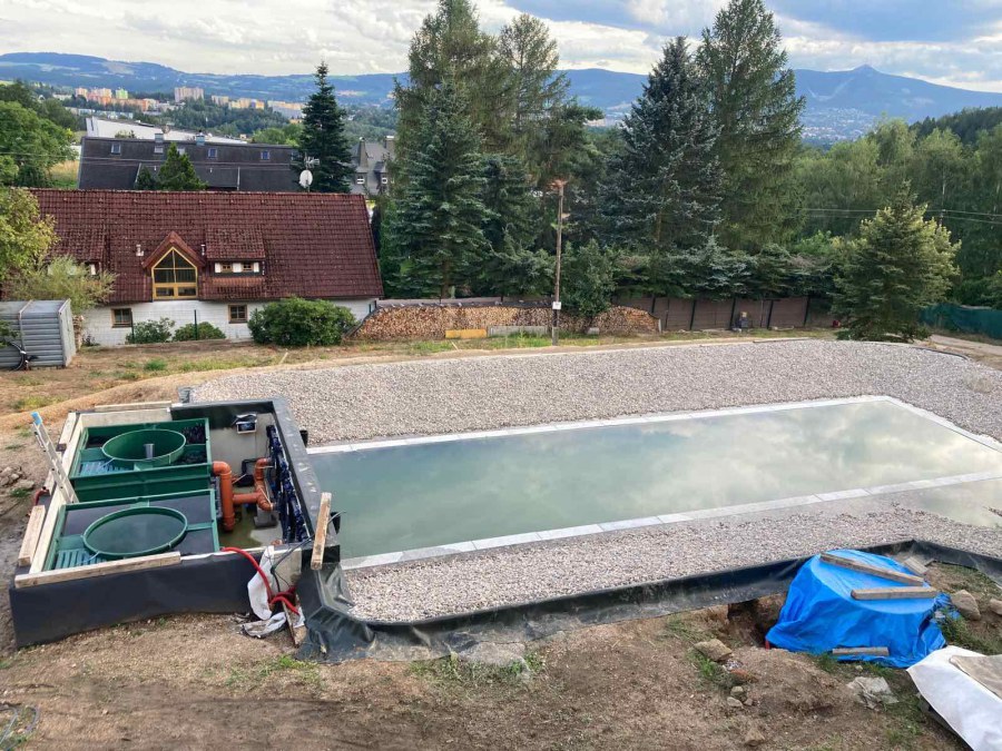 Toto koupací jezírko v Liberci jsme stavěli na dálku. Majitel si sám i vzhledem ke vzdálenosti od nás, stavěl a fólioval svépomocí. Jen pod naším dohledem, vše jsme řešili radami po telefonu a emailu. Letos na jaře zabudoval na dno jezírka spodní vpusti - gule a do stěny technické místnosti fóliové příruby pro skimmery Oase Aquaskim Gravity. A také natáhl flexi hadice 63mm na výtok čisté vody z technické místnosti zpět do jezírka. V létě jsme mu dodávali jezírkovou fólii Fatra Aquaplast 805/V olivově zelenou a speciální fóliové lišty. Po dokončení těchto prací jsme již mohli přijet a zapojit technologii. Přivezli jsme 2 ks biologicko-mechanického filtru Tripond Vortex Center C115, k němu jsme zapojili 4 ks UV lampy TMC Pro Pond Titan 110W. Vodu zpět do jezírka tlačí 2 ks čerpadel Oase AquaMax Gravity 20000. Dokončení jezírka si již majitel realizoval opět sám. K udržení čisté vody a fólie jsme doporučili pravidelně používat bazénový robotický vysavač.
