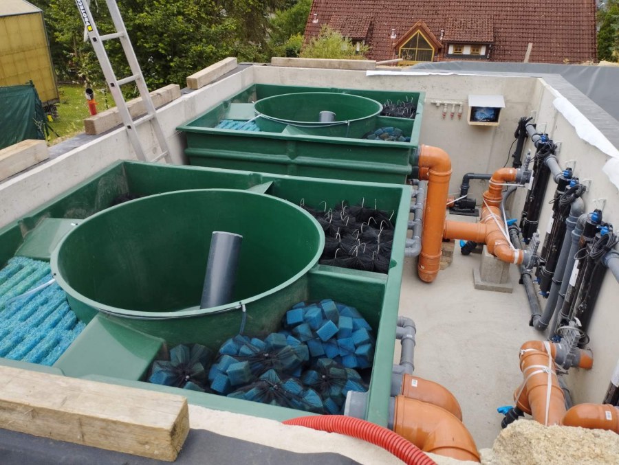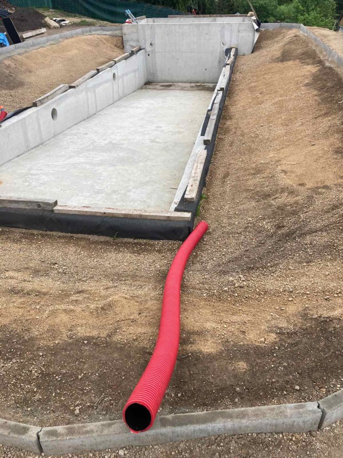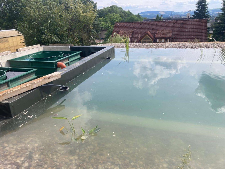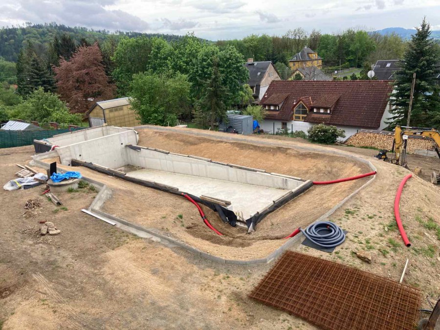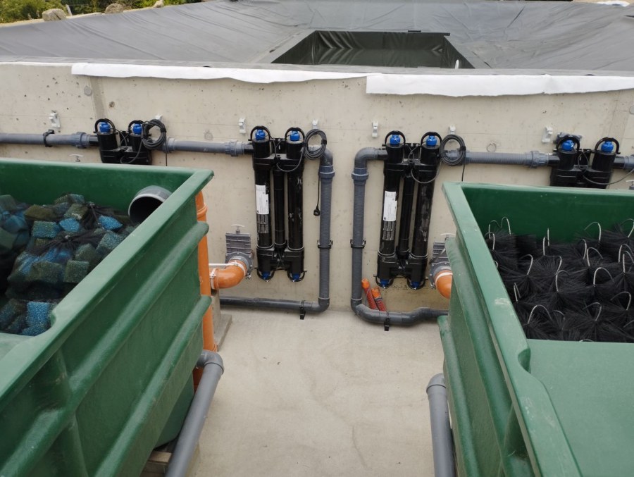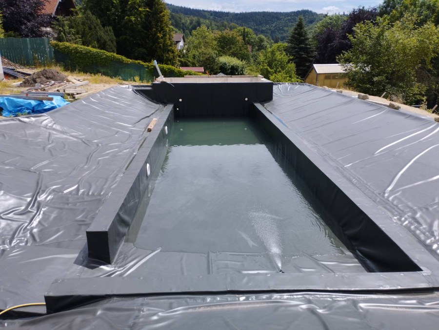 Toto koupací jezírko v Liberci jsme stavěli na dálku. Majitel si sám i vzhledem ke vzdálenosti od nás, stavěl a fólioval svépomocí. Jen pod naším dohledem, vše jsme řešili radami po telefonu a emailu. Letos na jaře zabudoval na dno jezírka spodní vpusti - gule a do stěny technické místnosti fóliové příruby pro skimmery Oase Aquaskim Gravity. A také natáhl flexi hadice 63mm na výtok čisté vody z technické místnosti zpět do jezírka. V létě jsme mu dodávali jezírkovou fólii Fatra Aquaplast 805/V olivově zelenou a speciální fóliové lišty. Po dokončení těchto prací jsme již mohli přijet a zapojit technologii. Přivezli jsme 2 ks biologicko-mechanického filtru Tripond Vortex Center C115, k němu jsme zapojili 4 ks UV lampy TMC Pro Pond Titan 110W. Vodu zpět do jezírka tlačí 2 ks čerpadel Oase AquaMax Gravity 20000. Dokončení jezírka si již majitel realizoval opět sám. K udržení čisté vody a fólie jsme doporučili pravidelně používat bazénový robotický vysavač.