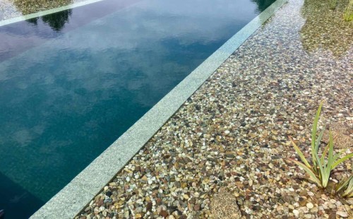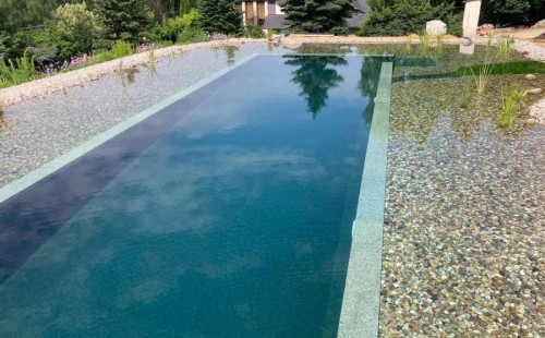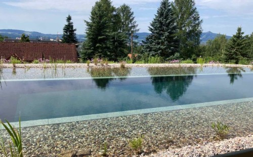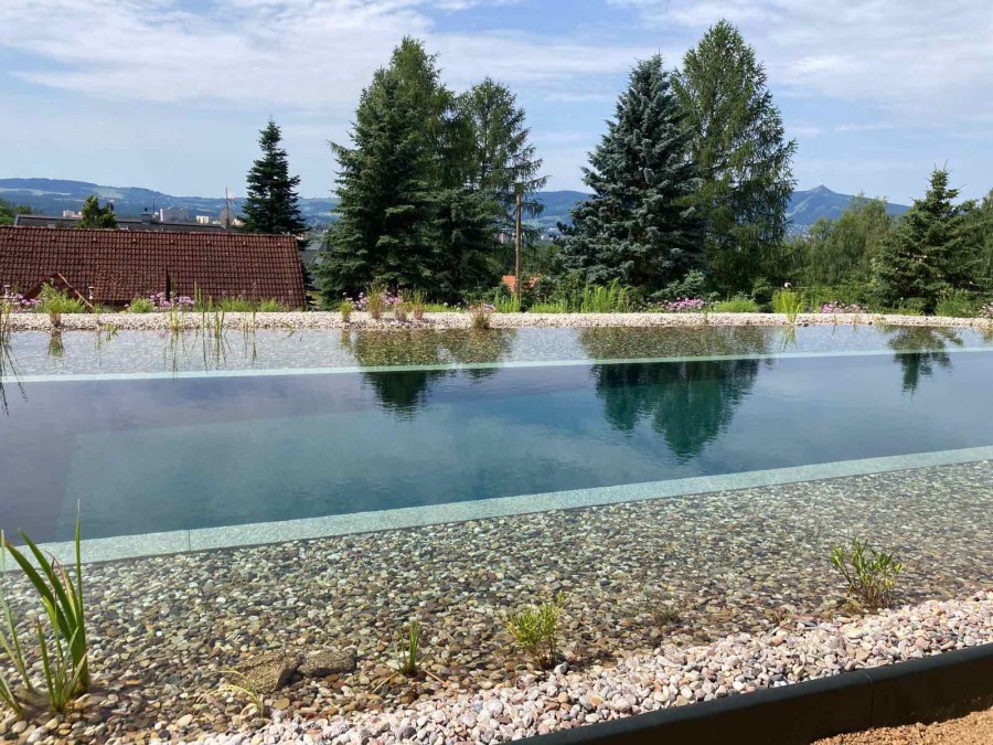 Toto koupací jezírko v Liberci jsme stavěli na dálku. Majitel si sám i vzhledem ke vzdálenosti od nás, stavěl a fólioval svépomocí. Jen pod naším dohledem, vše jsme řešili radami po telefonu a emailu. Letos na jaře zabudoval na dno jezírka spodní vpusti - gule a do stěny technické místnosti fóliové příruby pro skimmery Oase Aquaskim Gravity. A také natáhl flexi hadice 63mm na výtok čisté vody z technické místnosti zpět do jezírka. V létě jsme mu dodávali jezírkovou fólii Fatra Aquaplast 805/V olivově zelenou a speciální fóliové lišty. Po dokončení těchto prací jsme již mohli přijet a zapojit technologii. Přivezli jsme 2 ks biologicko-mechanického filtru Tripond Vortex-Center C115, k němu jsme zapojili 4 ks UV lampy TMC Pro Pond Titan 110W. Vodu zpět do jezírka tlačí 2 ks čerpadel Oase AquaMax Gravity 20000. Dokončení jezírka si již majitel realizoval opět sám. K udržení čisté vody a fólie jsme doporučili pravidelně používat bazénový robotický vysavač.