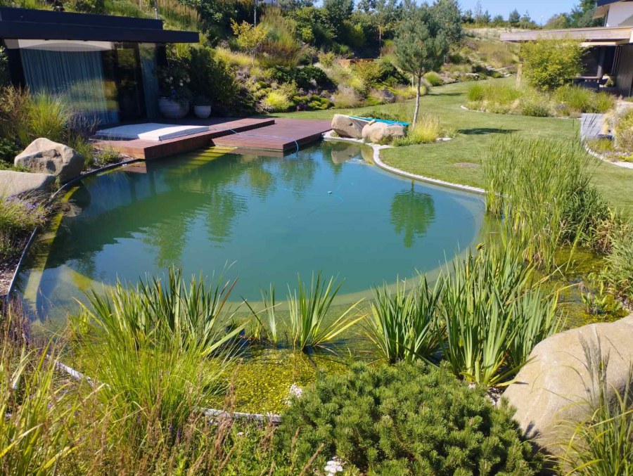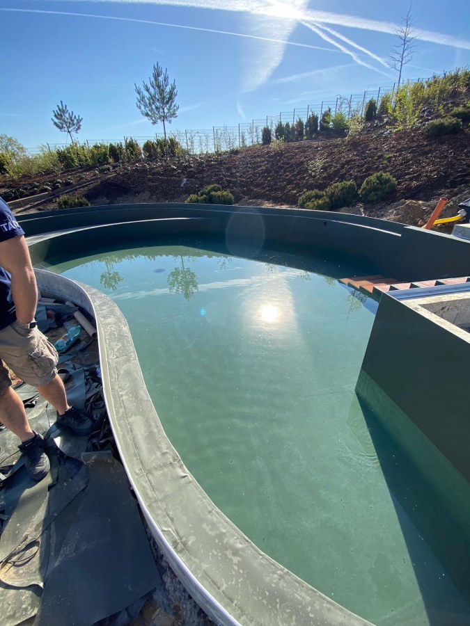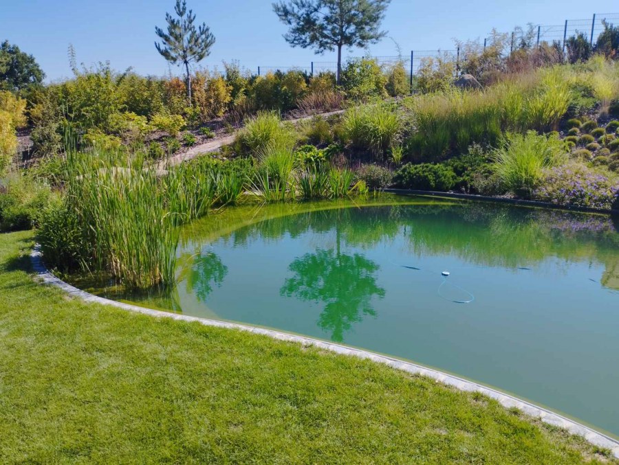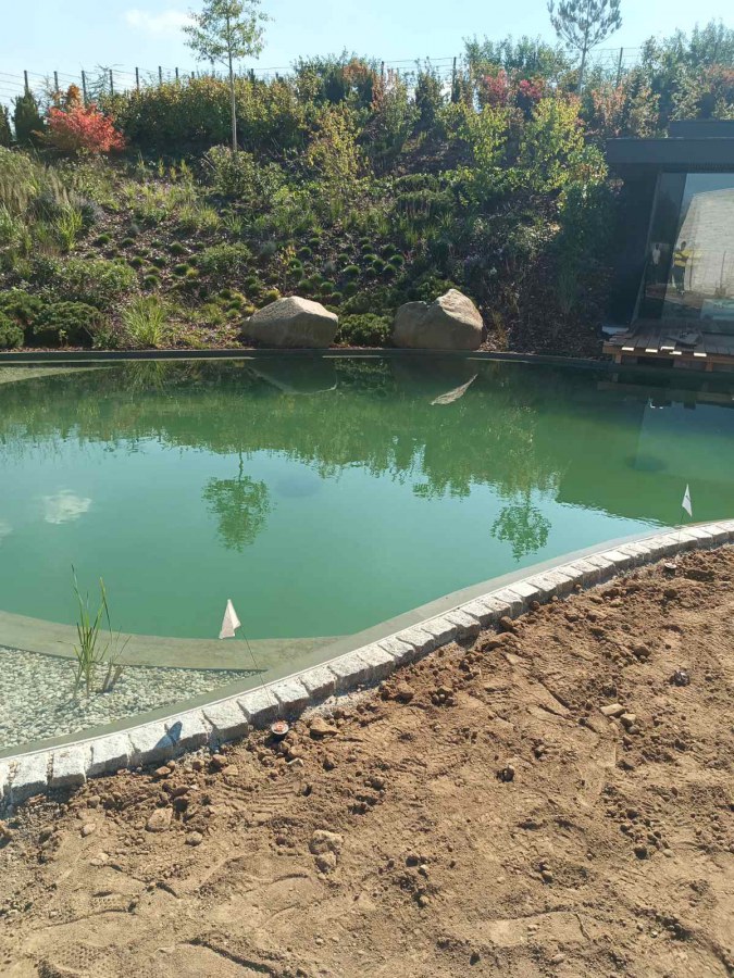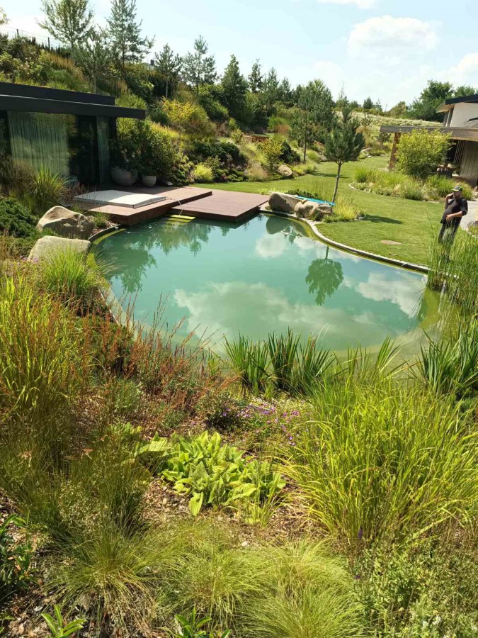 Na jaře se na nás obrátil klient s žádostí o pomoc se zvolením správné technologie ke koupacímu jezírku, které bude i v zimě sloužit jako ochlazovací k sauně. Celý projekt nás velmi zaujal jak tvarem, tak umístěním jezírka v zahradě. Stavbu a pokládku folie si klient zajistil v místě bydliště. Náš úkol byl navrhnout vhodnou technologii. V součinnosti s architekty a stavaři jsme nechali postavit technickou místnost pro biologicko-mechanický filtr Tripond Center-Vortex C115, UV lampu TMC Pro Pond Advantage 110W a čerpadlo Oase AquaMax Gravity 20000. Pro snadnější údržbu dna a stěn jsme doporučili bazénový robotický vysavač Dolphin Supreme M600, který se skvěle osvědčil.