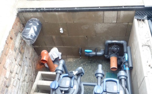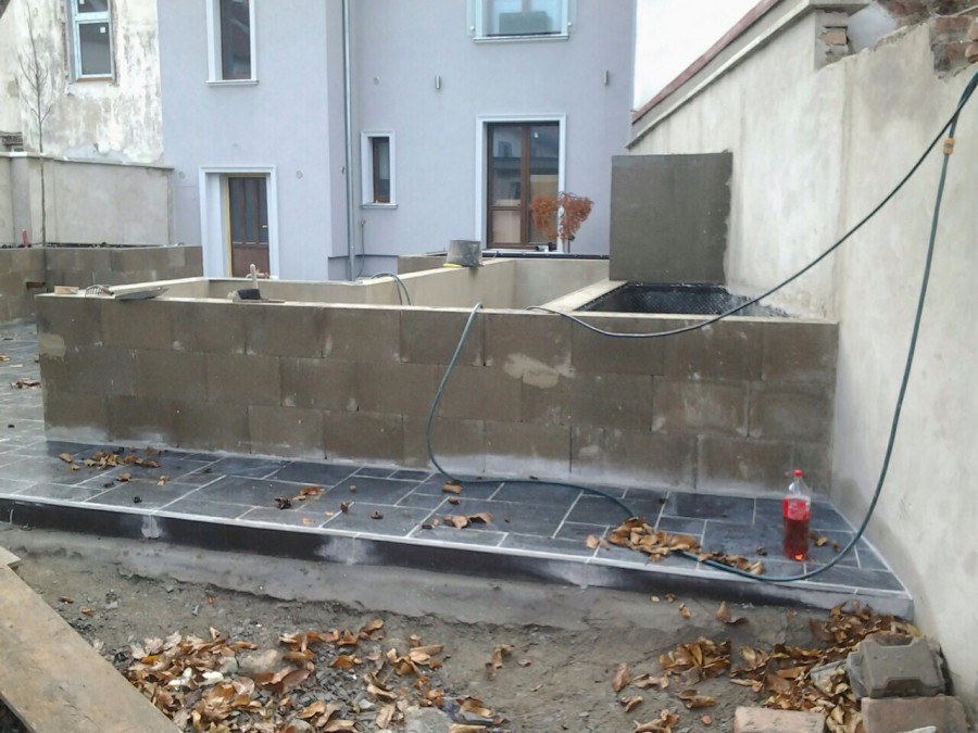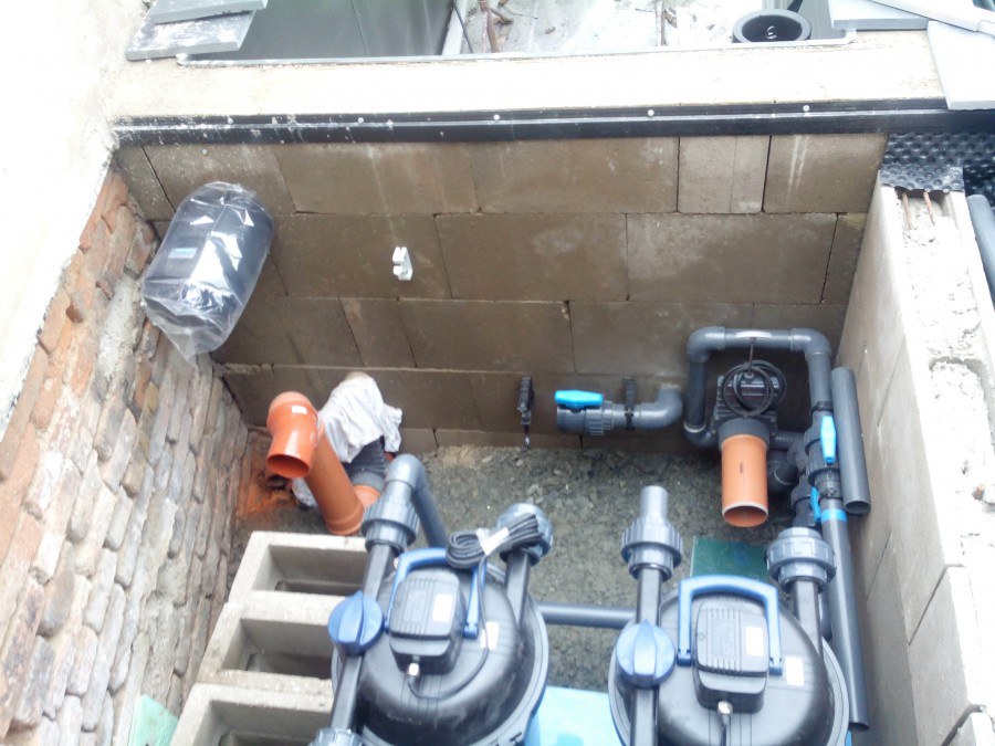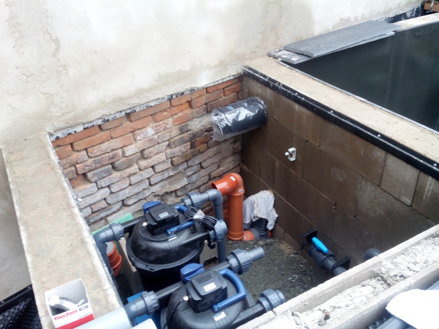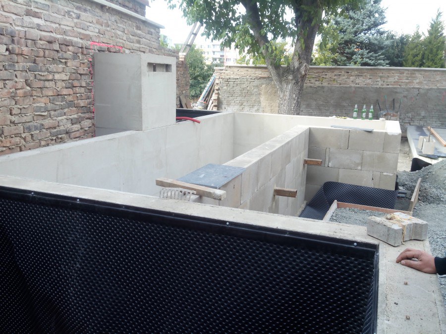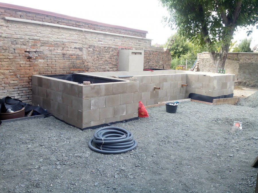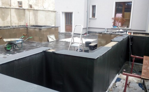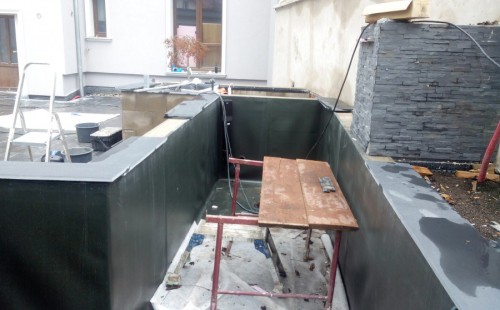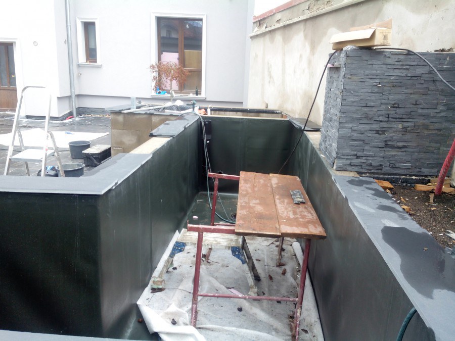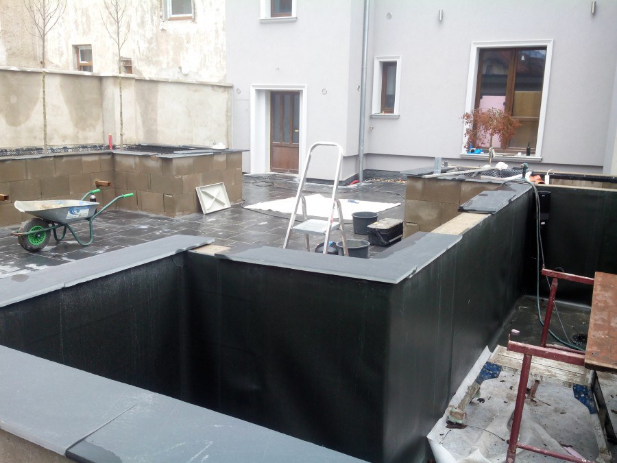 Tato realizace probíhala v Lounech a šlo o položení technologie, vyfóliování a dodávku technologie do okrasného vodního prvku na dvorku řadového domu. Při výstavbě této moderní stavby byla položena technologie (KG potrubí, gula dnová a fóliové příruby pro skimmer Oase AquaSkim Gravity), dále pak proběhla dostavba tohoto okrasného prvku. Poté byla natažena geotextílie 500g a osadily se speciální lišty k připevnění fólie Aquaplast 805 1,5mm. Na přání zákazníka byl navržen nerezový chrlič Oase Waterfall 60 včetně osvětlení Oase Waterfall Illumination 60. Po vyfóliování se začala zapojovat v technické místnosti technologie. Pro tento systém bylo navrženo: 2x filtr Oase Filtoclear 30000, čerpadlo pro systém Aquaking ECO-FTP 3200, čerpadlo pro efekt vodopádu Aquaking ECO-FTP 13000, obě čerpadla jsou uložena v čerpadlové šachtě vyrobené na míru. Efekt a světla budou ovládána dálkovým ovladačem Oase Inscenio Profi-Master.