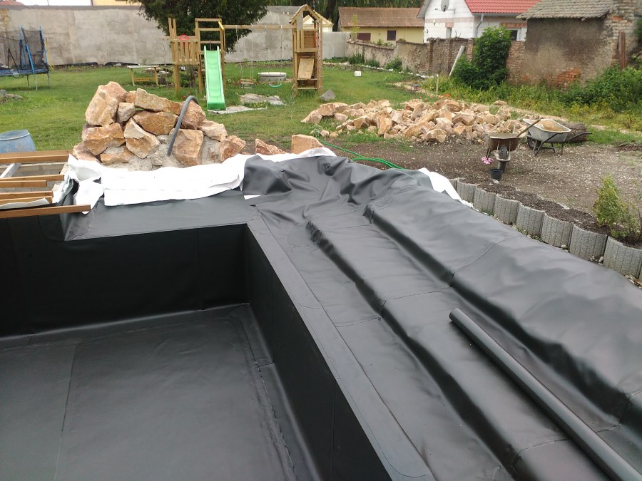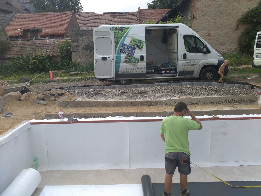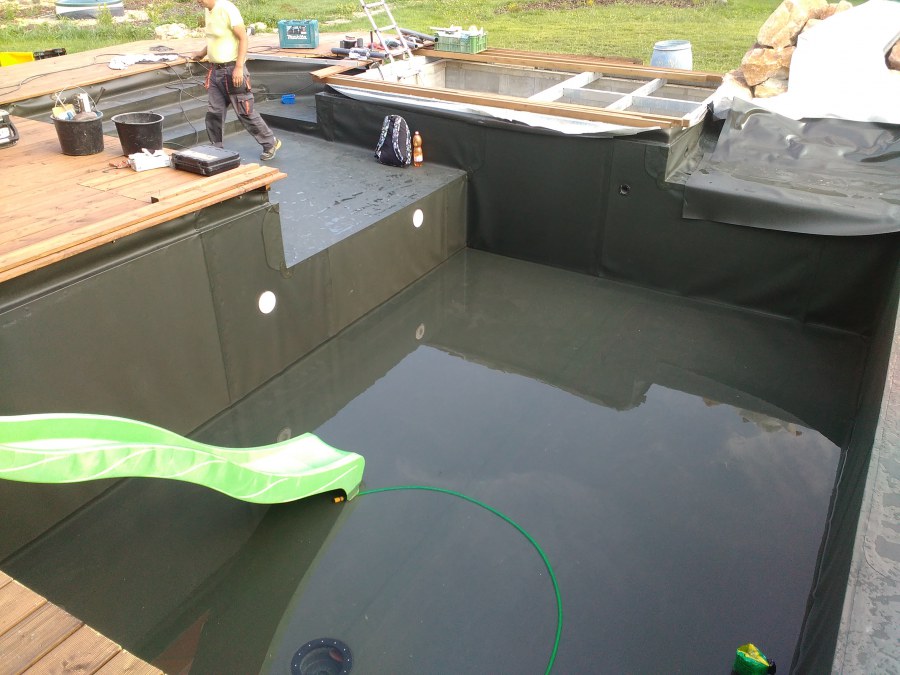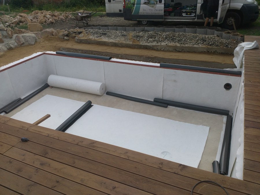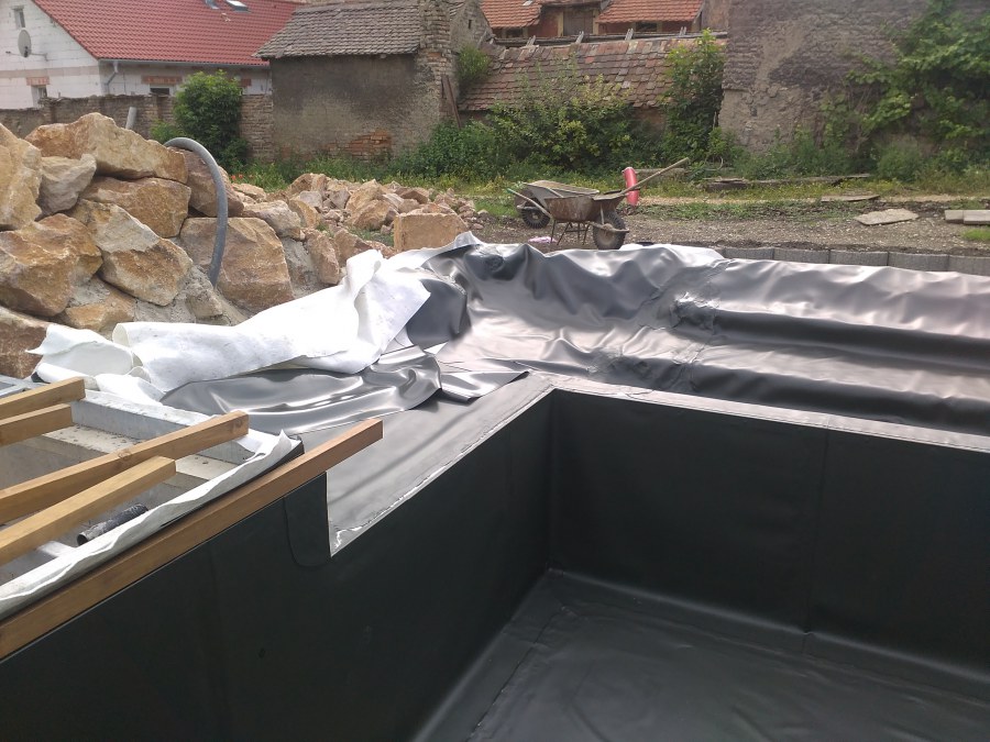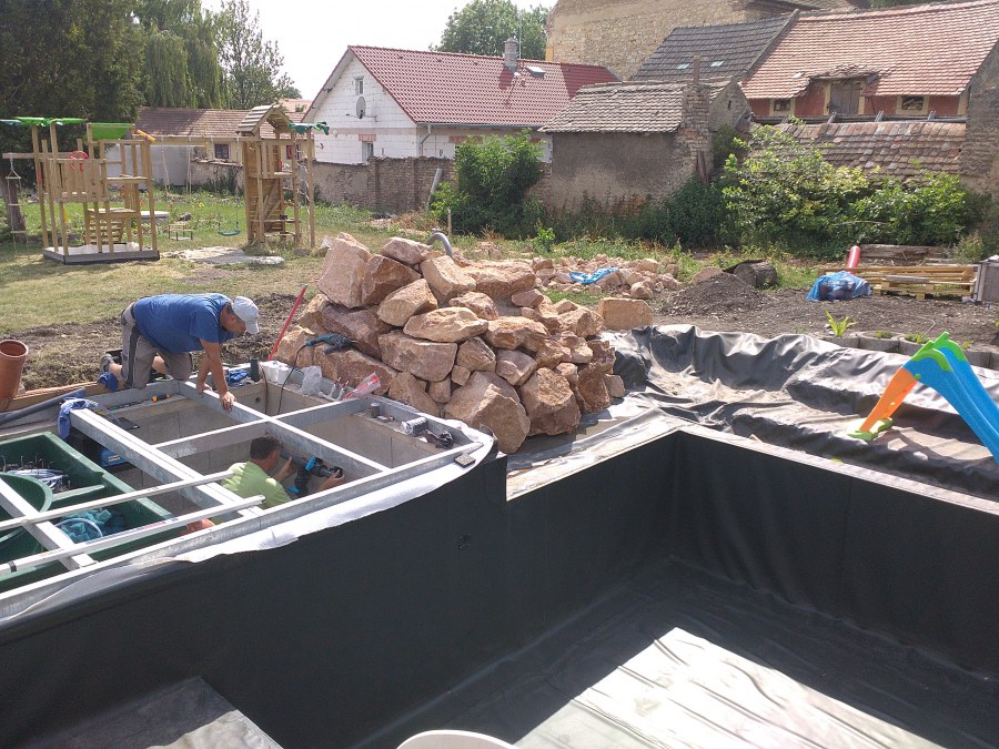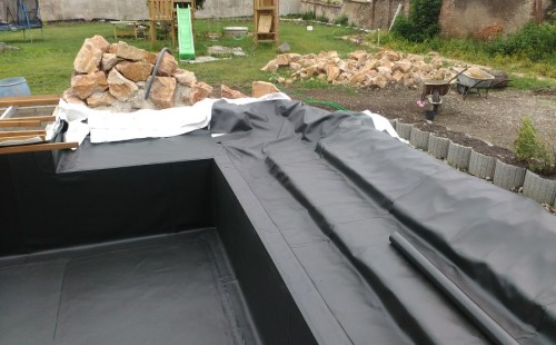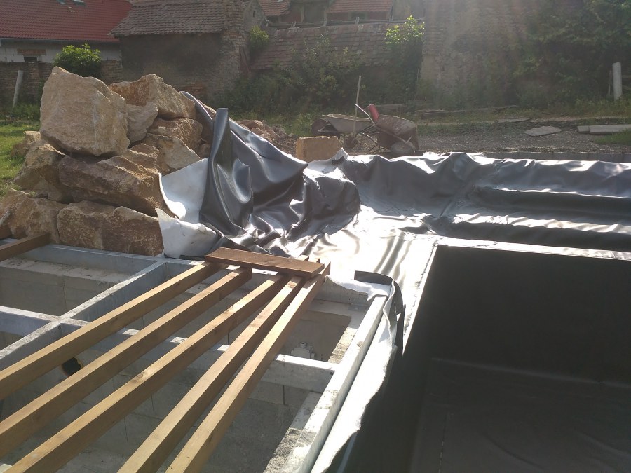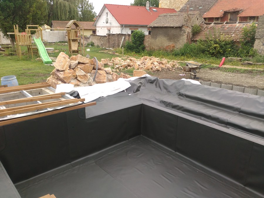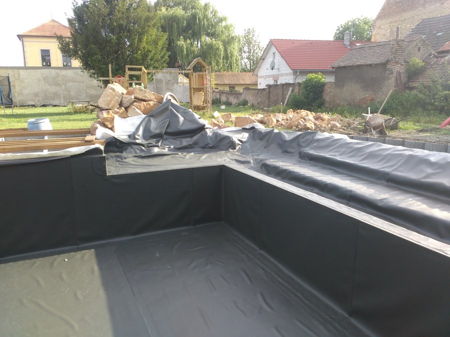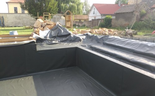 Toto jezírko/bazén pro nás bylo velmi snadné. Klient si připravil vše sám, Vybetonoval stěny a dno jezírka, položil gule a umístil bazénová světla a fóliovou přírubu pro skimmer Oase AquaSkim Gravity. Připravil technickou místnost. Dokonce měl ještě před položením folie připravený základ pro položení terasy. Naši technici mohli jen přijít a položit fólii. Nejdříve museli položit geotextílii 500g poté přivrtat na hrany fóliové lišty a na ně navařit fólii Fatra Aquaplast 805/V olivově zelenou. Do technické místnosti umístili filtr Tripond Vortex Center C115, k němu napojili UV lampu TMC Pro Clean 110W a čerpadlo Oase AquaMax Gravity 20000. Vzduchování do filtru pod média jsme dodali Hailea V-60.