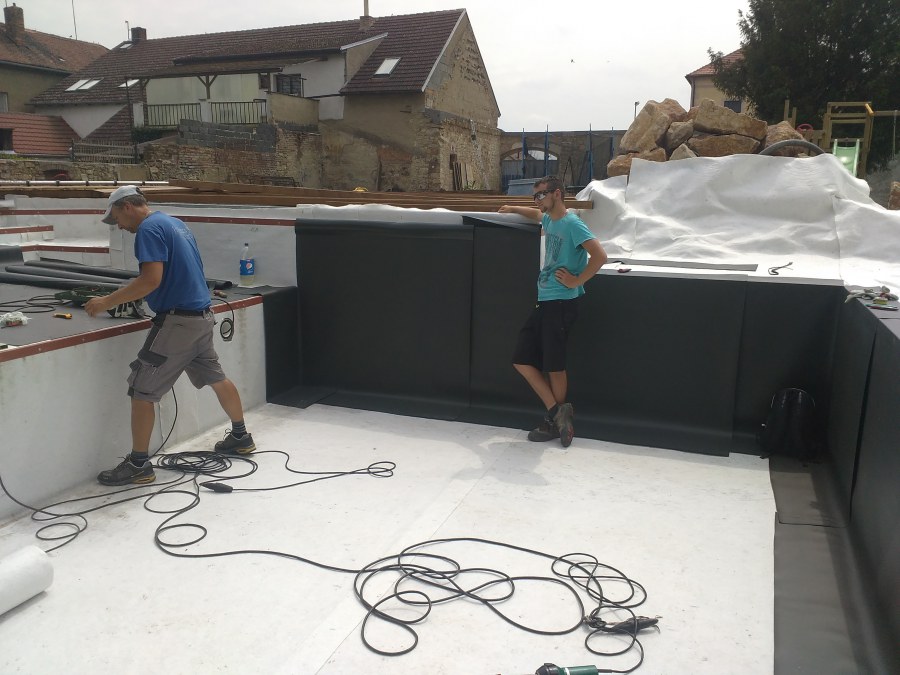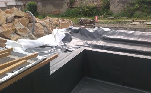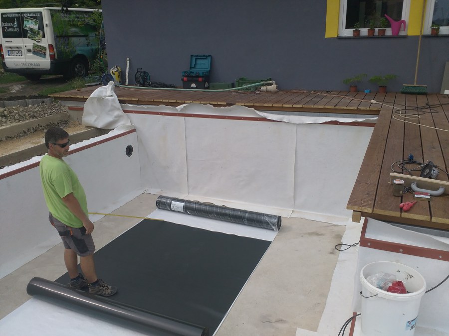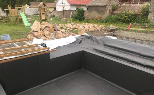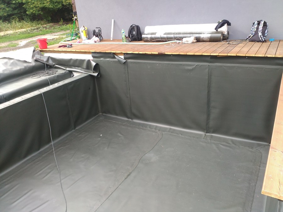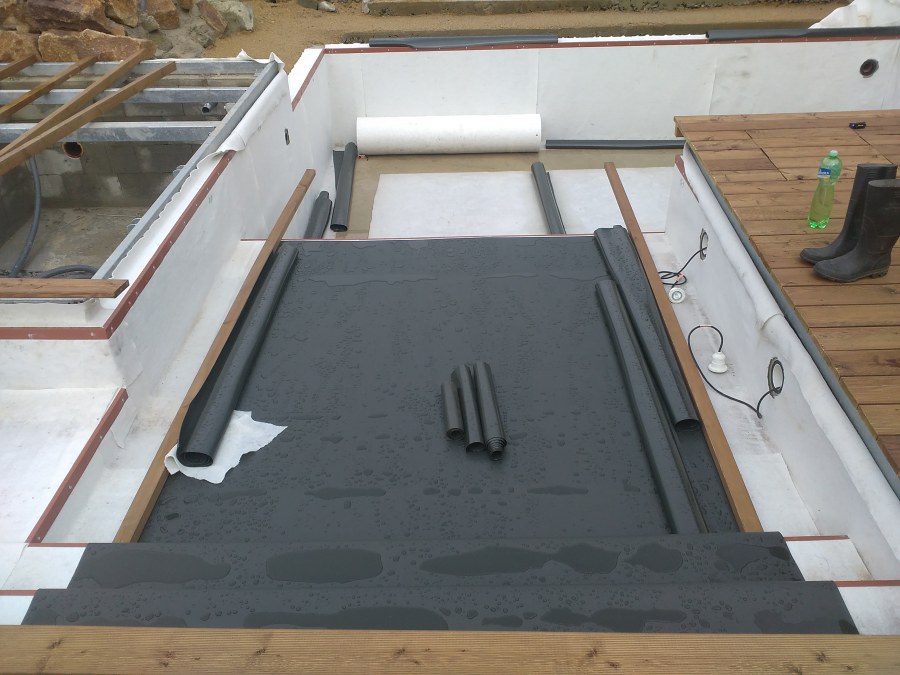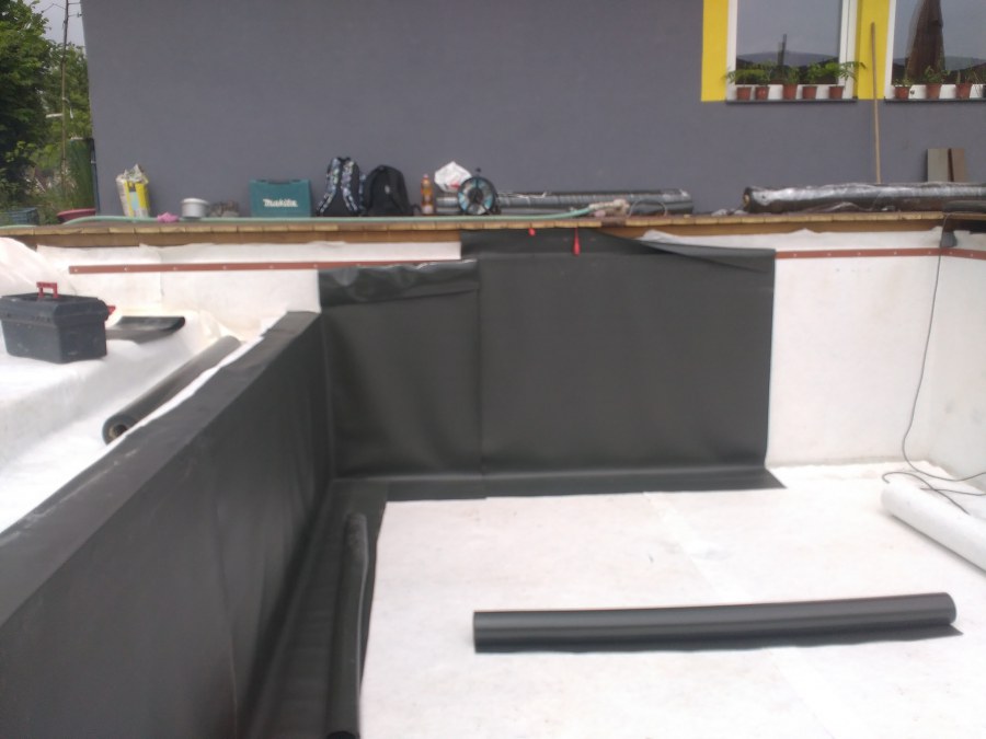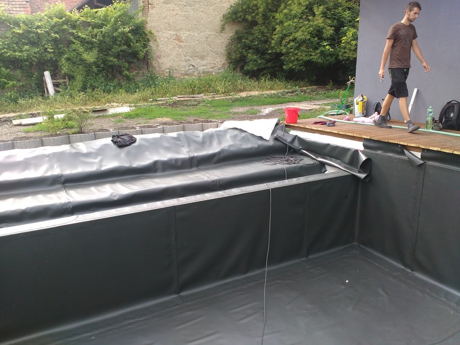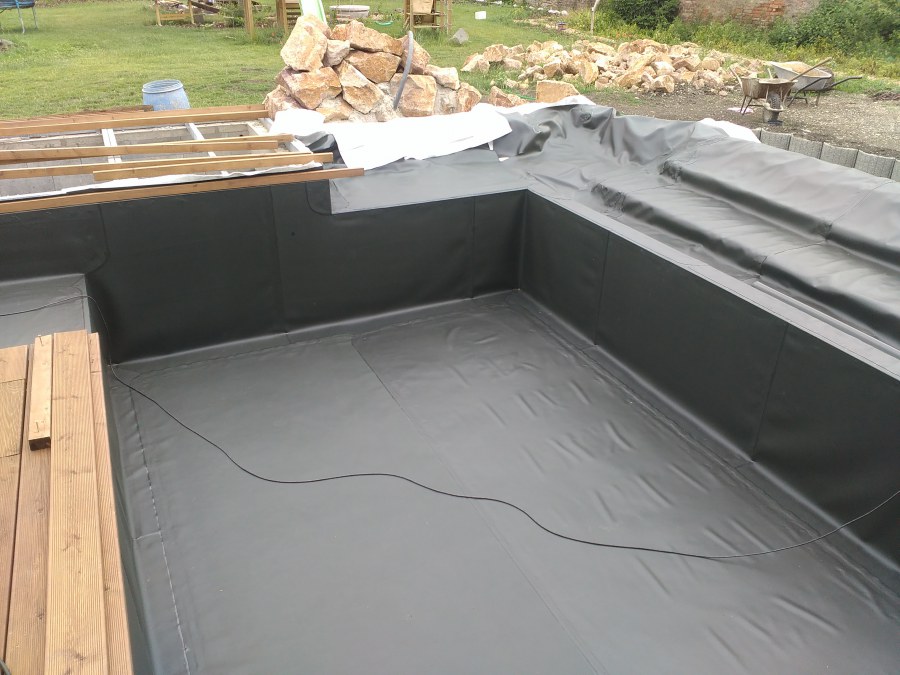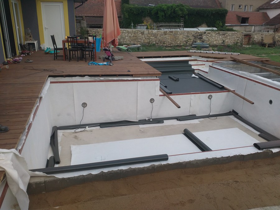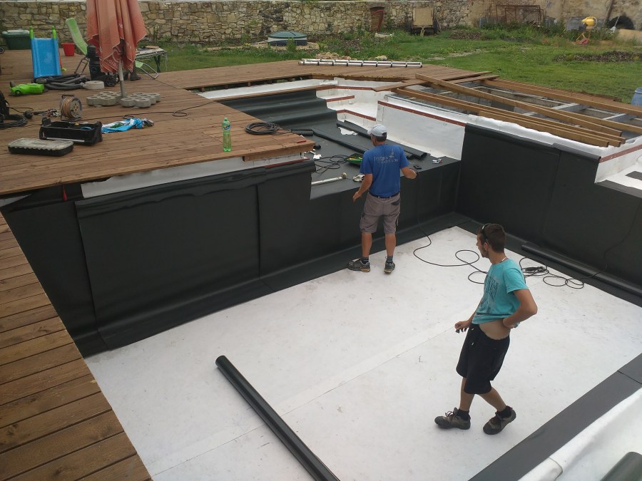 Toto jezírko/bazén pro nás bylo velmi snadné. Klient si připravil vše sám, Vybetonoval stěny a dno jezírka, položil gule a umístil bazénová světla a fóliovou přírubu pro skimmer Oase AquaSkim Gravity. Připravil technickou místnost. Dokonce měl ještě před položením folie připravený základ pro položení terasy. Naši technici mohli jen přijít a položit fólii. Nejdříve museli položit geotextílii 500g poté přivrtat na hrany fóliové lišty a na ně navařit fólii Fatra Aquaplast 805/V olivově zelenou. Do technické místnosti umístili filtr Tripond Vortex Center C115, k němu napojili UV lampu TMC Pro Clean 110W a čerpadlo Oase AquaMax Gravity 20000. Vzduchování do filtru pod média jsme dodali Hailea V-60.