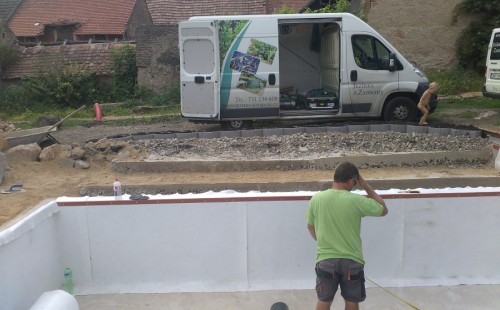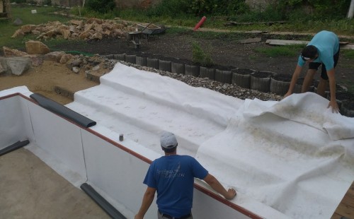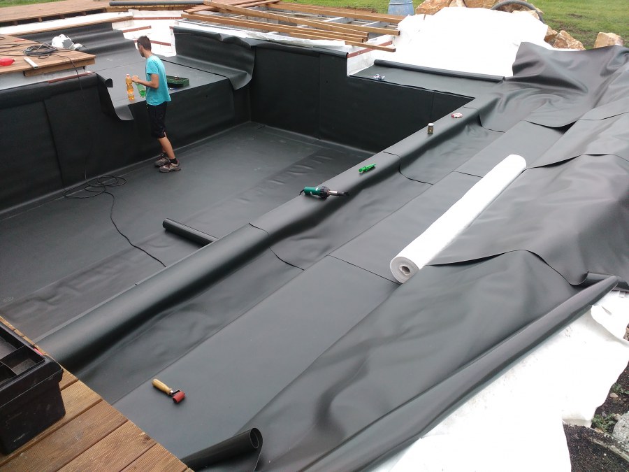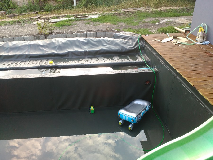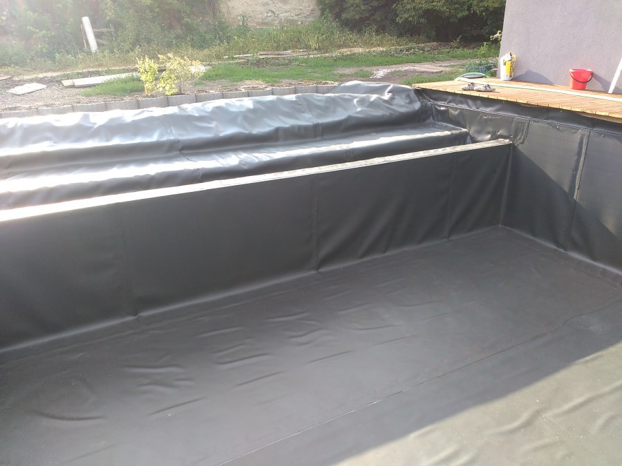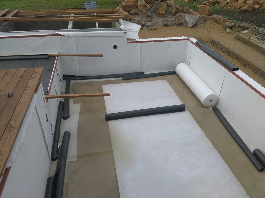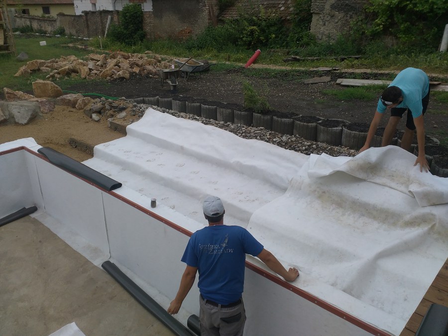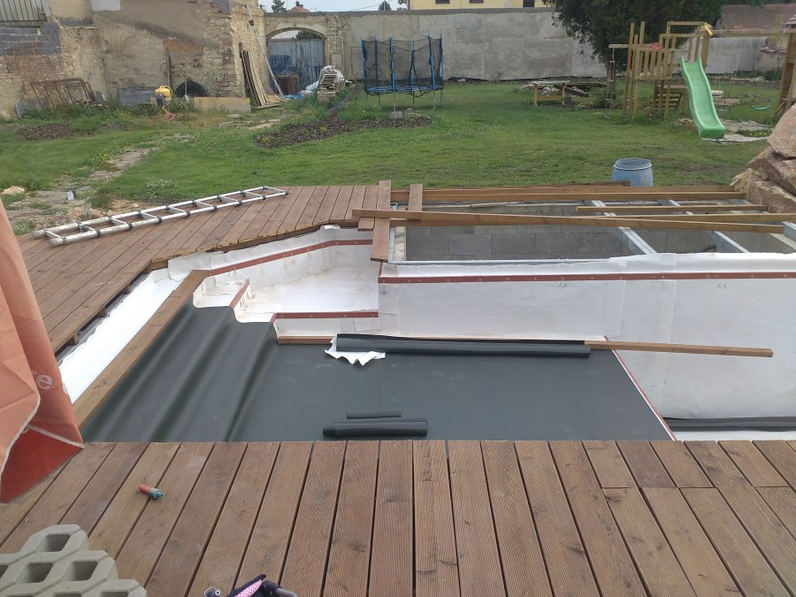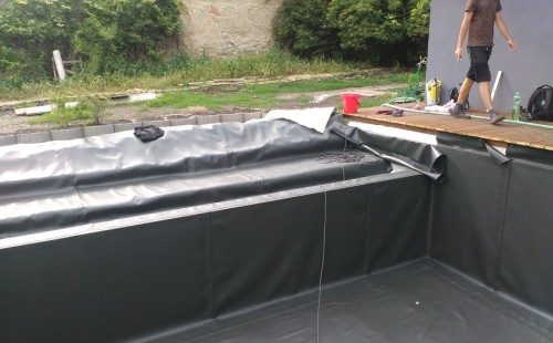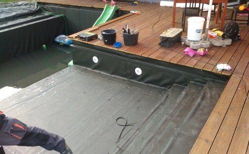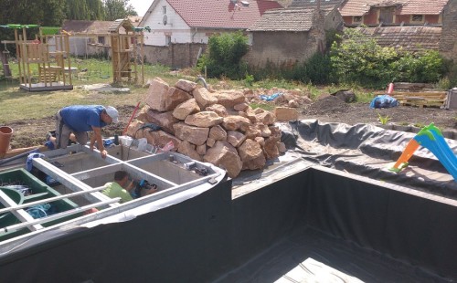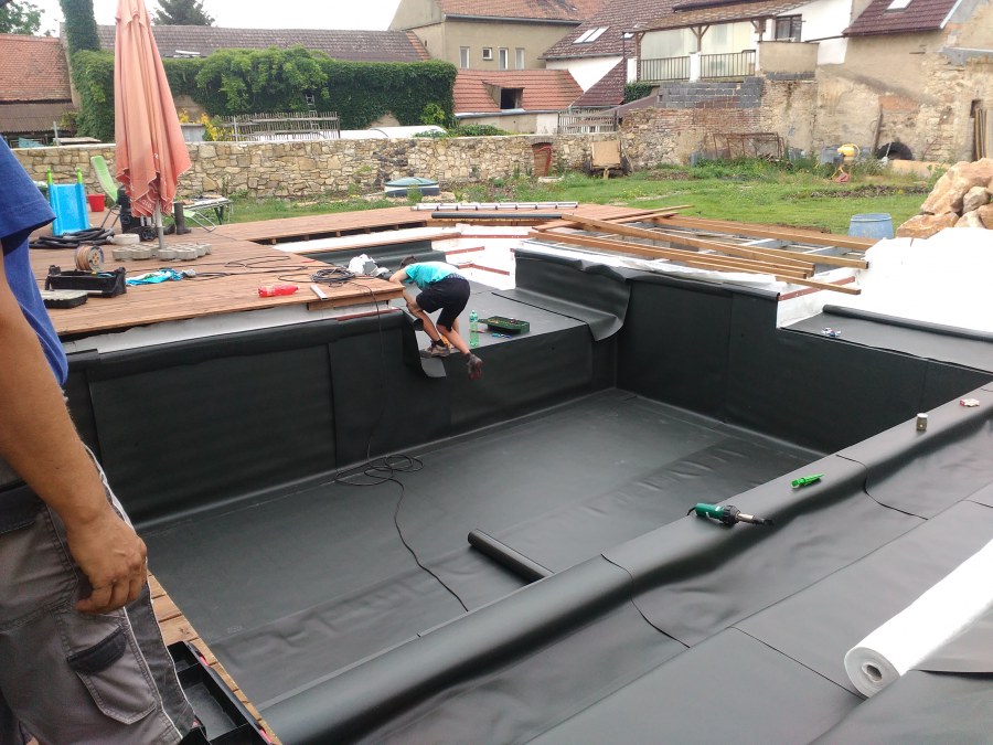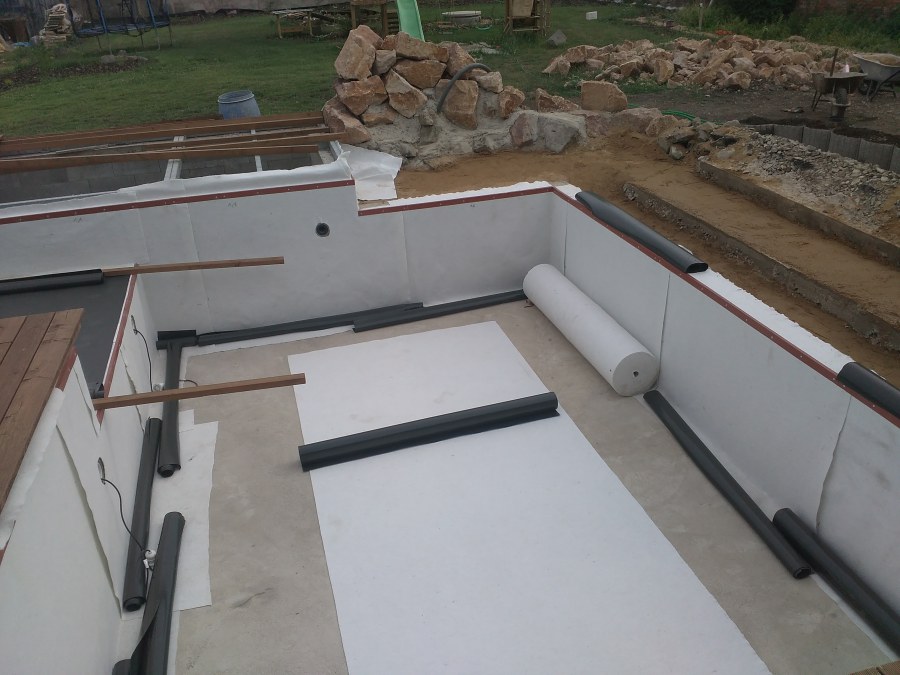 Toto jezírko/bazén pro nás bylo velmi snadné. Klient si připravil vše sám, Vybetonoval stěny a dno jezírka, položil gule a umístil bazénová světla a fóliovou přírubu pro skimmer Oase AquaSkim Gravity. Připravil technickou místnost. Dokonce měl ještě před položením folie připravený základ pro položení terasy. Naši technici mohli jen přijít a položit fólii. Nejdříve museli položit geotextílii 500g poté přivrtat na hrany fóliové lišty a na ně navařit fólii Fatra Aquaplast 805/V olivově zelenou. Do technické místnosti umístili filtr Tripond Vortex Center C115, k němu napojili UV lampu TMC Pro Clean 110W a čerpadlo Oase AquaMax Gravity 20000. Vzduchování do filtru pod média jsme dodali Hailea V-60.