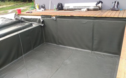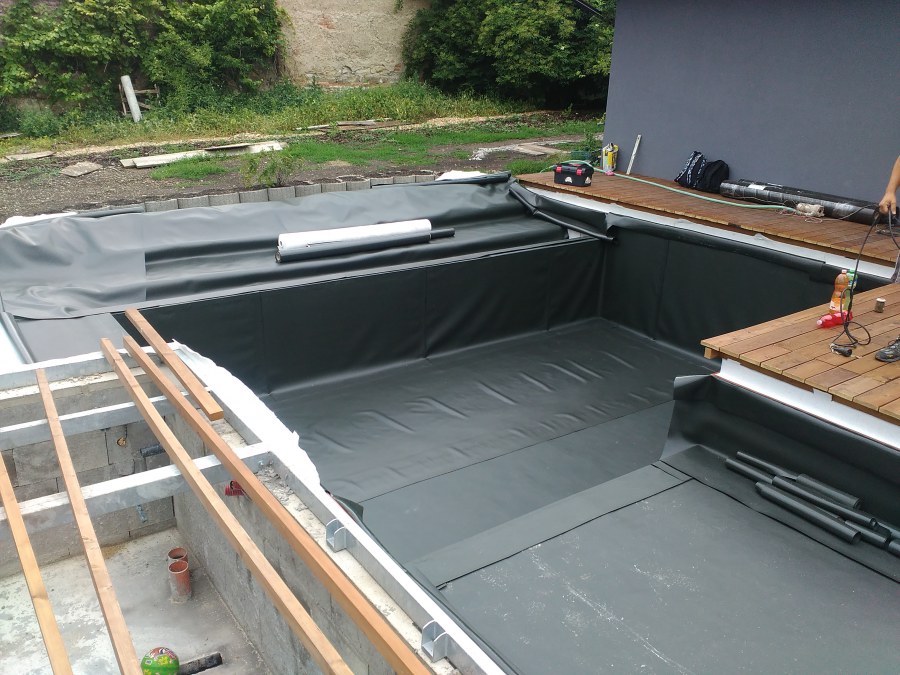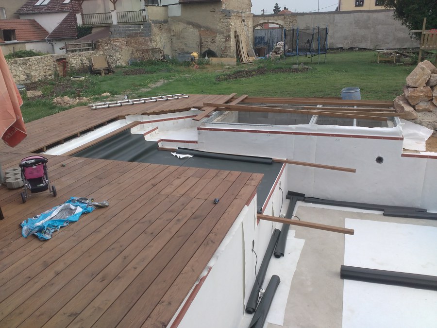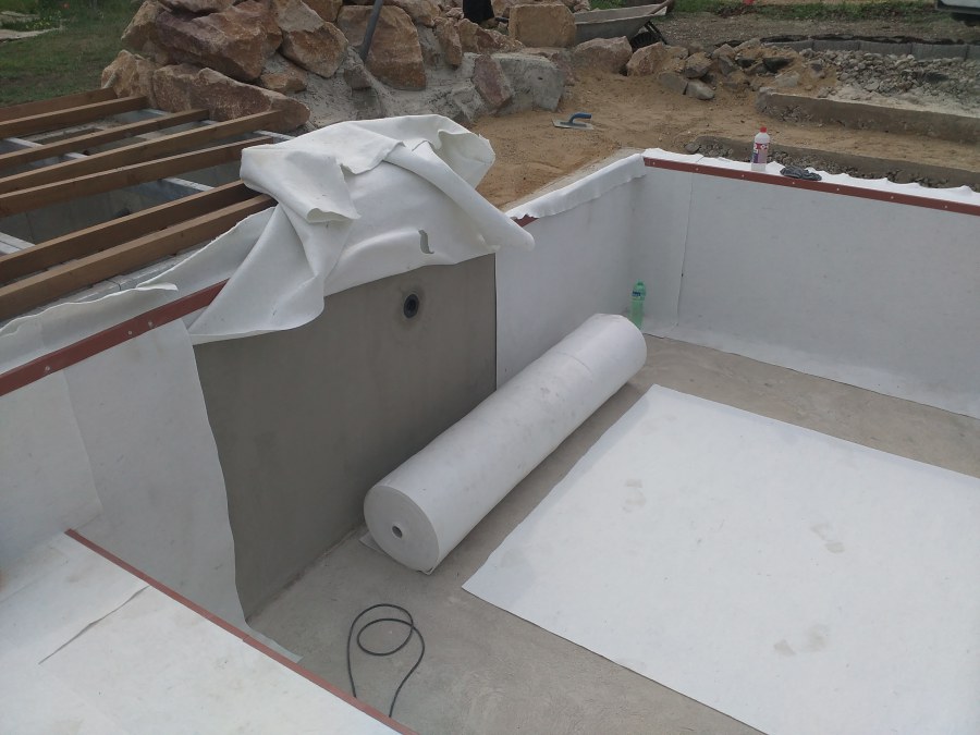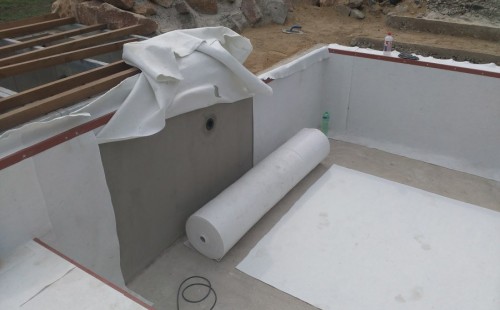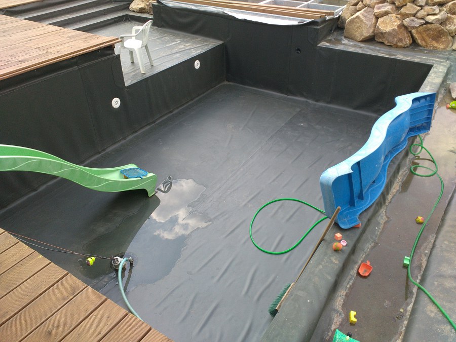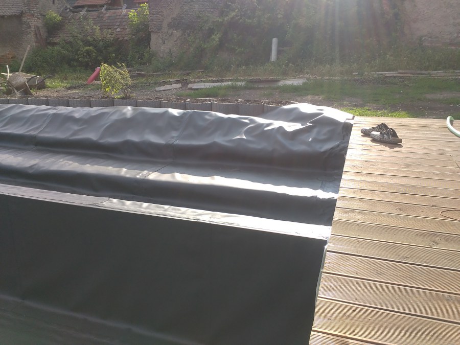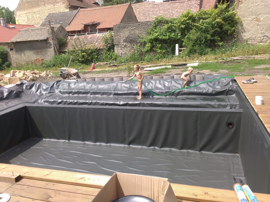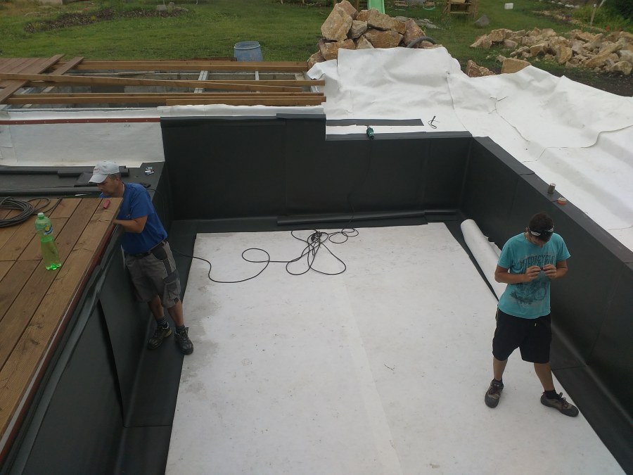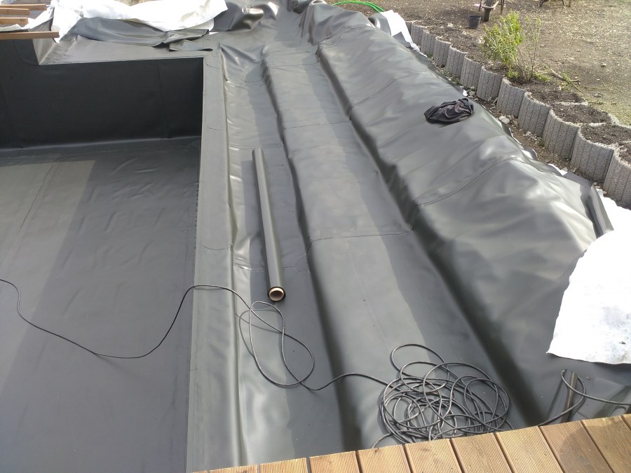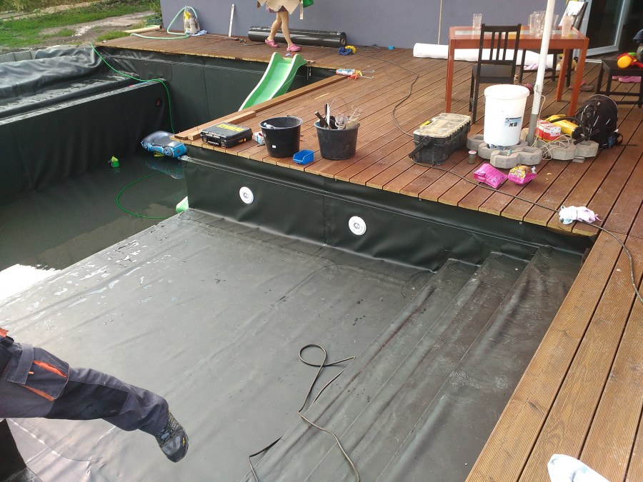 Toto jezírko/bazén pro nás bylo velmi snadné. Klient si připravil vše sám, Vybetonoval stěny a dno jezírka, položil gule a umístil bazénová světla a fóliovou přírubu pro skimmer Oase AquaSkim Gravity. Připravil technickou místnost. Dokonce měl ještě před položením folie připravený základ pro položení terasy. Naši technici mohli jen přijít a položit fólii. Nejdříve museli položit geotextílii 500g poté přivrtat na hrany fóliové lišty a na ně navařit fólii Fatra Aquaplast 805/V olivově zelenou. Do technické místnosti umístili filtr Tripond Vortex Center C115, k němu napojili UV lampu TMC Pro Clean 110W a čerpadlo Oase AquaMax Gravity 20000. Vzduchování do filtru pod média jsme dodali Hailea V-60.