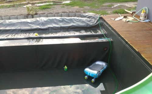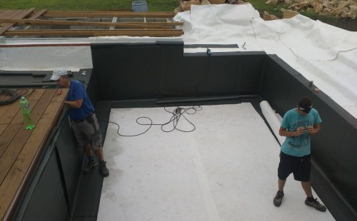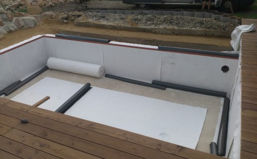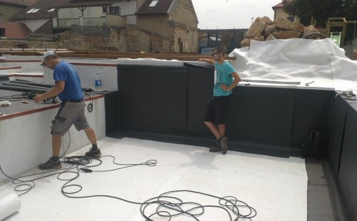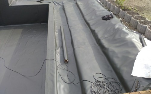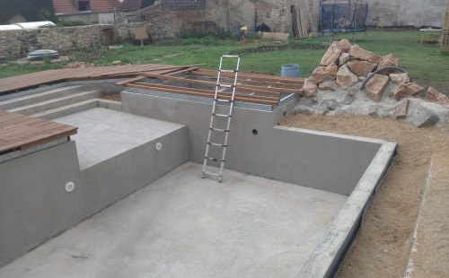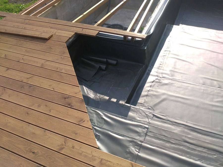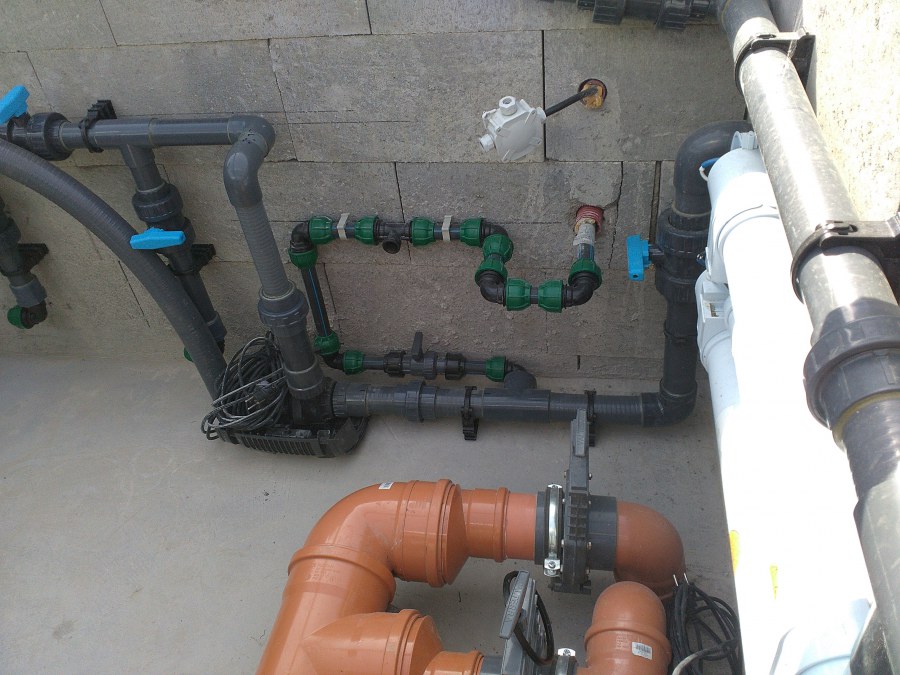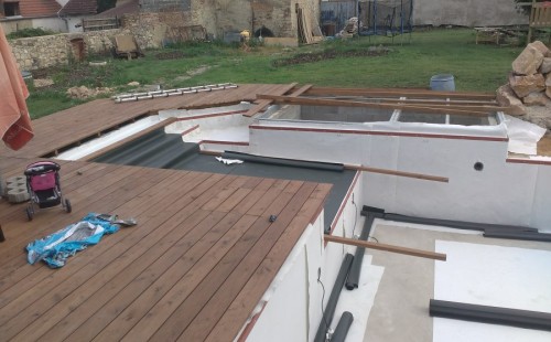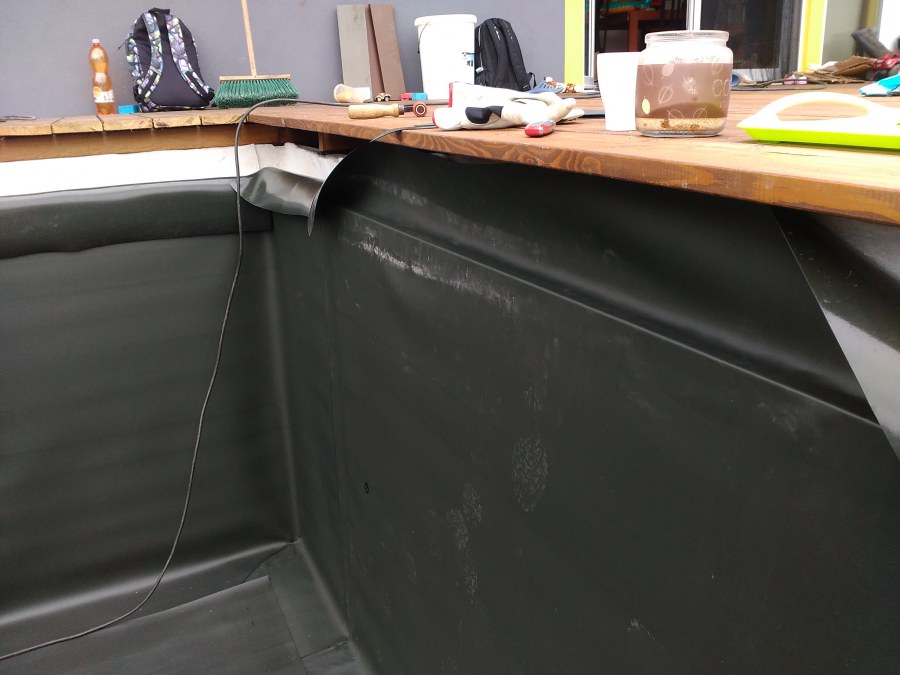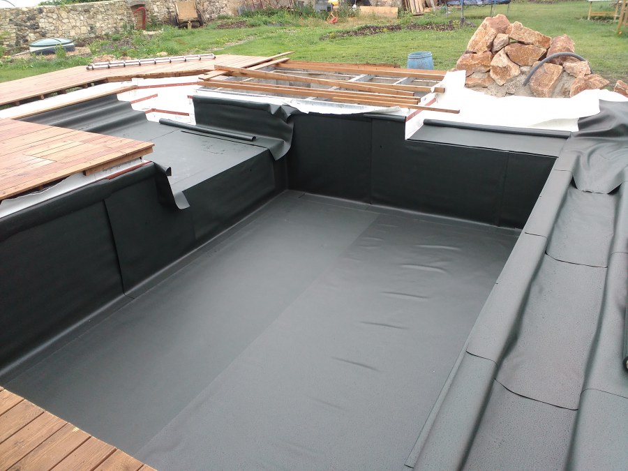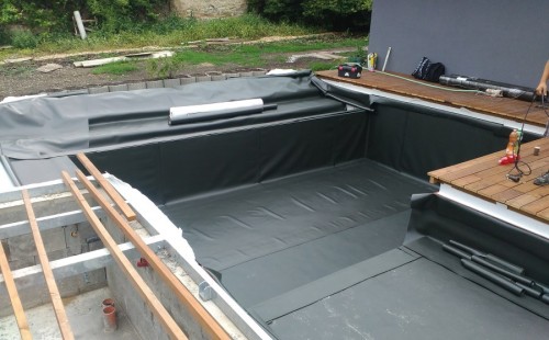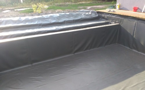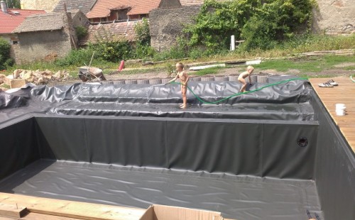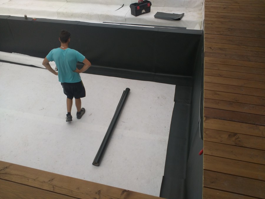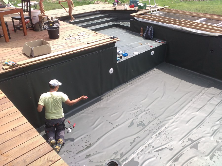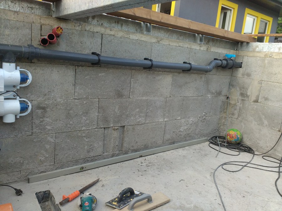 Toto jezírko/bazén pro nás bylo velmi snadné. Klient si připravil vše sám, Vybetonoval stěny a dno jezírka, položil gule a umístil bazénová světla a fóliovou přírubu pro skimmer Oase AquaSkim Gravity. Připravil technickou místnost. Dokonce měl ještě před položením folie připravený základ pro položení terasy. Naši technici mohli jen přijít a položit fólii. Nejdříve museli položit geotextílii 500g poté přivrtat na hrany fóliové lišty a na ně navařit fólii Fatra Aquaplast 805/V olivově zelenou. Do technické místnosti umístili filtr Tripond Vortex Center C115, k němu napojili UV lampu TMC Pro Clean 110W a čerpadlo Oase AquaMax Gravity 20000. Vzduchování do filtru pod média jsme dodali Hailea V-60.