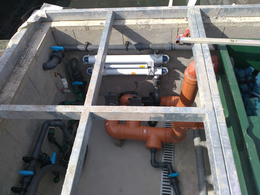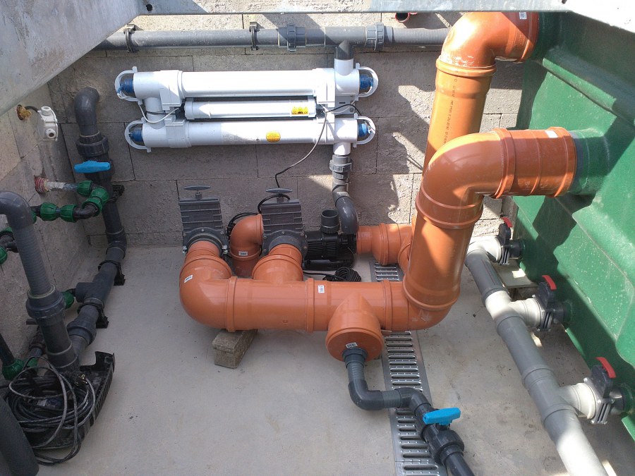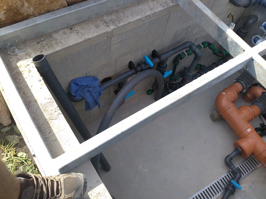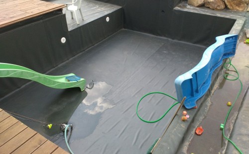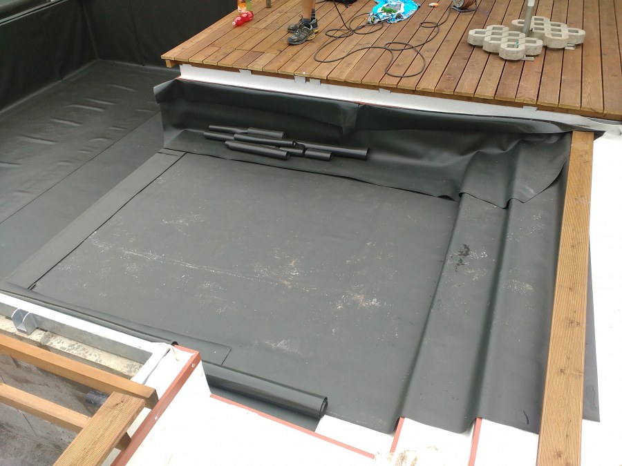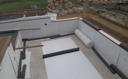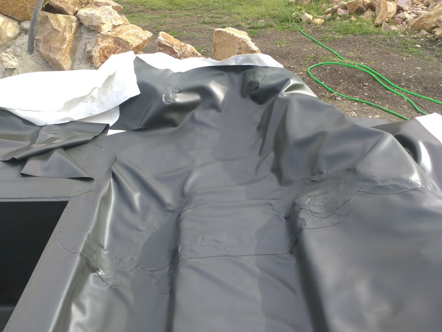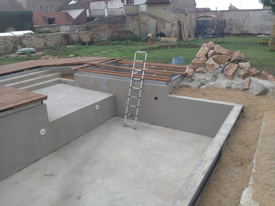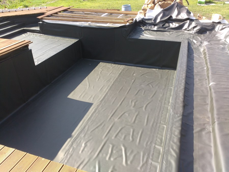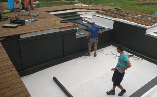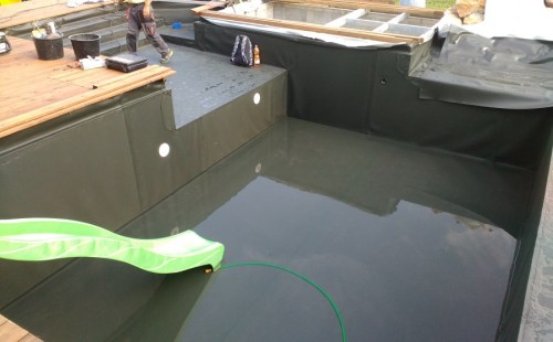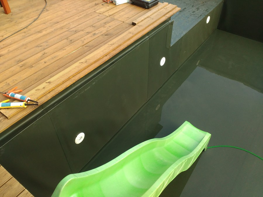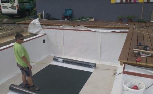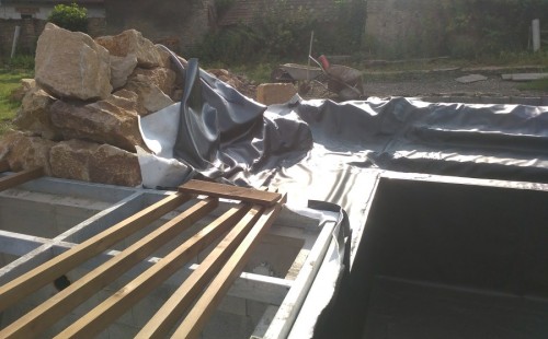 Toto jezírko/bazén pro nás bylo velmi snadné. Klient si připravil vše sám, Vybetonoval stěny a dno jezírka, položil gule a umístil bazénová světla a fóliovou přírubu pro skimmer Oase AquaSkim Gravity. Připravil technickou místnost. Dokonce měl ještě před položením folie připravený základ pro položení terasy. Naši technici mohli jen přijít a položit fólii. Nejdříve museli položit geotextílii 500g poté přivrtat na hrany fóliové lišty a na ně navařit fólii Fatra Aquaplast 805/V olivově zelenou. Do technické místnosti umístili filtr Tripond Vortex Center C115, k němu napojili UV lampu TMC Pro Clean 110W a čerpadlo Oase AquaMax Gravity 20000. Vzduchování do filtru pod média jsme dodali Hailea V-60.