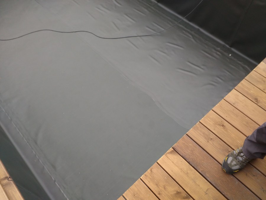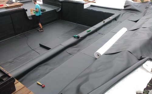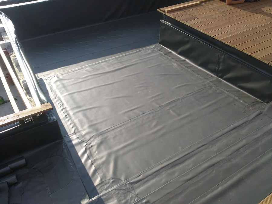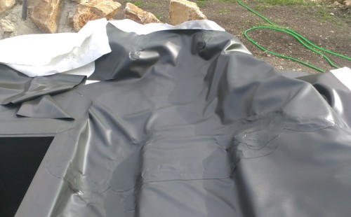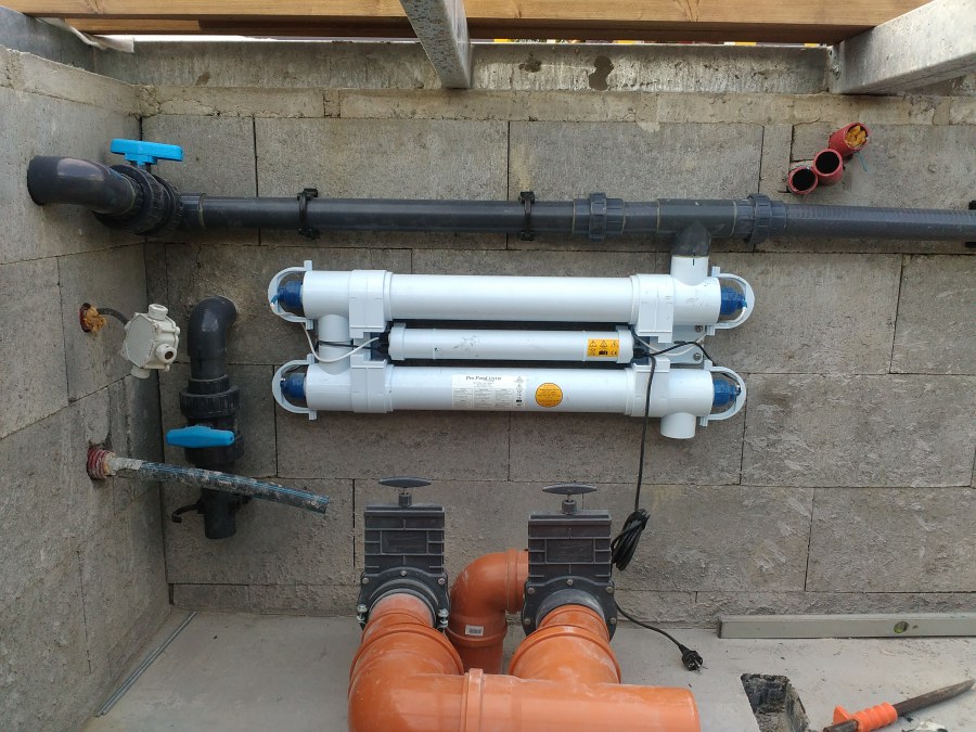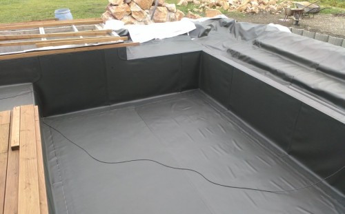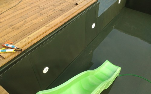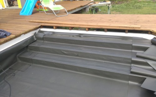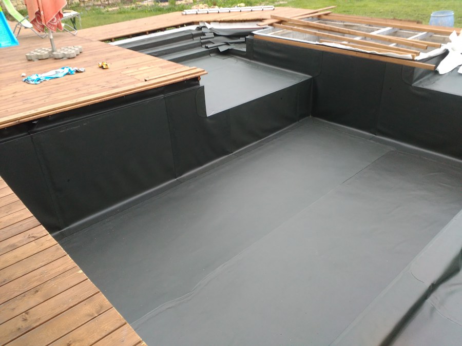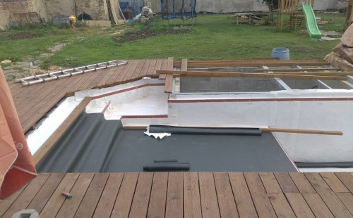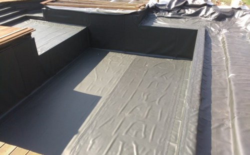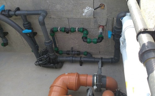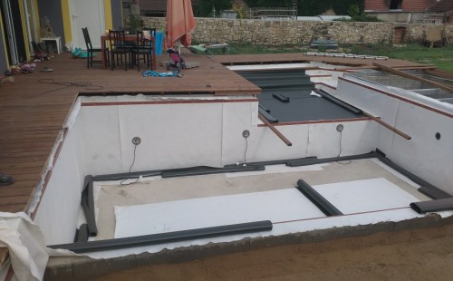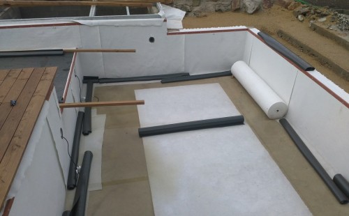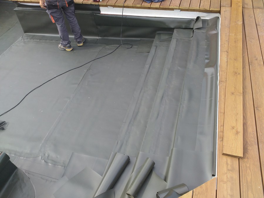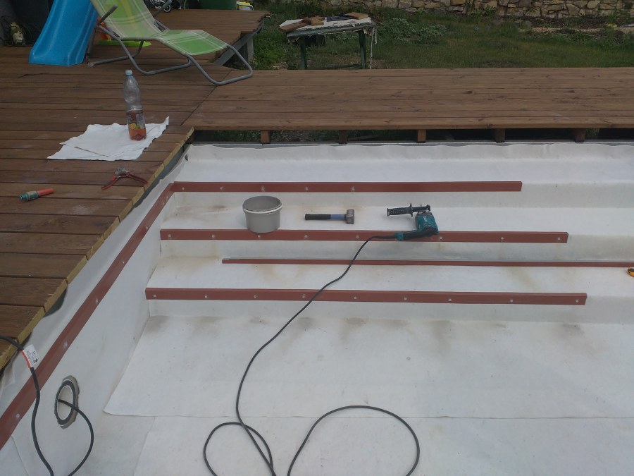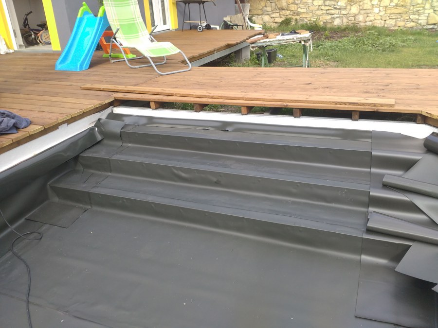 Toto jezírko/bazén pro nás bylo velmi snadné. Klient si připravil vše sám, Vybetonoval stěny a dno jezírka, položil gule a umístil bazénová světla a fóliovou přírubu pro skimmer Oase AquaSkim Gravity. Připravil technickou místnost. Dokonce měl ještě před položením folie připravený základ pro položení terasy. Naši technici mohli jen přijít a položit fólii. Nejdříve museli položit geotextílii 500g poté přivrtat na hrany fóliové lišty a na ně navařit fólii Fatra Aquaplast 805/V olivově zelenou. Do technické místnosti umístili filtr Tripond Vortex Center C115, k němu napojili UV lampu TMC Pro Clean 110W a čerpadlo Oase AquaMax Gravity 20000. Vzduchování do filtru pod média jsme dodali Hailea V-60.