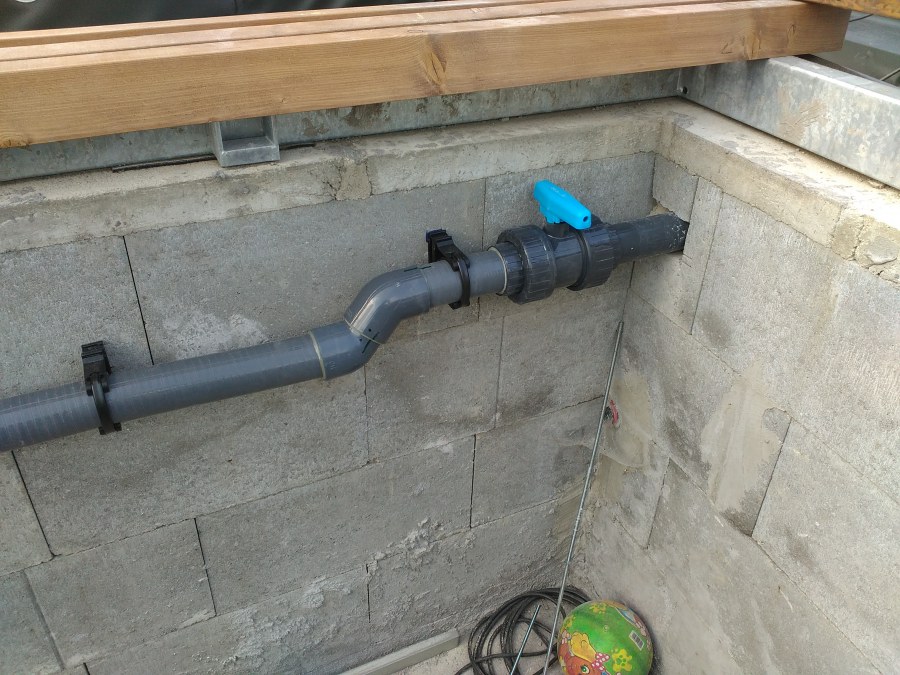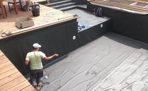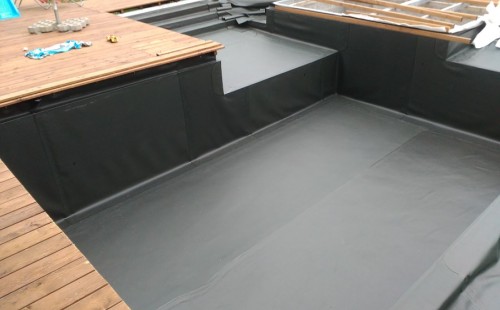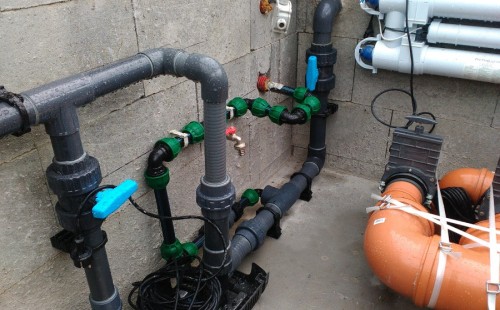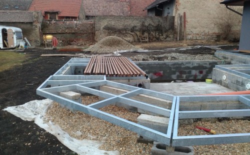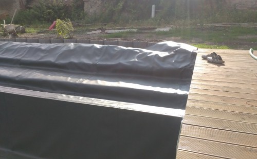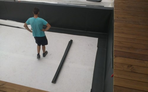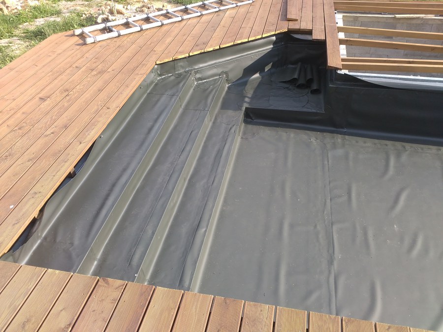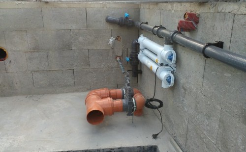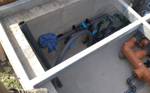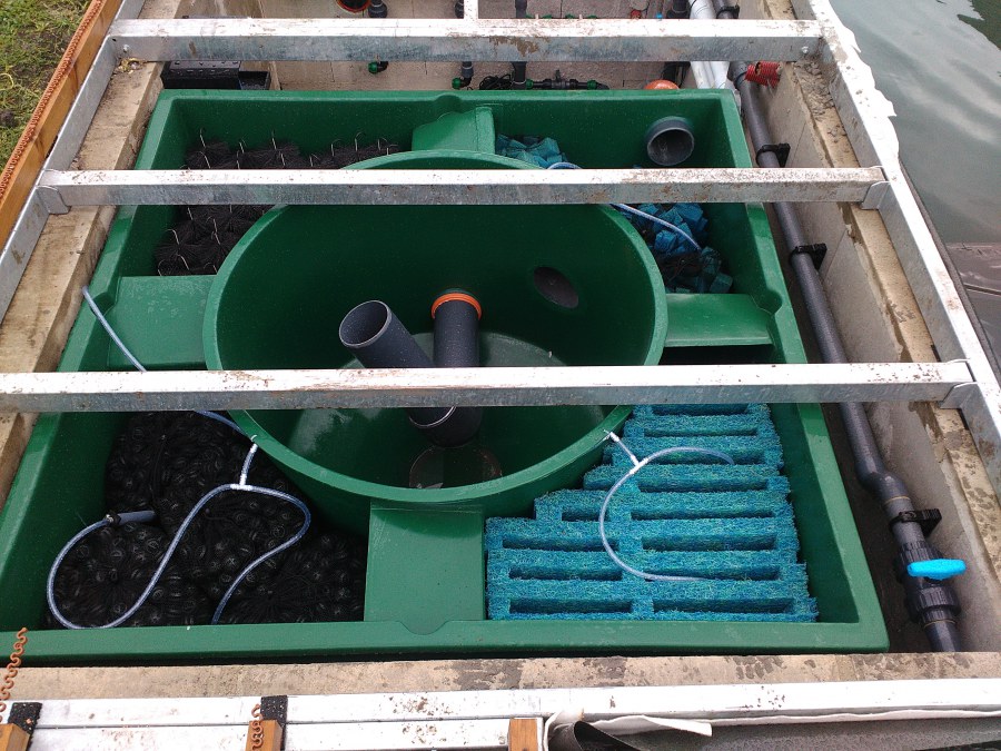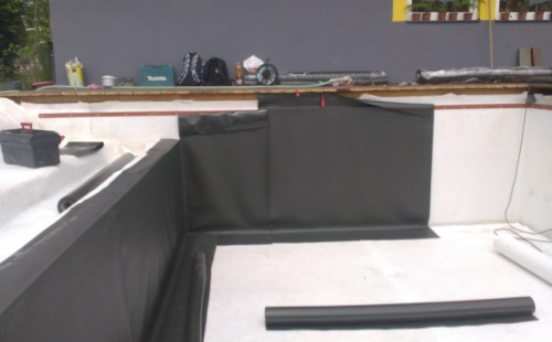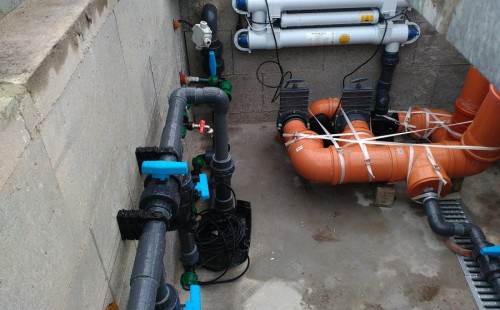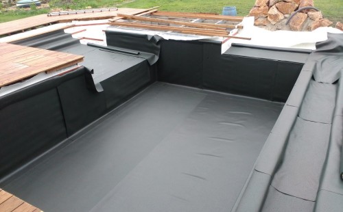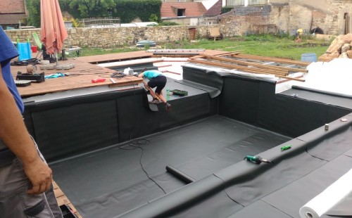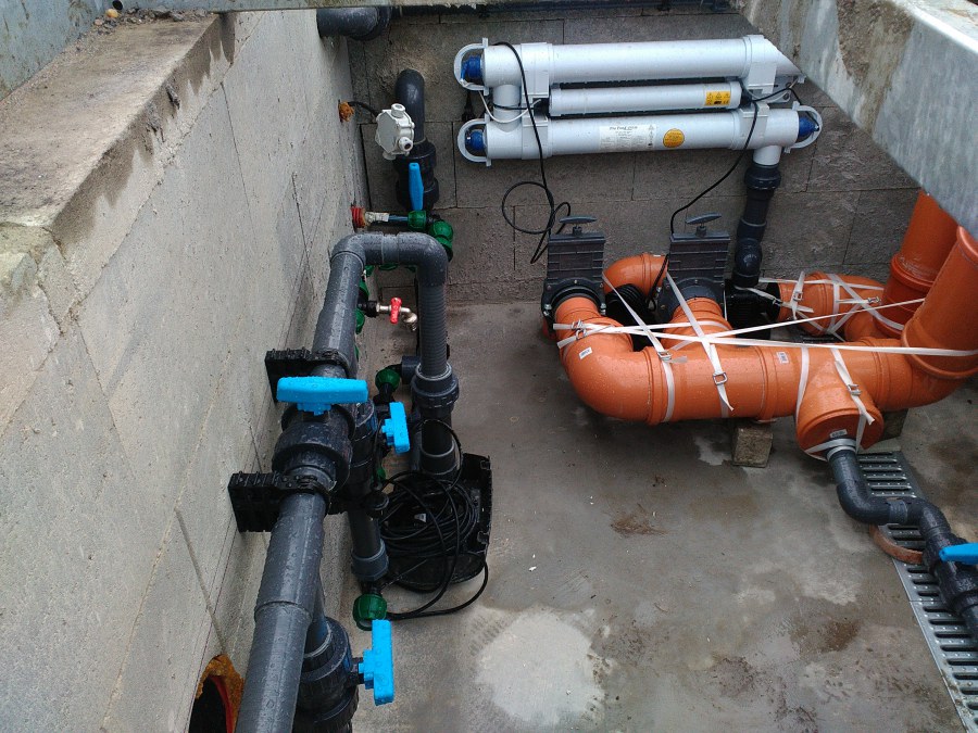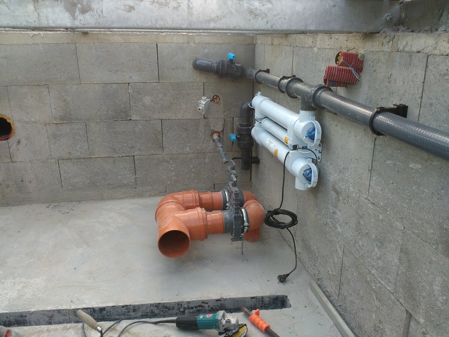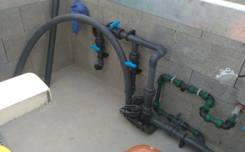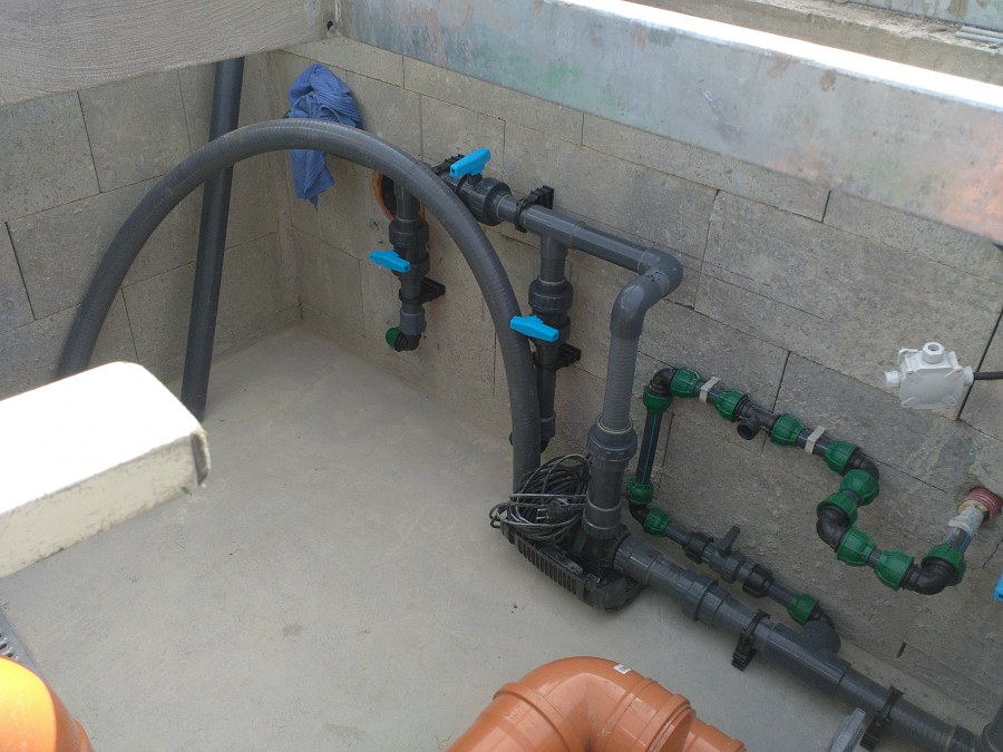 Toto jezírko/bazén pro nás bylo velmi snadné. Klient si připravil vše sám, Vybetonoval stěny a dno jezírka, položil gule a umístil bazénová světla a fóliovou přírubu pro skimmer Oase AquaSkim Gravity. Připravil technickou místnost. Dokonce měl ještě před položením folie připravený základ pro položení terasy. Naši technici mohli jen přijít a položit fólii. Nejdříve museli položit geotextílii 500g poté přivrtat na hrany fóliové lišty a na ně navařit fólii Fatra Aquaplast 805/V olivově zelenou. Do technické místnosti umístili filtr Tripond Vortex Center C115, k němu napojili UV lampu TMC Pro Clean 110W a čerpadlo Oase AquaMax Gravity 20000. Vzduchování do filtru pod média jsme dodali Hailea V-60.
