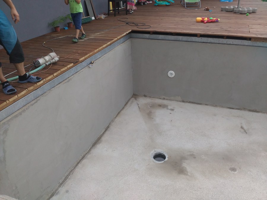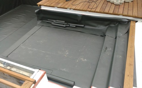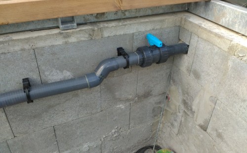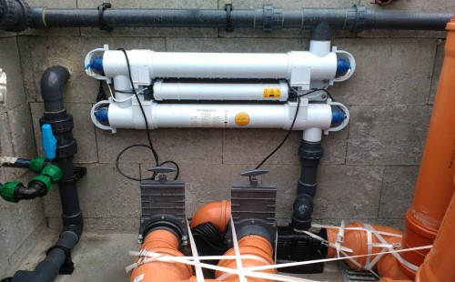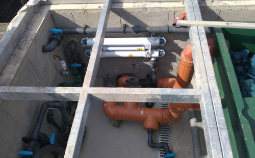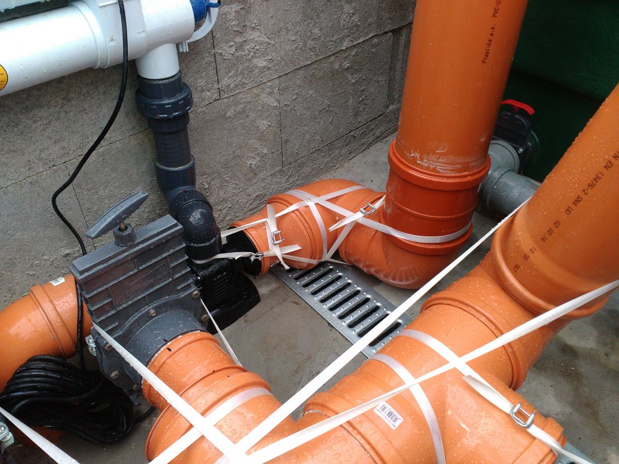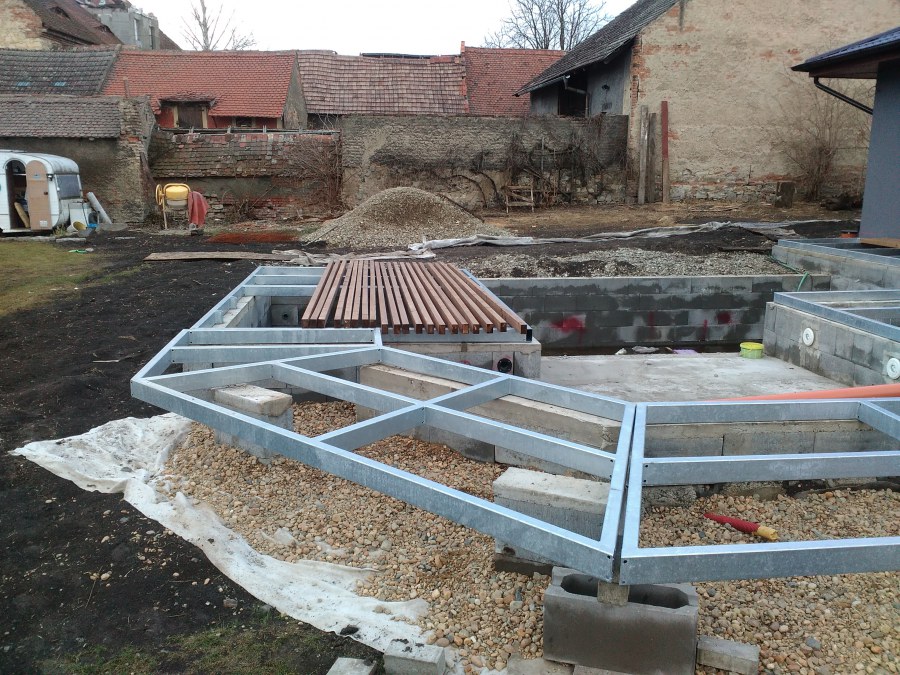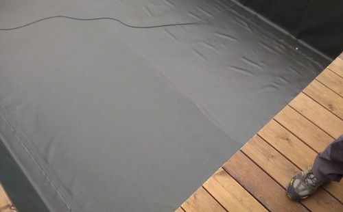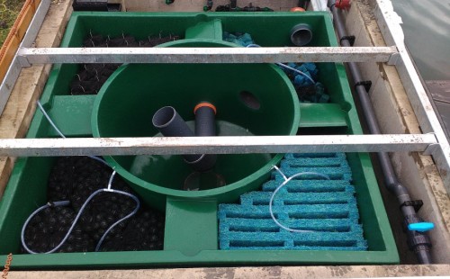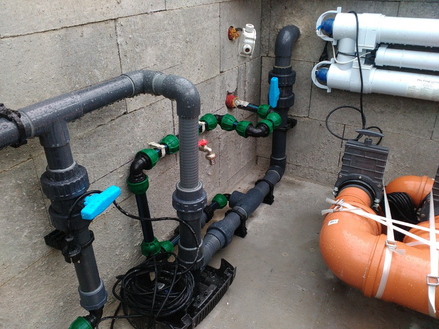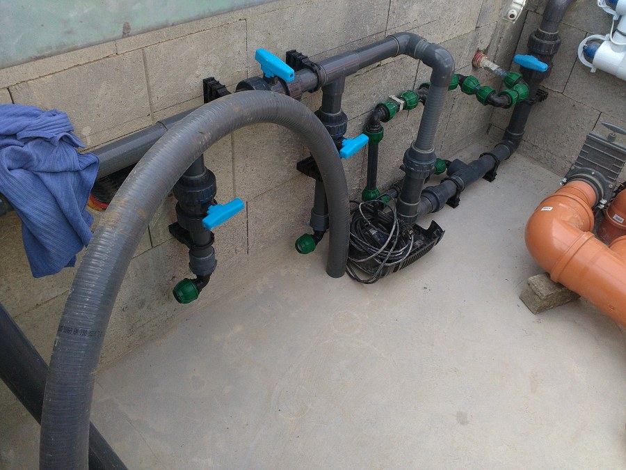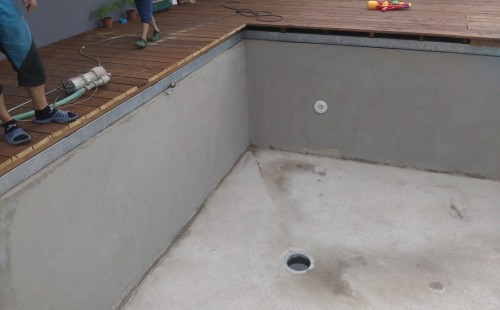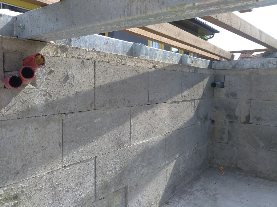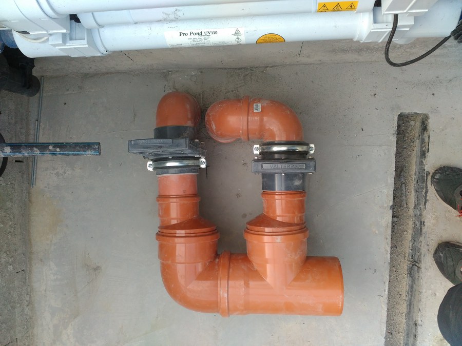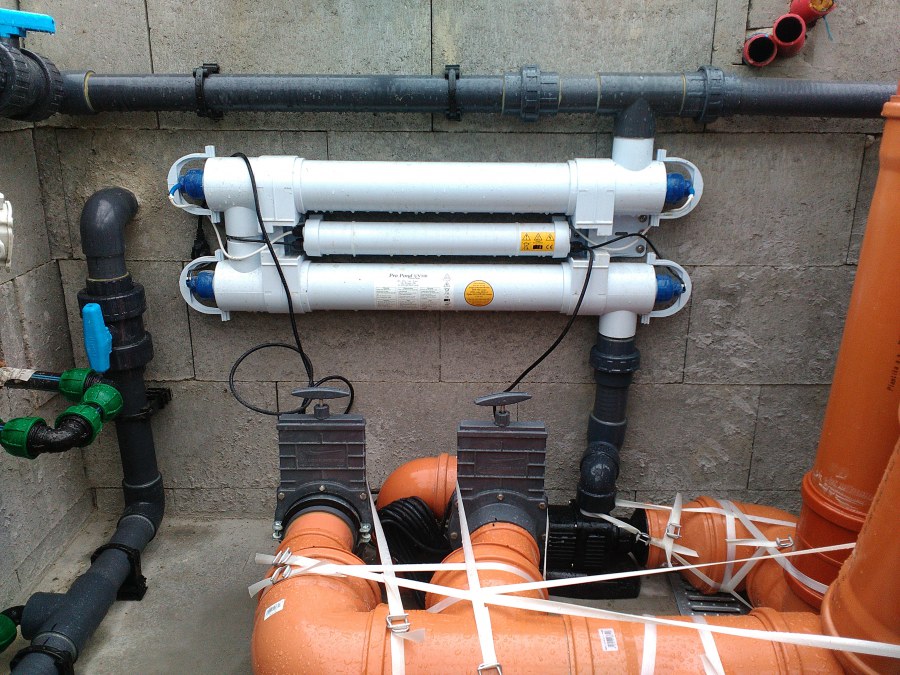 Toto jezírko/bazén pro nás bylo velmi snadné. Klient si připravil vše sám, Vybetonoval stěny a dno jezírka, položil gule a umístil bazénová světla a fóliovou přírubu pro skimmer Oase AquaSkim Gravity. Připravil technickou místnost. Dokonce měl ještě před položením folie připravený základ pro položení terasy. Naši technici mohli jen přijít a položit fólii. Nejdříve museli položit geotextílii 500g poté přivrtat na hrany fóliové lišty a na ně navařit fólii Fatra Aquaplast 805/V olivově zelenou. Do technické místnosti umístili filtr Tripond Vortex Center C115, k němu napojili UV lampu TMC Pro Clean 110W a čerpadlo Oase AquaMax Gravity 20000. Vzduchování do filtru pod média jsme dodali Hailea V-60.