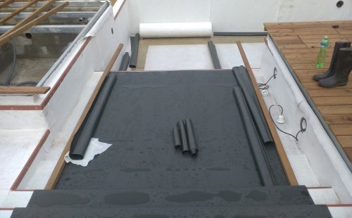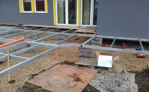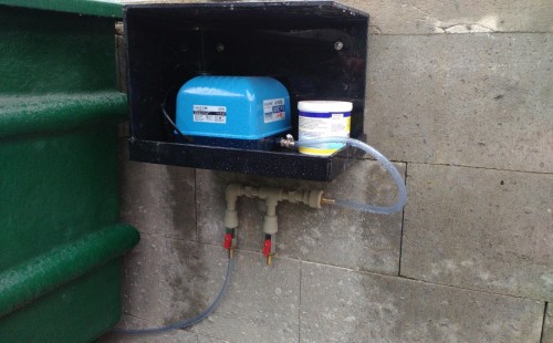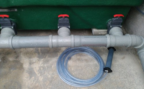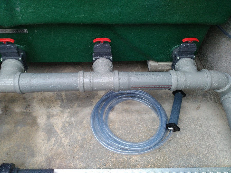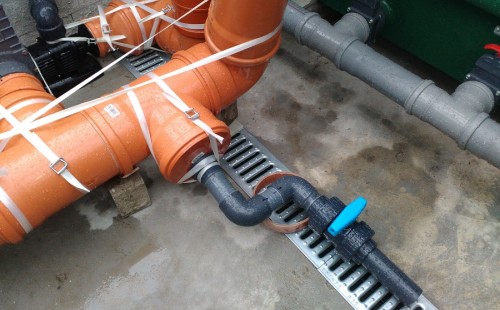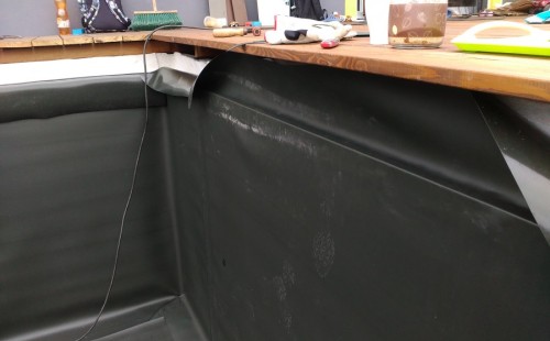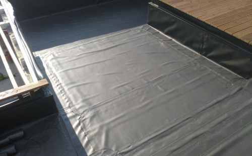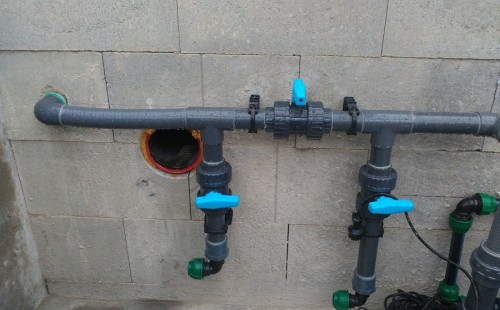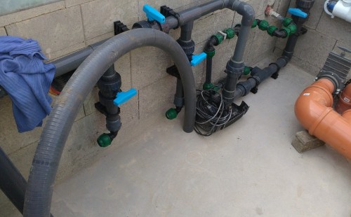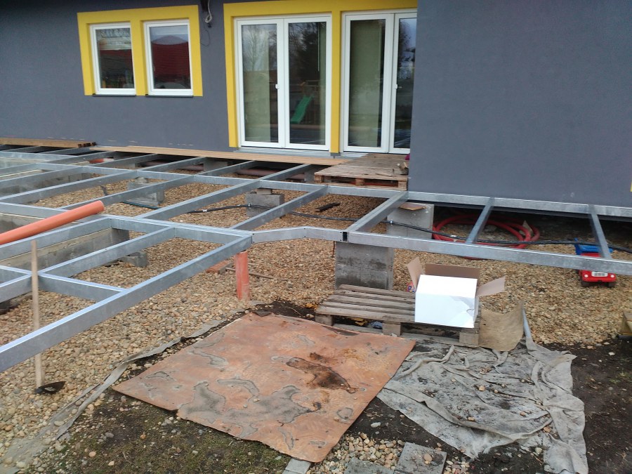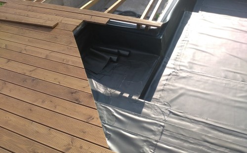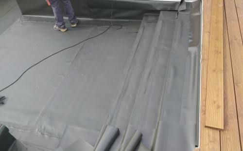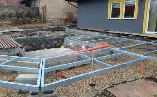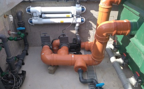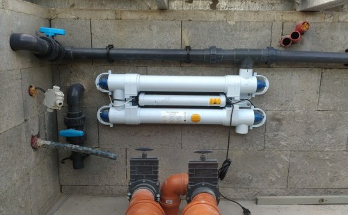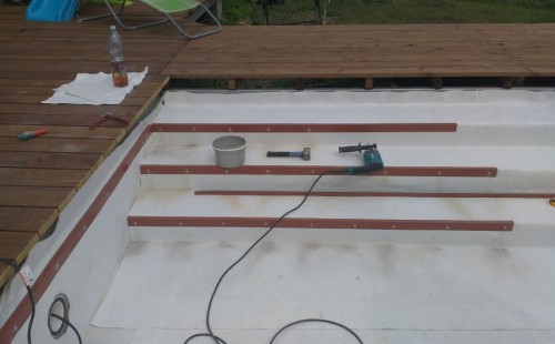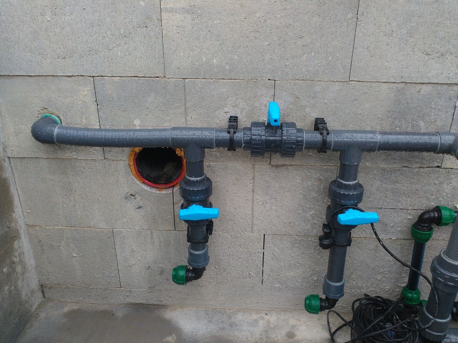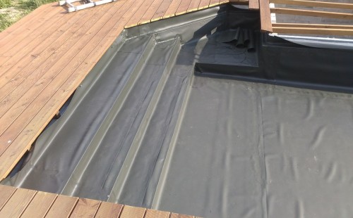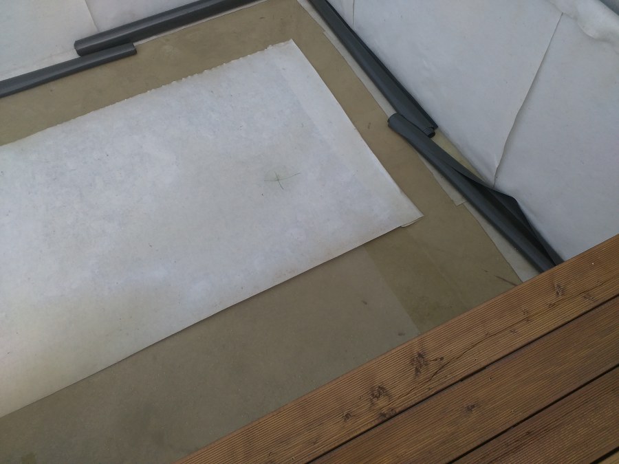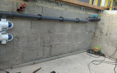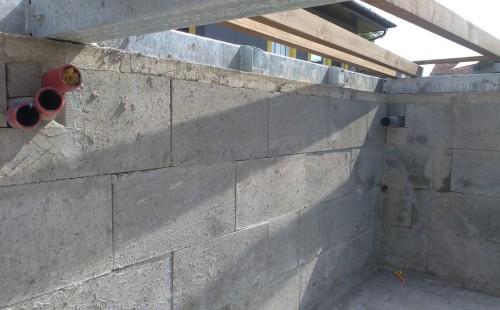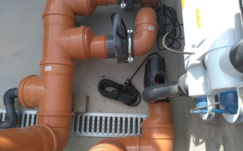 Toto jezírko/bazén pro nás bylo velmi snadné. Klient si připravil vše sám, Vybetonoval stěny a dno jezírka, položil gule a umístil bazénová světla a fóliovou přírubu pro skimmer Oase AquaSkim Gravity. Připravil technickou místnost. Dokonce měl ještě před položením folie připravený základ pro položení terasy. Naši technici mohli jen přijít a položit fólii. Nejdříve museli položit geotextílii 500g poté přivrtat na hrany fóliové lišty a na ně navařit fólii Fatra Aquaplast 805/V olivově zelenou. Do technické místnosti umístili filtr Tripond Vortex Center C115, k němu napojili UV lampu TMC Pro Clean 110W a čerpadlo Oase AquaMax Gravity 20000. Vzduchování do filtru pod média jsme dodali Hailea V-60.