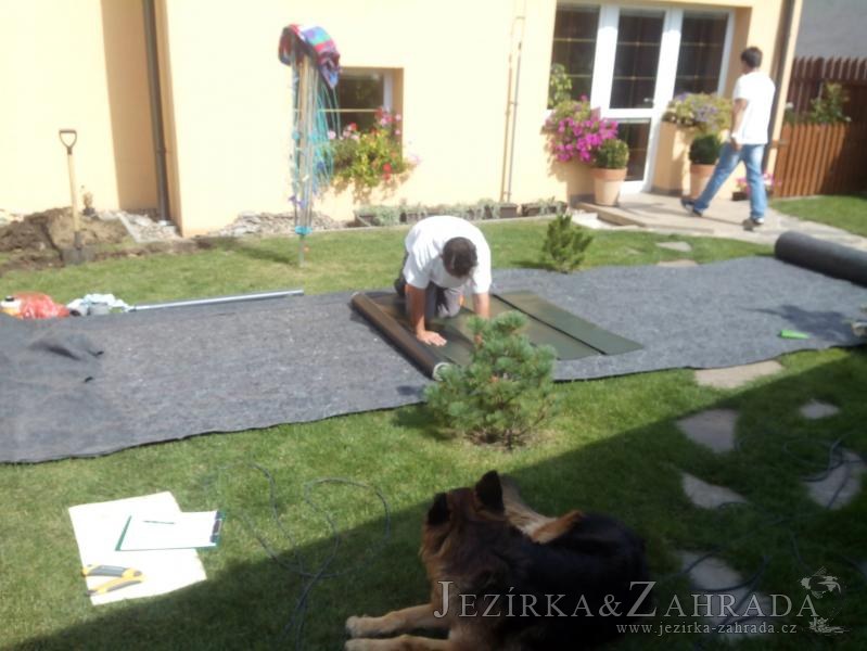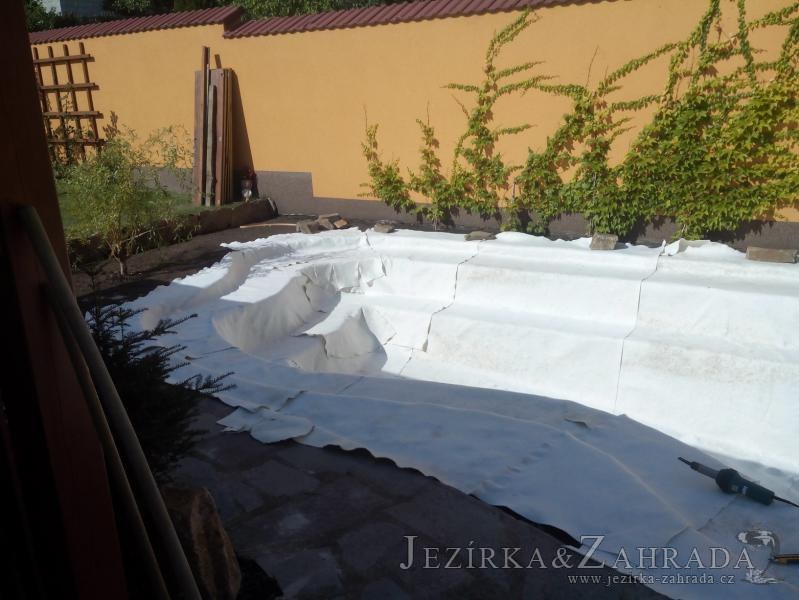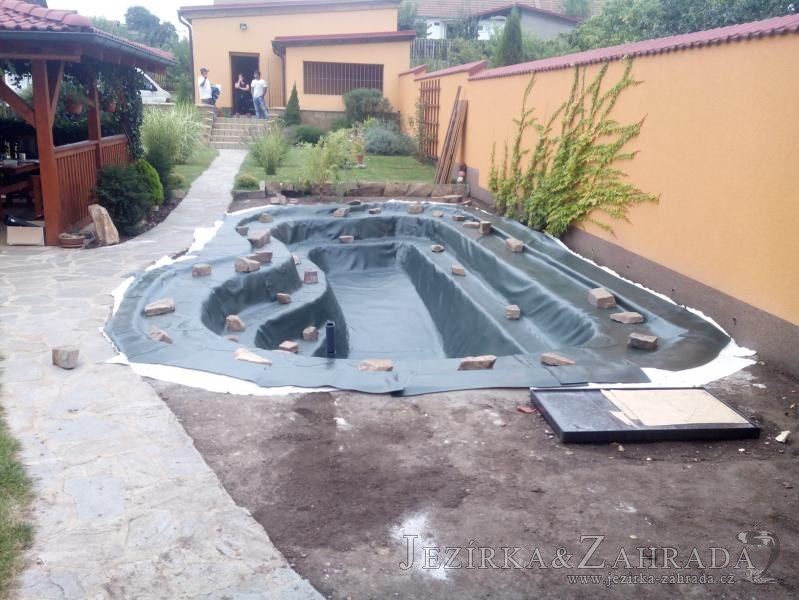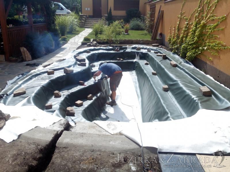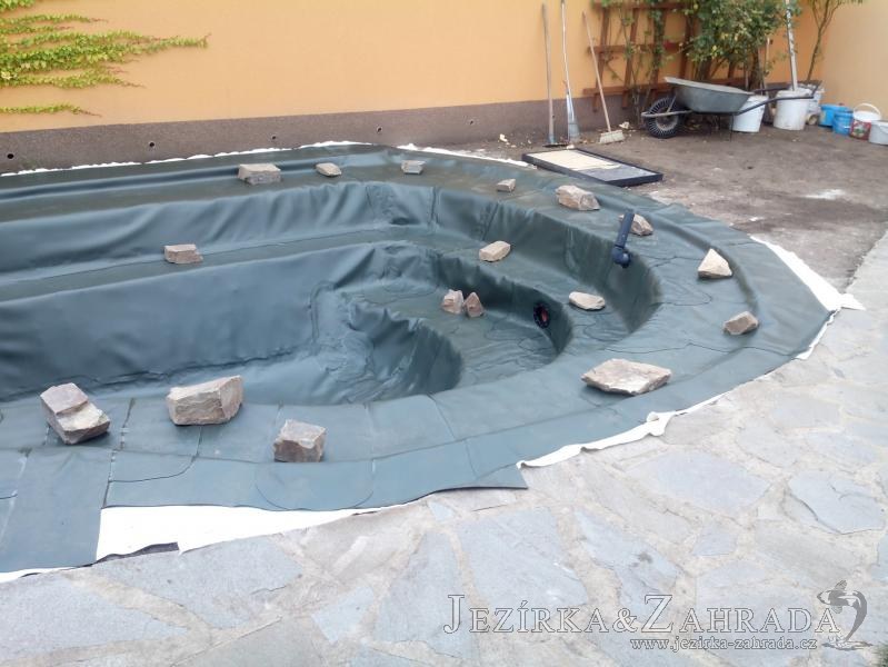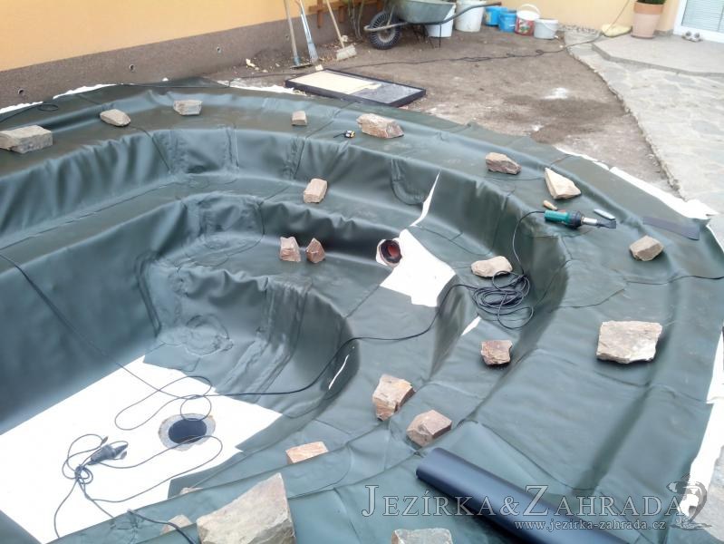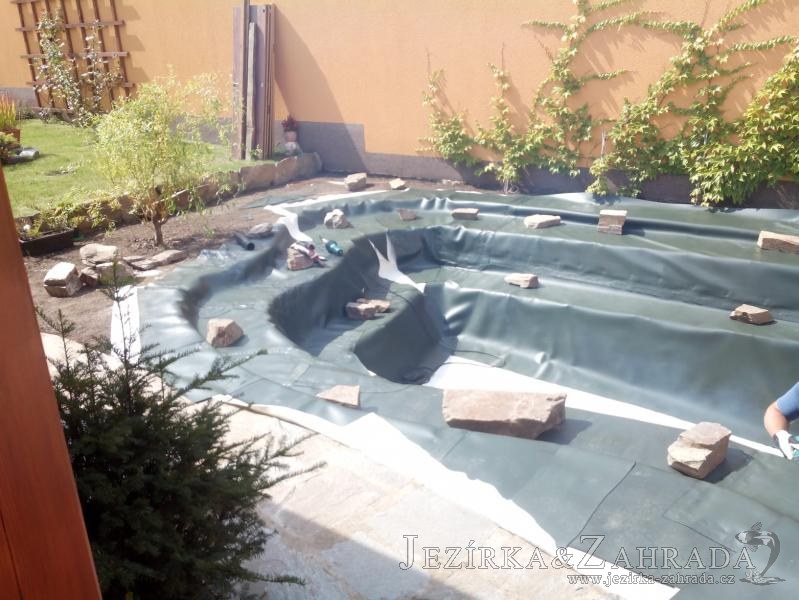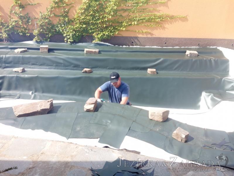 Zákazník si dle našich představ připravil jezírko a požádal nás o vyfóliování okrasného jezírka v Březně u Chomutova. Nejprve se připravilo připojení na technologii a po malých úpravách (vypískování) se položila geoxtílie 500g/m2. Následně se začala na míru svařovat fólie Fatra Aquaplast 805 1,5mm olivově zelená. Bylo použito větší množství záplat, aby se zabránilo úniku vody ve sváru. Kameny a kačírek si klient zajišťoval následně sám.