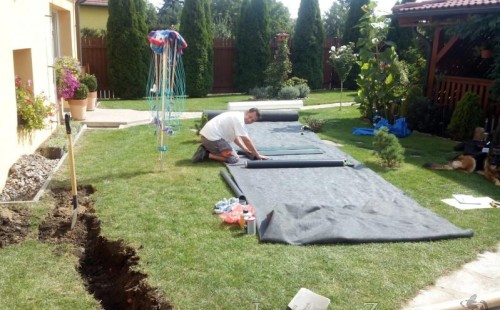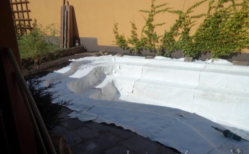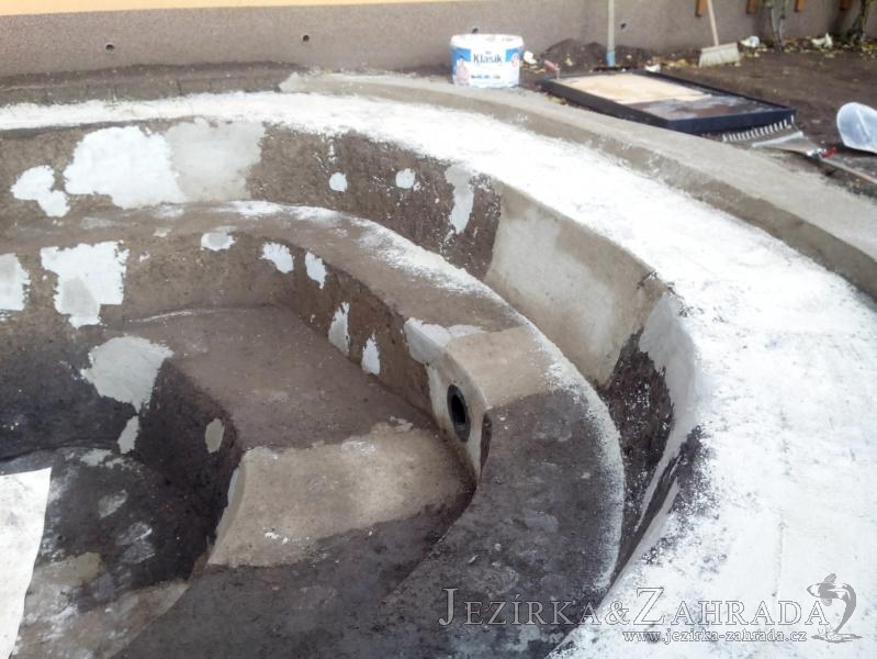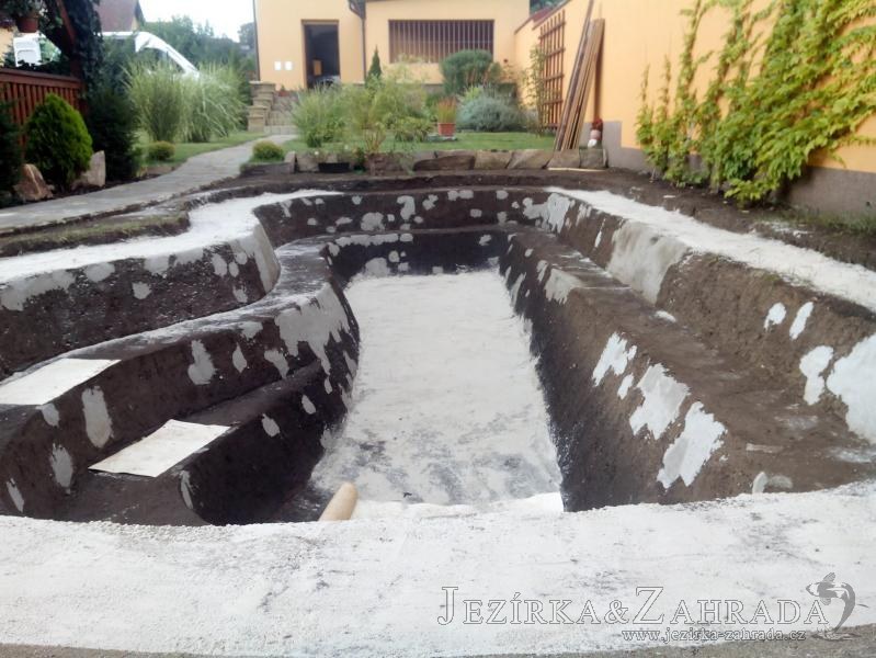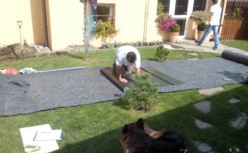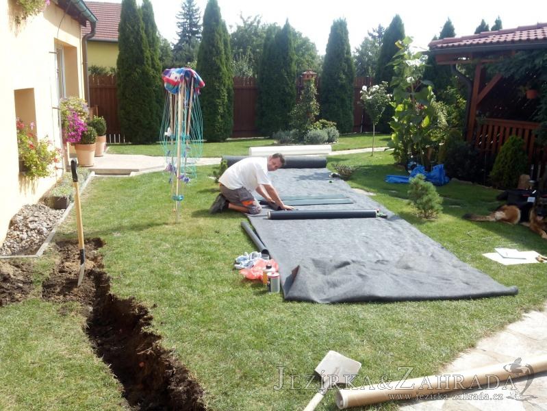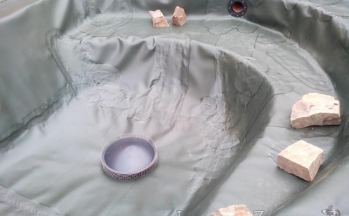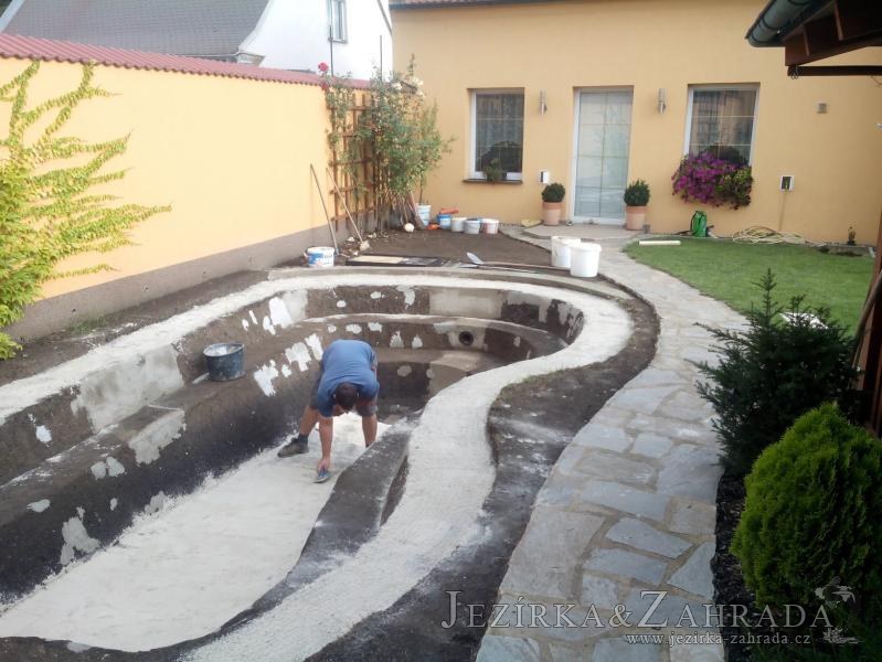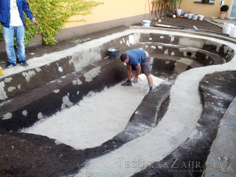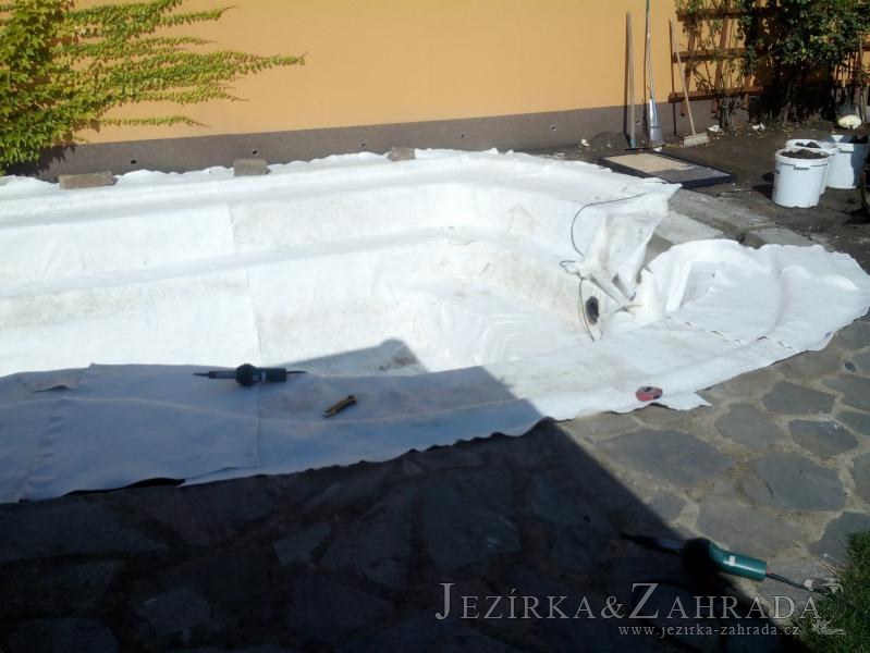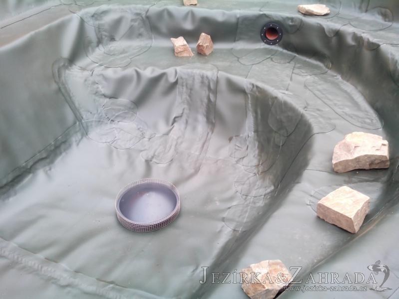 Zákazník si dle našich představ připravil jezírko a požádal nás o vyfóliování okrasného jezírka v Březně u Chomutova. Nejprve se připravilo připojení na technologii a po malých úpravách (vypískování) se položila geoxtílie 500g/m2. Následně se začala na míru svařovat fólie Fatra Aquaplast 805 1,5mm olivově zelená. Bylo použito větší množství záplat, aby se zabránilo úniku vody ve sváru. Kameny a kačírek si klient zajišťoval následně sám.
