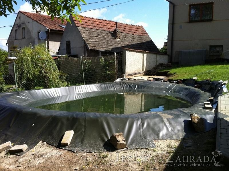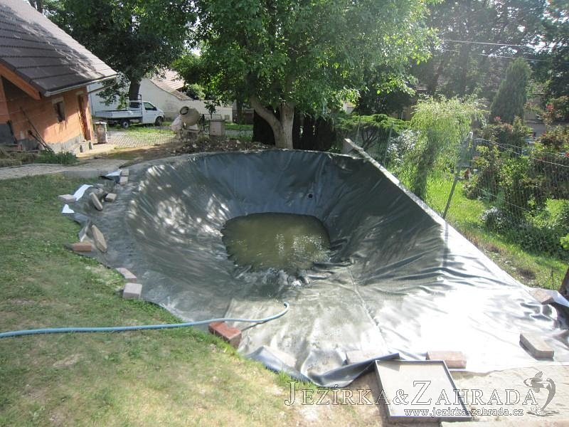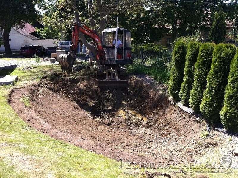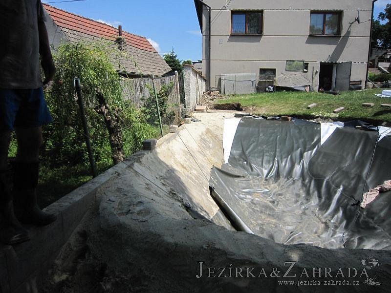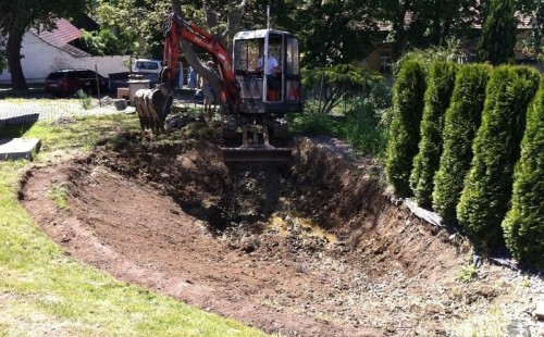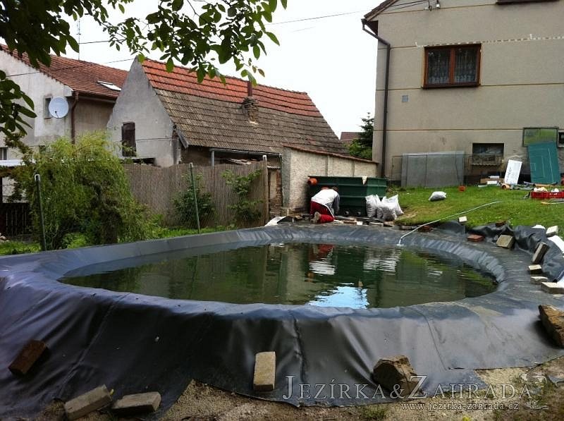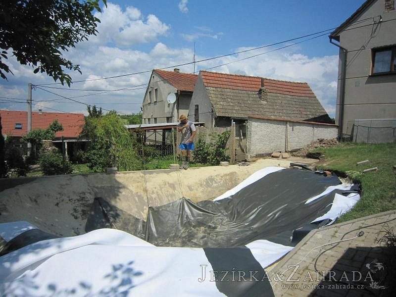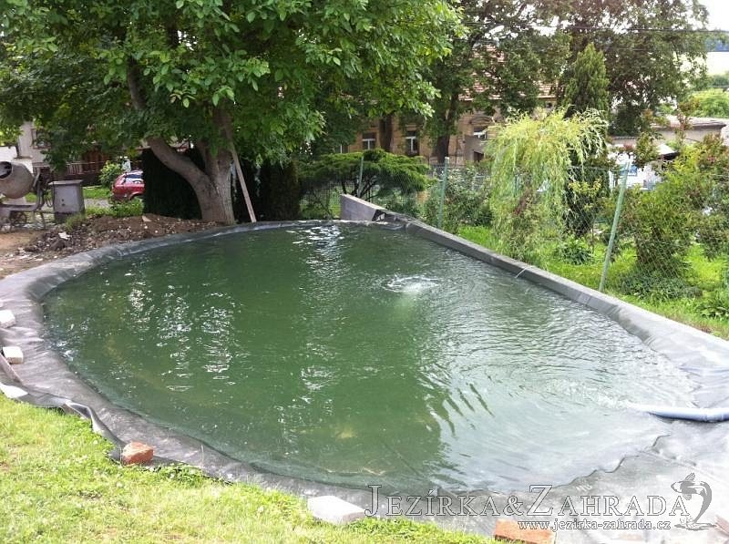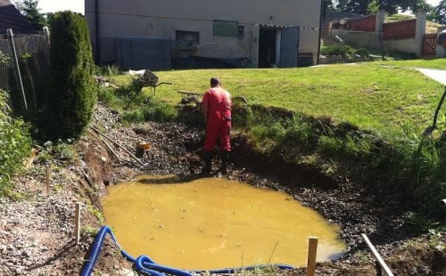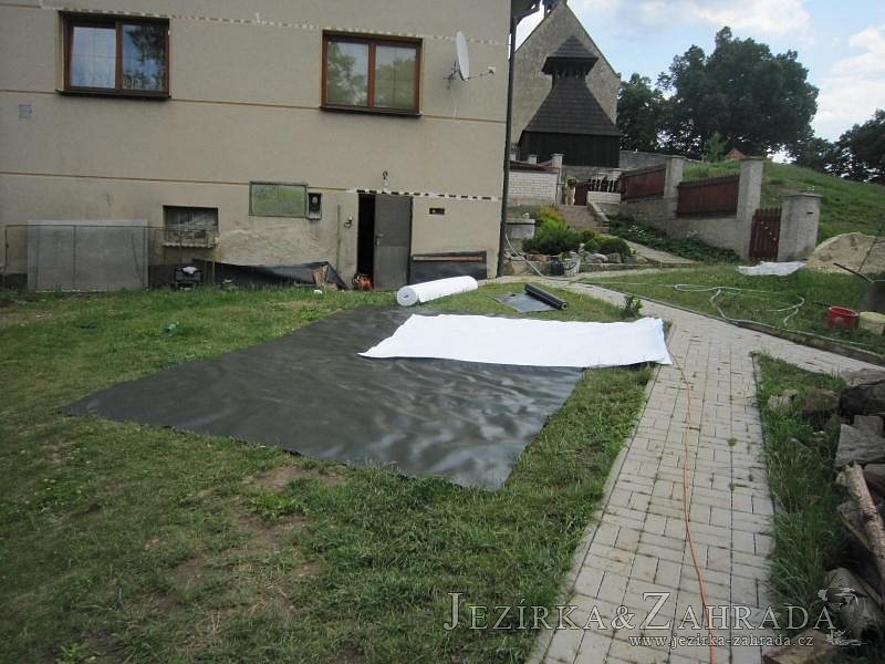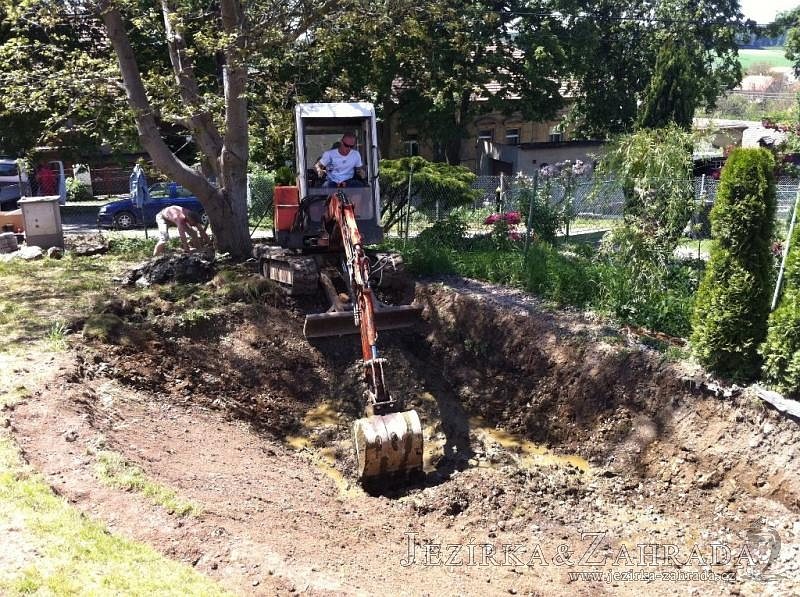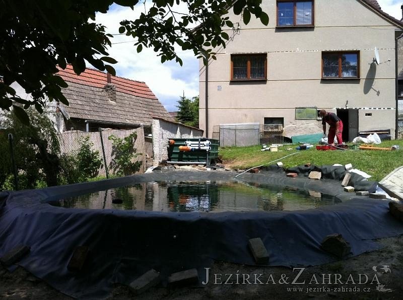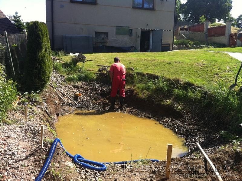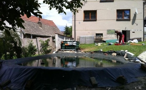 Klient si přál vystavět jezírko o velikosti 25m3. Po vytýčení tvaru jezírka došlo k položení gule, fóliové příruby pro skimmer Oase Aquaskim Gravity a potřebného potrubí k čerpadlové šachtě. Následně se vypískovalo kopaným pískem, položila se geotextílie 500g a svařila se jezírková fólie Fatra Aquaplast 805/V 1,5mm olivově zelená. K tomuto systému byla navržena technologie: biologicko-mechanická filtrace Tripond Center-Vortex C80 (umístěná nad jezírkem), čerpadlo Resun PG 18000, UV lampa TMC Pro Pond Advantage 110W, vzduchovací zařízení AquaForte V-60 s plackou 200mm. U tohoto jezírka byl trochu problém se spodní vodou. Konečný design jezírka si klient tvořil sám.