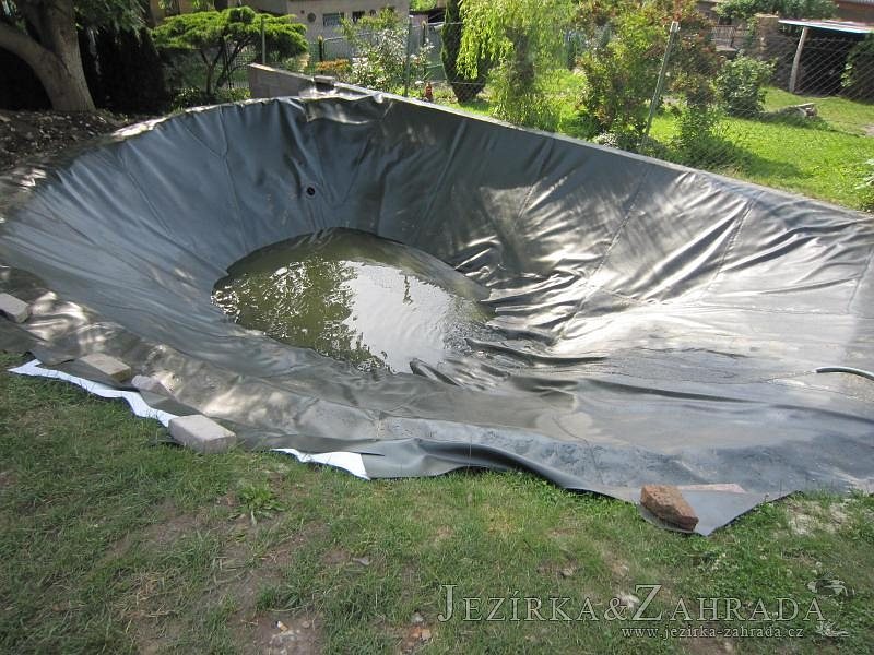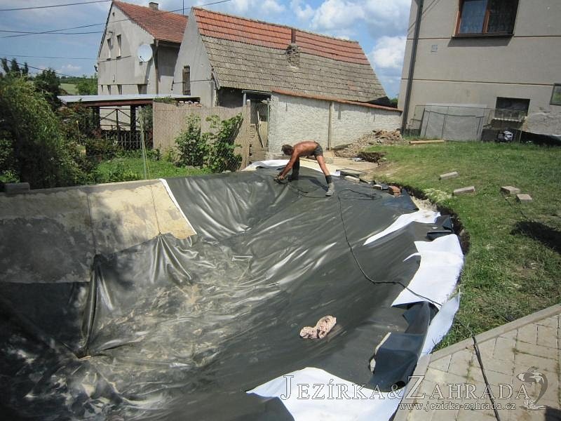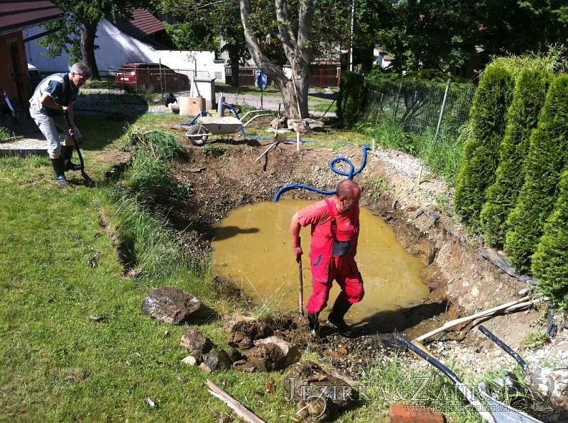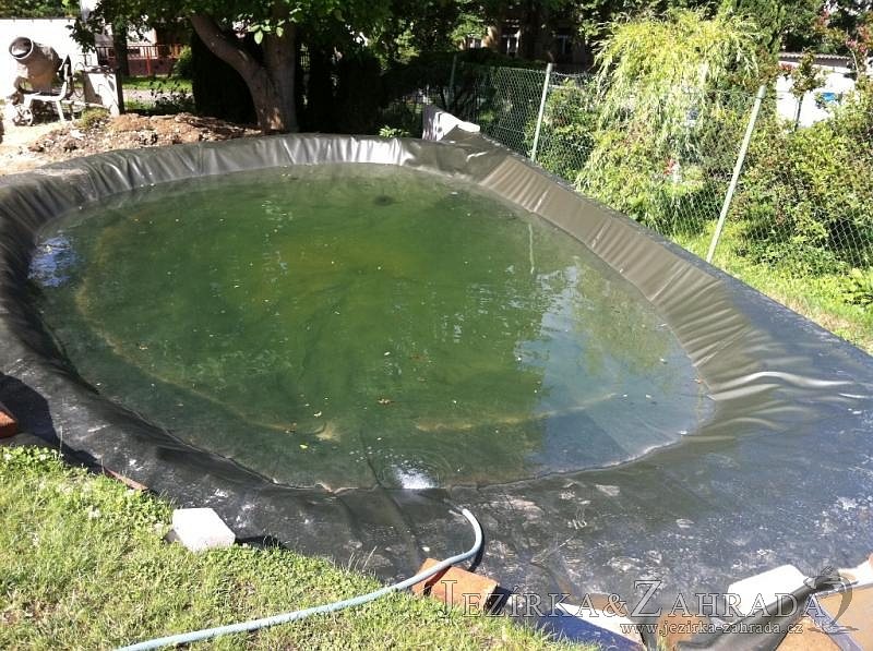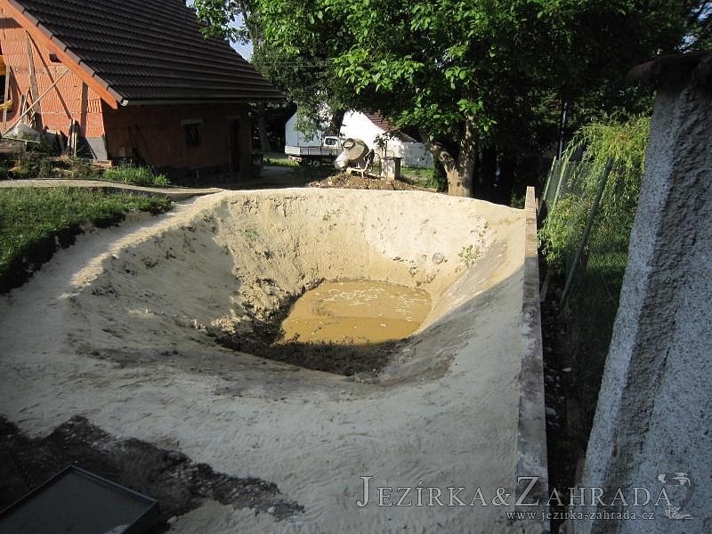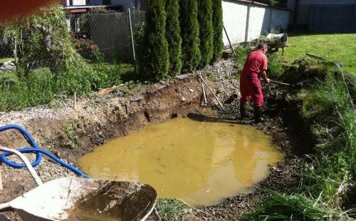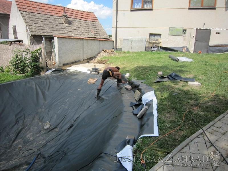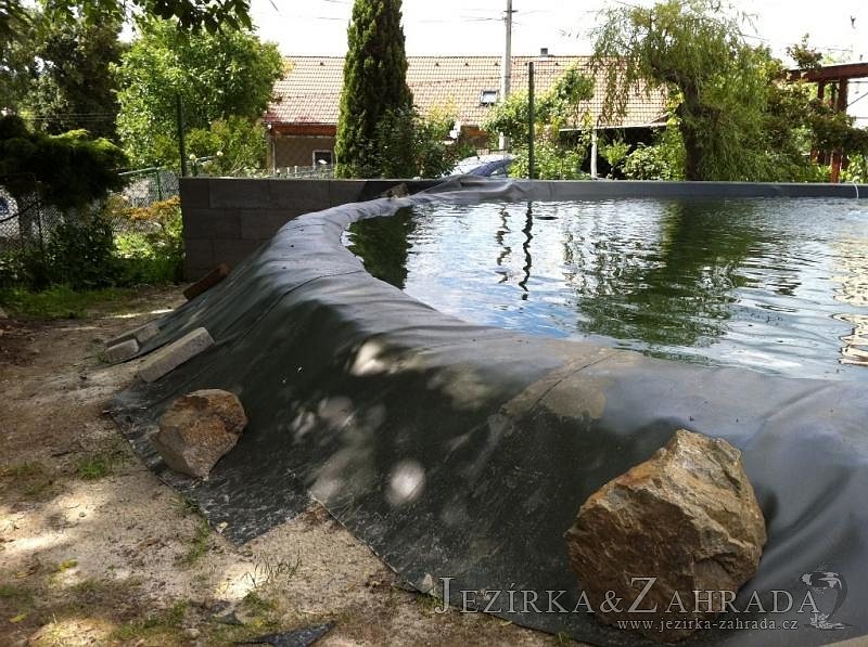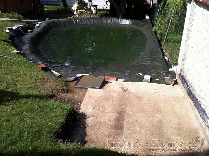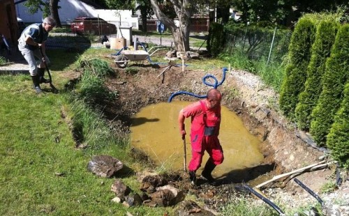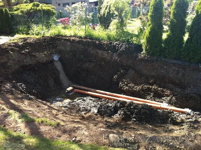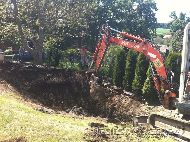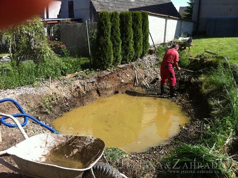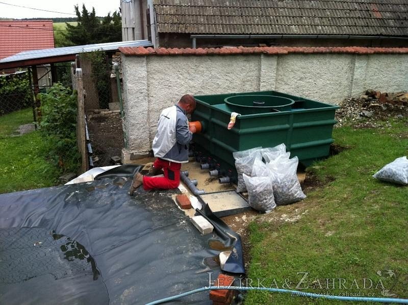 Klient si přál vystavět jezírko o velikosti 25m3. Po vytýčení tvaru jezírka došlo k položení gule, fóliové příruby pro skimmer Oase Aquaskim Gravity a potřebného potrubí k čerpadlové šachtě. Následně se vypískovalo kopaným pískem, položila se geotextílie 500g a svařila se jezírková fólie Fatra Aquaplast 805/V 1,5mm olivově zelená. K tomuto systému byla navržena technologie: biologicko-mechanická filtrace Tripond Center-Vortex C80 (umístěná nad jezírkem), čerpadlo Resun PG 18000, UV lampa TMC Pro Pond Advantage 110W, vzduchovací zařízení AquaForte V-60 s plackou 200mm. U tohoto jezírka byl trochu problém se spodní vodou. Konečný design jezírka si klient tvořil sám.