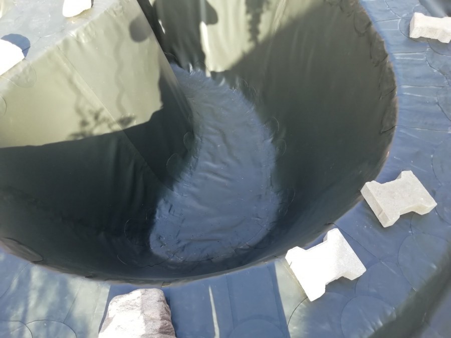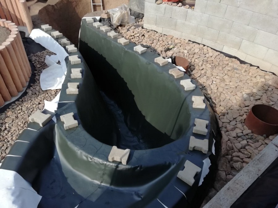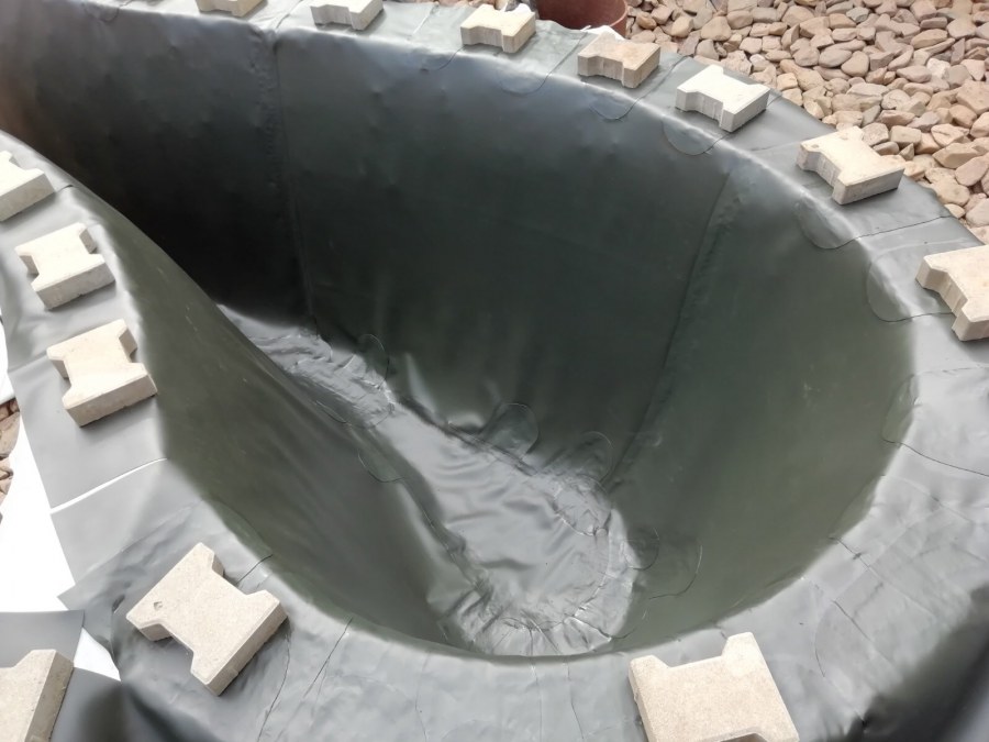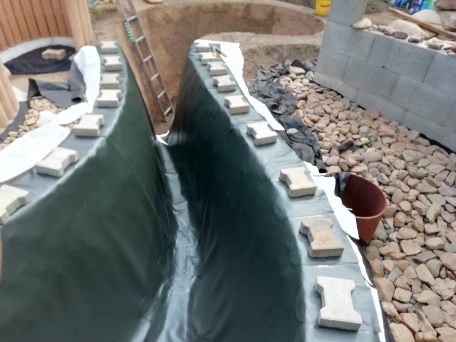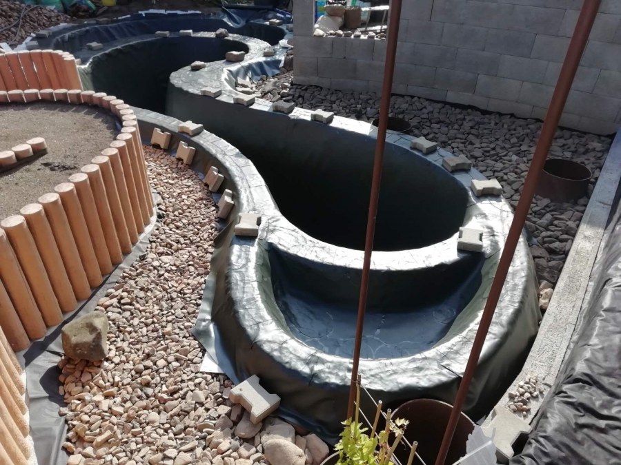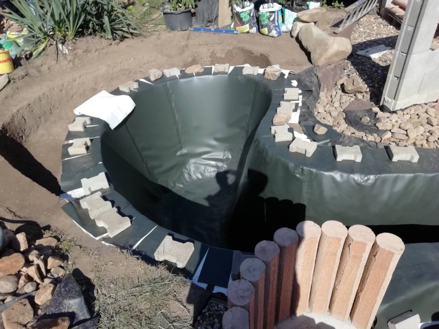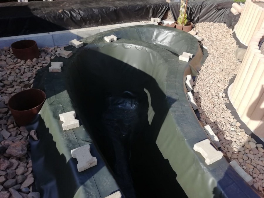 V červnu nás oslovil zákazník s žádostí o vyfóliování jezírka ve tvaru houslového klíče. Všechny přípravné práce si udělal sám, my jsme mu poskytli pouze několik rad. Naši technici přišli k již připravenému, vypískovanému jezírku a mohli začít s přípravou na fóliování. Jezírko není velké obsahem, ale má složitější oblé tvary, takže práce patřila mezi náročnější. Položili jsme geotextílii 500g a poté svařili fólii Aquaplast 805/V 1,5mm olivově zelenou. Po napuštění má jezírko obsah jen 10m3. Technologii jsme doporučili velmi jednoduchou jak na sestavení, tak na následnou obsluhu samotným klientem. Na dno položil čerpadlo AquaForte O-series 6500, které propojil s filtrací Oase Biotec Screenmatic 60000 a UV lampou Oase Vitronic 36W, které postavil na břeh jezírka.