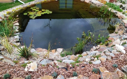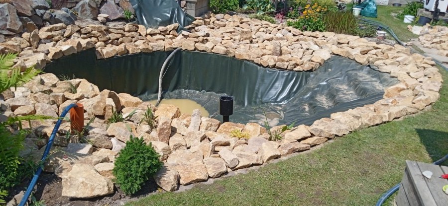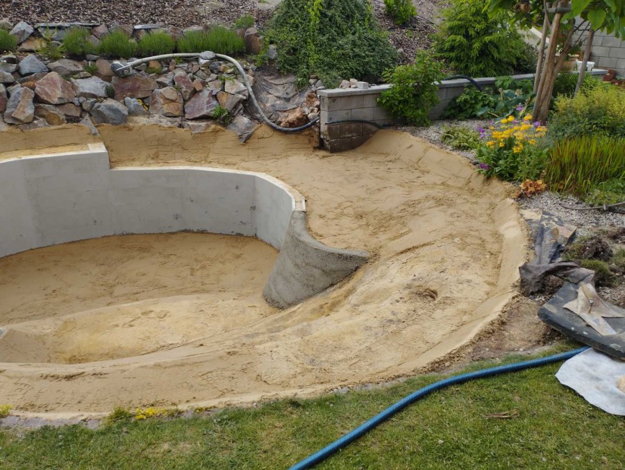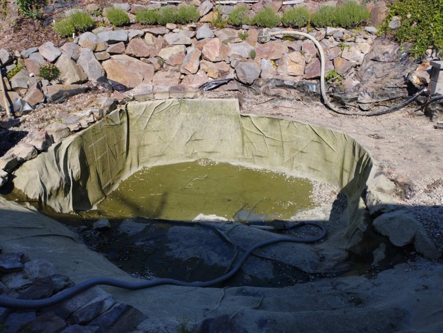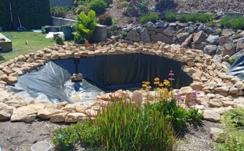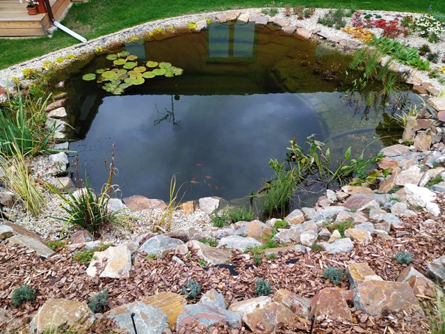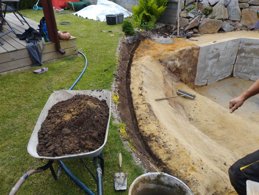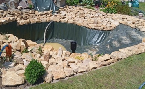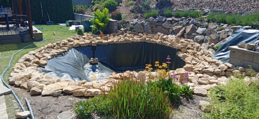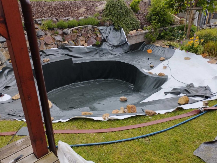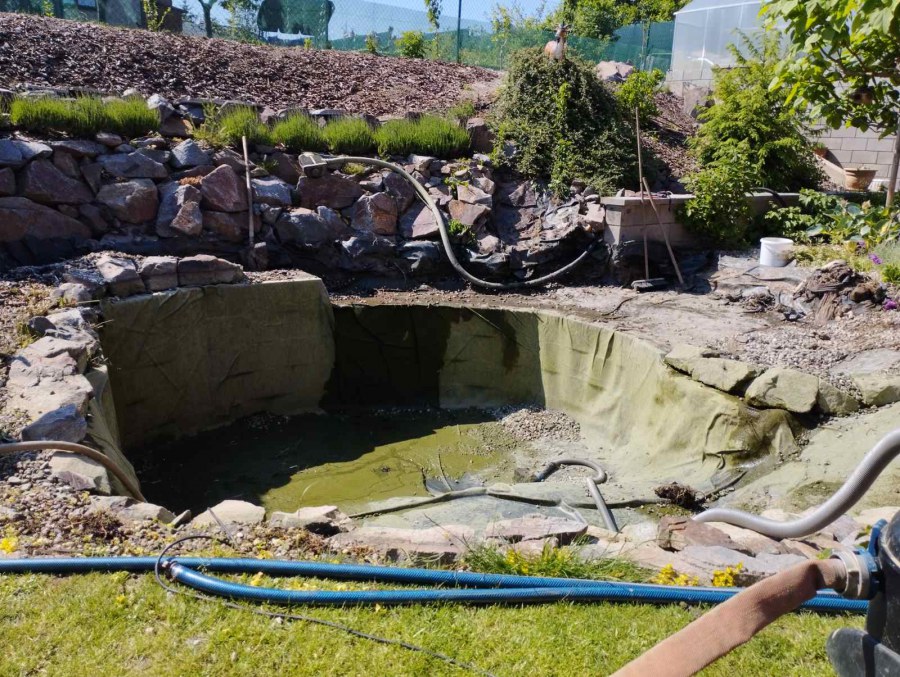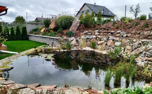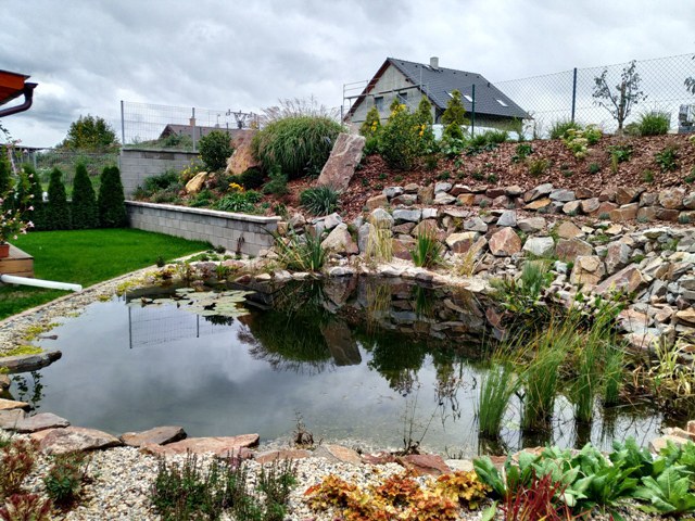 Rekonstrukce starého, nefunkčního jezírka u rodinného domku. Po konzultaci s majiteli jsme začali s kompletní rekonstrukcí na klíč. První krok byl vypustit vodu z jezírka, přelovit rybky do saku, zredukovat vodní květiny a odstranit kameny a kačírek. Poté přišla na řadu likvidace staré fólie a geotextílie. Čistý povrch jezírka se upravil, začistil a místy pokryl novým betonem. Nakonec se jezírko vypískovalo kopaným pískem, na něj se položila geotextílie 500g a nakonec se začala svařovat jezírková fólie Fatra Aquaplast 805/V olivově zelená. Po dokončení fóliování začali naši technici zapojovat stávající technologii. Na dno jezírka položili dvouvětvé čerpadlo které napojili na trubkový skimmer Oase AquaSkim. Toto čerpadlo bere nečistoty jak ze dna jezírka, tak saje nečistoty z povrchu pomocí skimmeru. Čerpadlo pak žene vodu do filtrace, odkud se vyčištěná vrací zpět. Začali napouštět vodu a mezi tím pokládali na pobřežní zónu kameny a vodní květiny. Po napuštění vody, aplikovali přípravek na úpravu vody Oase Safe Care, aby mohli ihned vrátit ryby do jezírka.