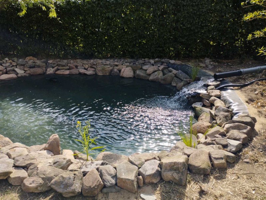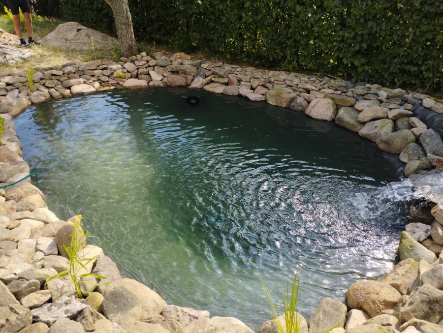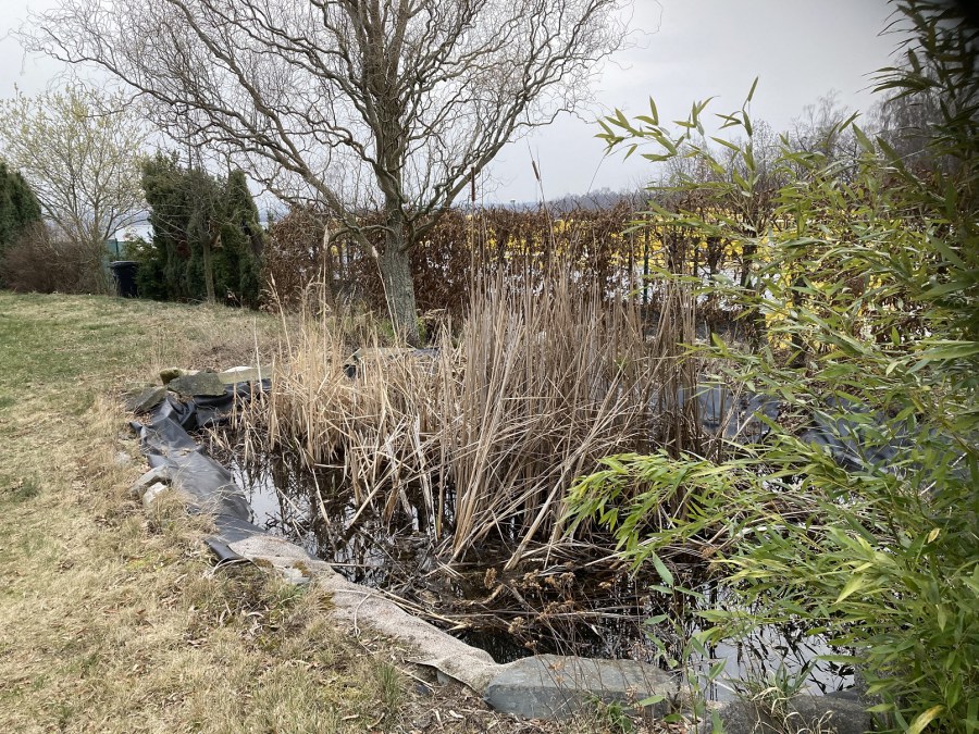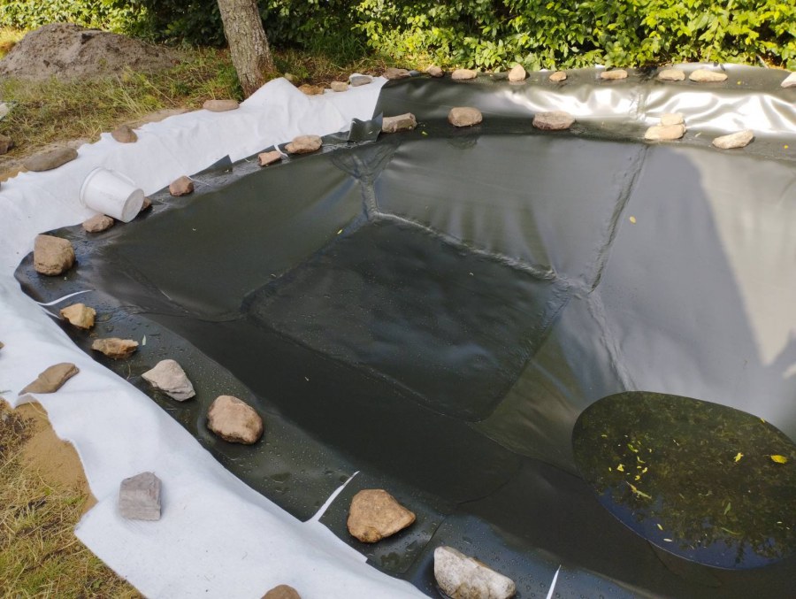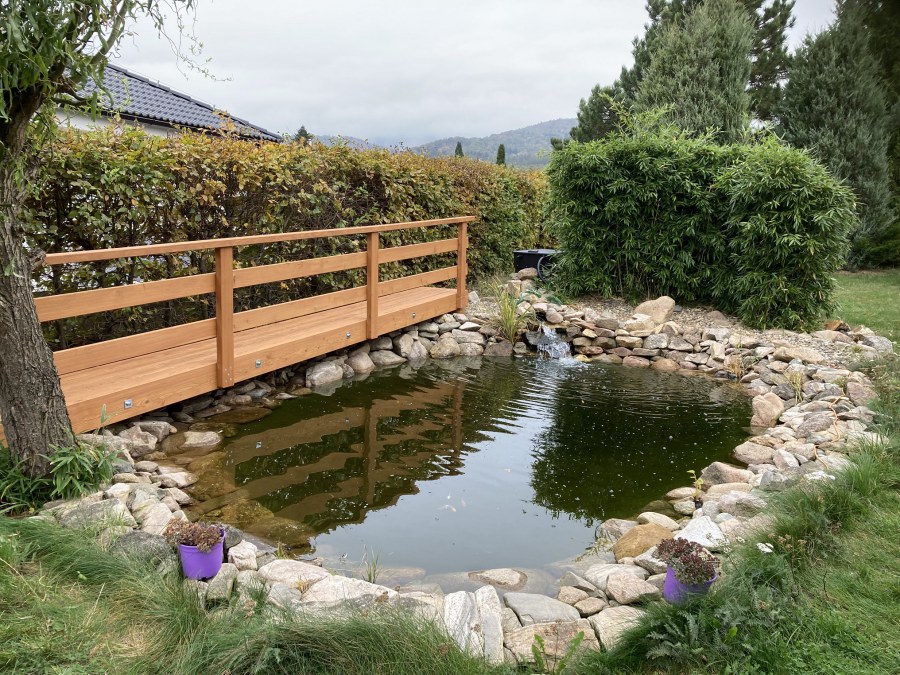 V roce 2022 jsme začali plánovat rekonstrukci 20 let starého jezírka u rodinného domku v Lomu u Mostu. S majitelkou jsme domluvili kompletní rekonstrukci na klíč. Bourání jezírka obnášelo likvidaci starých rostlin, odvoz kamení a staré plachty. Zvětšení, prohloubení a úprava povrchu jezírka. Před vyfóliováním se jezírko pokrylo vrstvou kopaného písku, na ten se natáhla geotextílie 500g a na ni se začala svařovat fólie Fatra AquaPlast 805/V olivově zelená do požadovaného tvaru. Po napuštění jsme do pobřežní zóny položili Kubo kameny a kačírek, do kterého jsme zasadili vodní květiny.