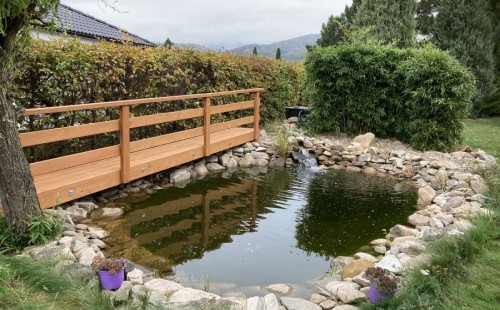 Toto malé okrasné jezírko jsme navrhli tak, aby klienti byli schopni se sami postarat o jeho chod. Proto jsme navrhli lehce ovladatelnou technologii. Na dno jezírka se položilo čerpadlo AquaForte O-series 13000 to jsme spojili hadicí 38mm s UV lampou Oase Vitronic 55W která je pověšená na filtraci Oase BioTec ScreenMatic 90000, tato sestava je jednoduchá a lehká k manipulaci. Jako hladinový sběrač jsme použili plovoucí skimmer Oase SwimmSkim 25.