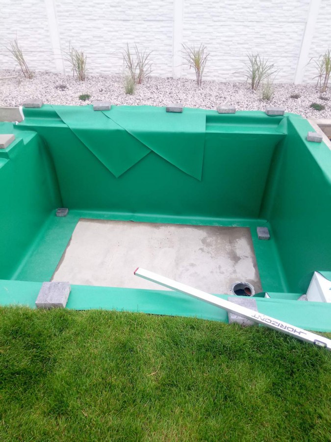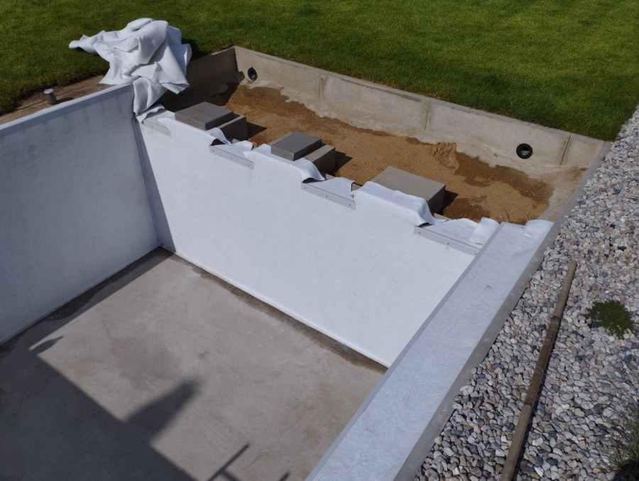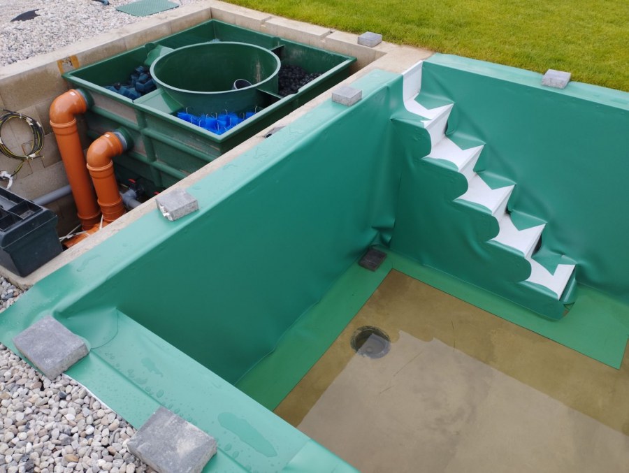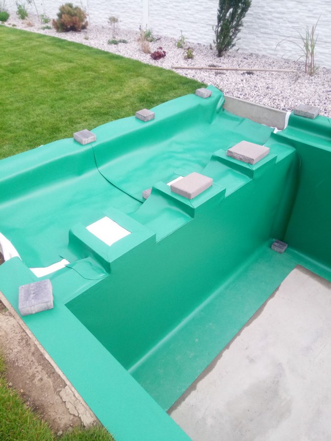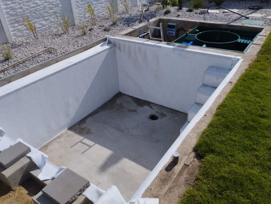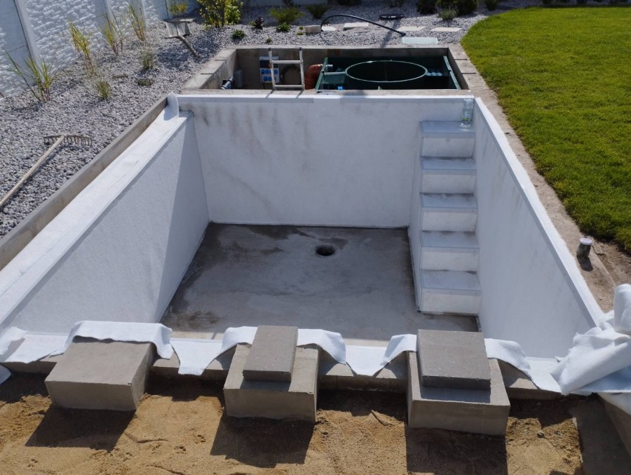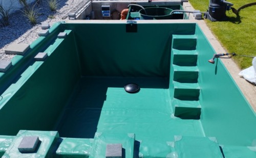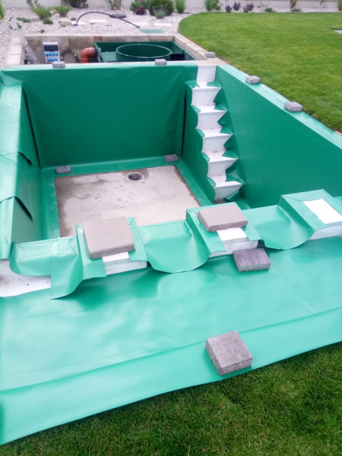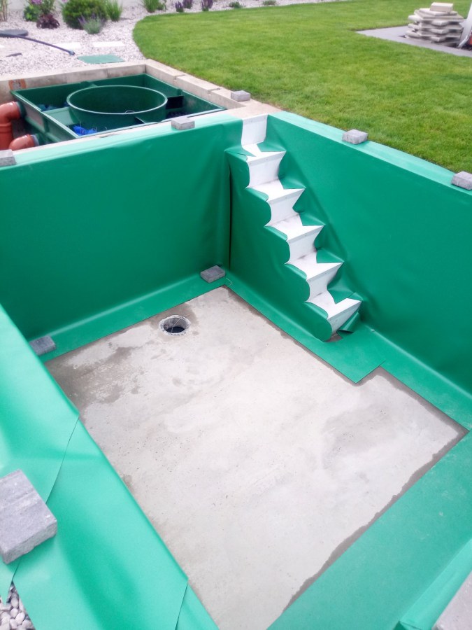 Stavba tohoto koupacího jezírka byla velmi rychlá. Po rychlé schůzce, při které se naplánoval tvar, technologie a postup stavby si klient svépomocí, malým bagříkem, vyhloubil tvar jezírka. Poté postavil ze ztraceného bednění zdi a vylil podlahu betonem. Do podlahy před tím ale zabudoval gulu a potrubí od ní natáhl do technické místnosti. Na hranu zdi u technické místnosti se připevnil jezírkový skimmer Oase ProfiSkim Wall 100. Po těchto úpravách mohli začít naši technici s foliováním. Nejprve natáhli geotextílii 500g, poté na hrany zdí a schodů navrtali speciální fóliové lišty Fatra Fatranyl PP a na ně následně navařili jezírkovou fólii Fatra AquaPlast 805/V světle zelenou.