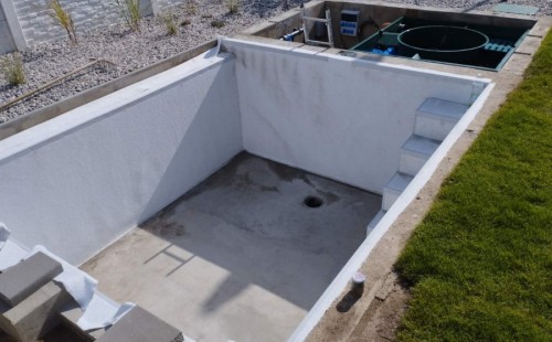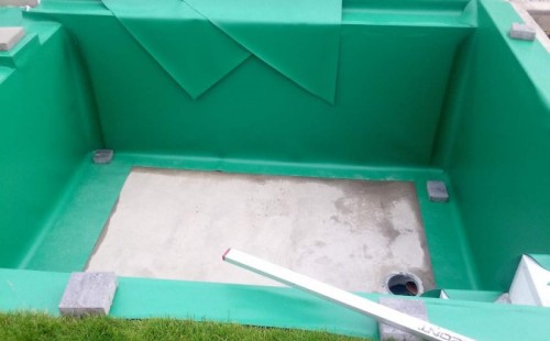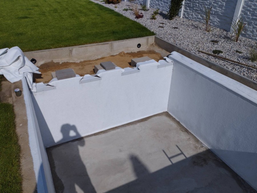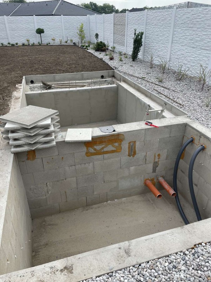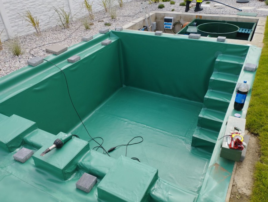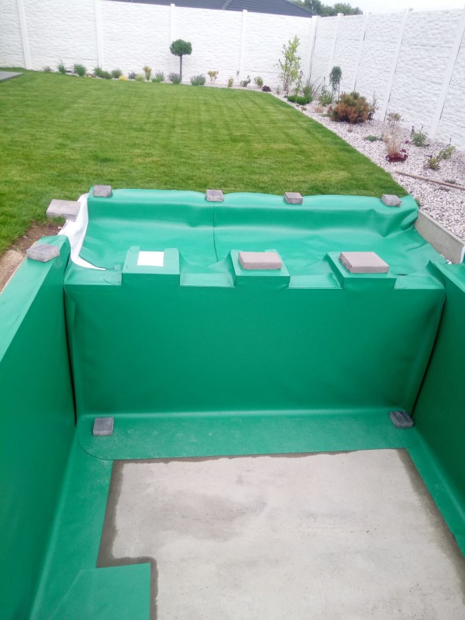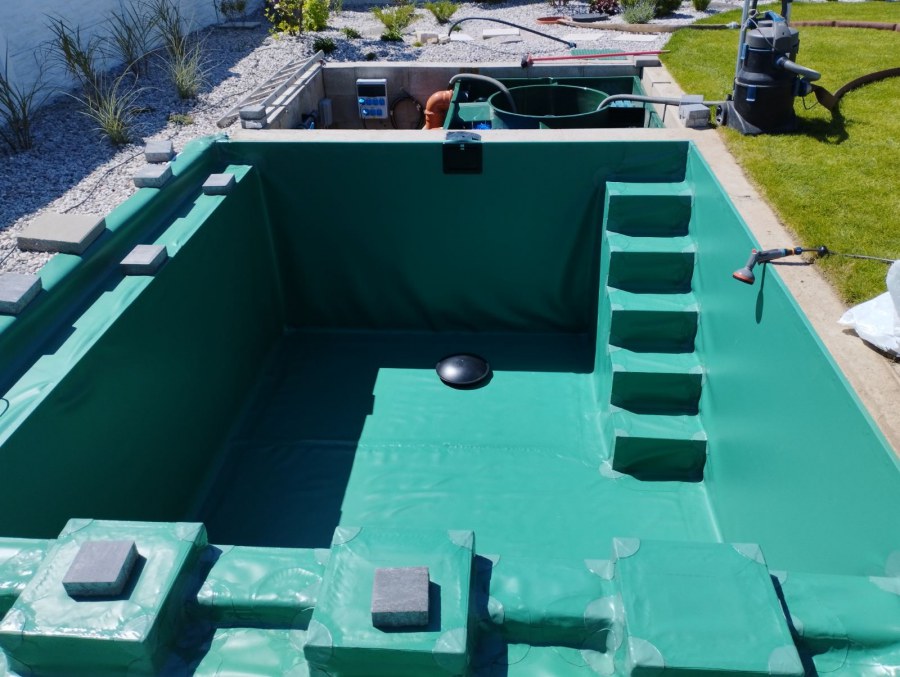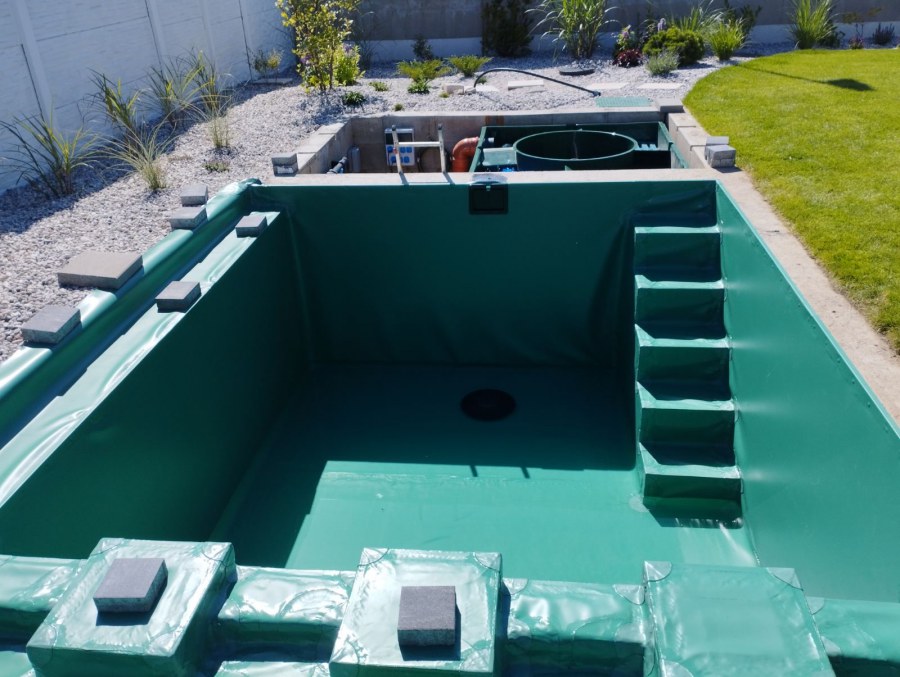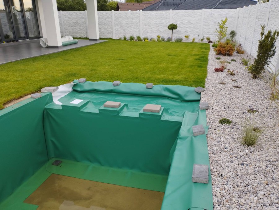 Stavba tohoto koupacího jezírka byla velmi rychlá. Po rychlé schůzce, při které se naplánoval tvar, technologie a postup stavby si klient svépomocí, malým bagříkem, vyhloubil tvar jezírka. Poté postavil ze ztraceného bednění zdi a vylil podlahu betonem. Do podlahy před tím ale zabudoval gulu a potrubí od ní natáhl do technické místnosti. Na hranu zdi u technické místnosti se připevnil jezírkový skimmer Oase ProfiSkim Wall 100. Po těchto úpravách mohli začít naši technici s foliováním. Nejprve natáhli geotextílii 500g, poté na hrany zdí a schodů navrtali speciální fóliové lišty Fatra Fatranyl PP a na ně následně navařili jezírkovou fólii Fatra AquaPlast 805/V světle zelenou.
