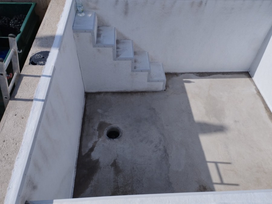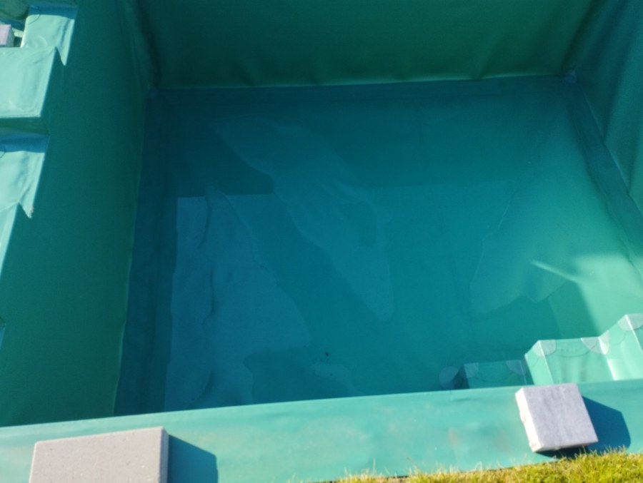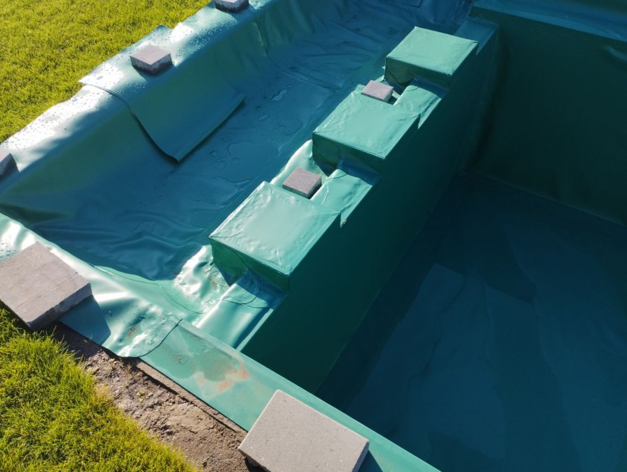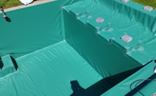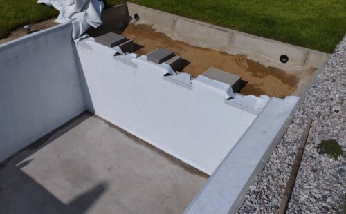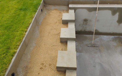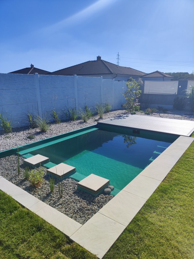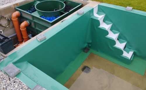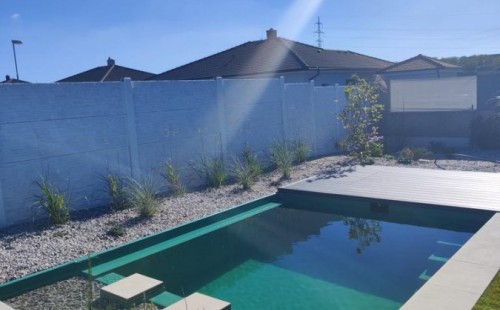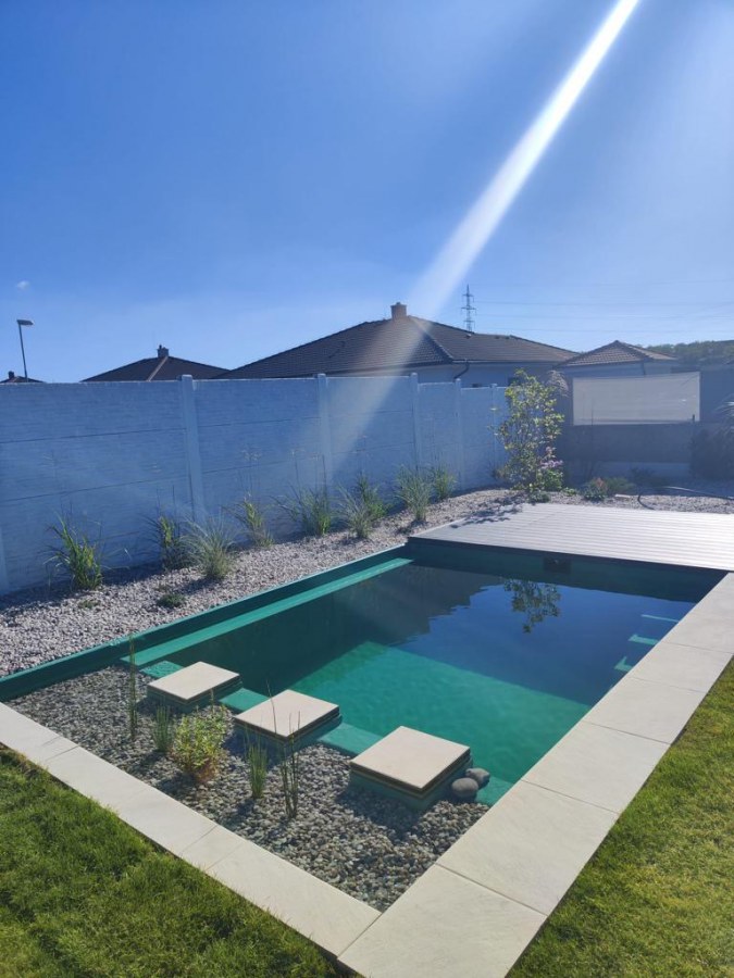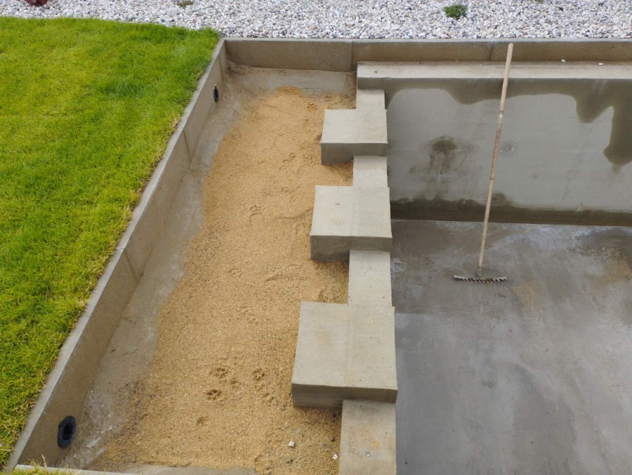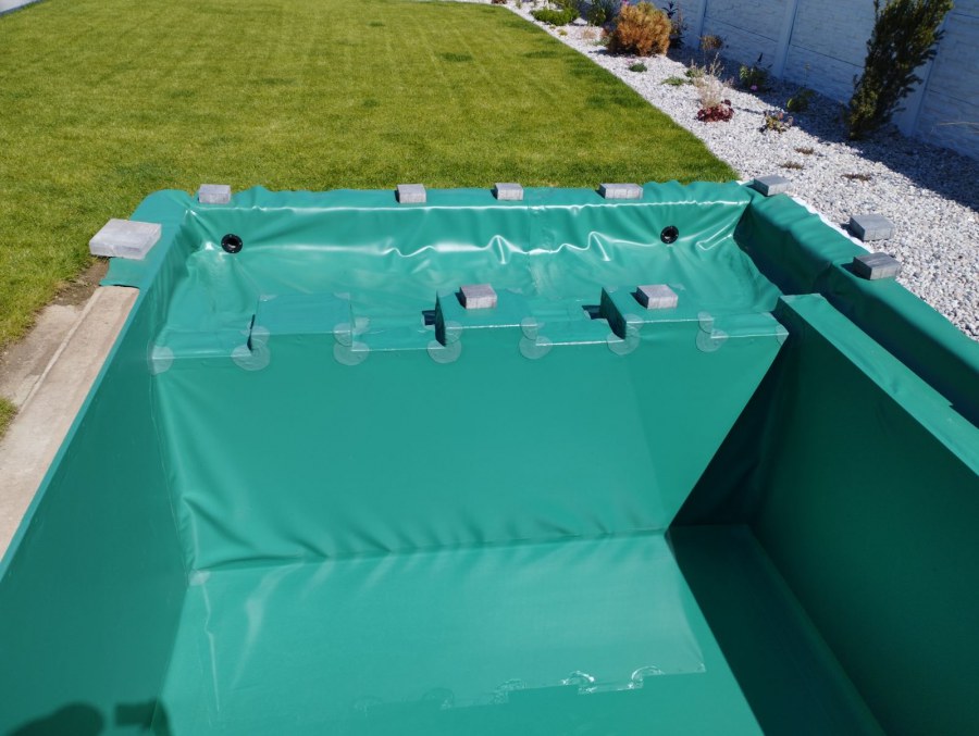 Stavba tohoto koupacího jezírka byla velmi rychlá. Po rychlé schůzce, při které se naplánoval tvar, technologie a postup stavby si klient svépomocí, malým bagříkem, vyhloubil tvar jezírka. Poté postavil ze ztraceného bednění zdi a vylil podlahu betonem. Do podlahy před tím ale zabudoval gulu a potrubí od ní natáhl do technické místnosti. Na hranu zdi u technické místnosti se připevnil jezírkový skimmer Oase ProfiSkim Wall 100. Po těchto úpravách mohli začít naši technici s foliováním. Nejprve natáhli geotextílii 500g, poté na hrany zdí a schodů navrtali speciální fóliové lišty Fatra Fatranyl PP a na ně následně navařili jezírkovou fólii Fatra AquaPlast 805/V světle zelenou.