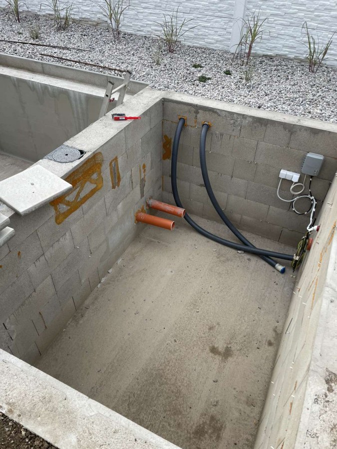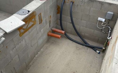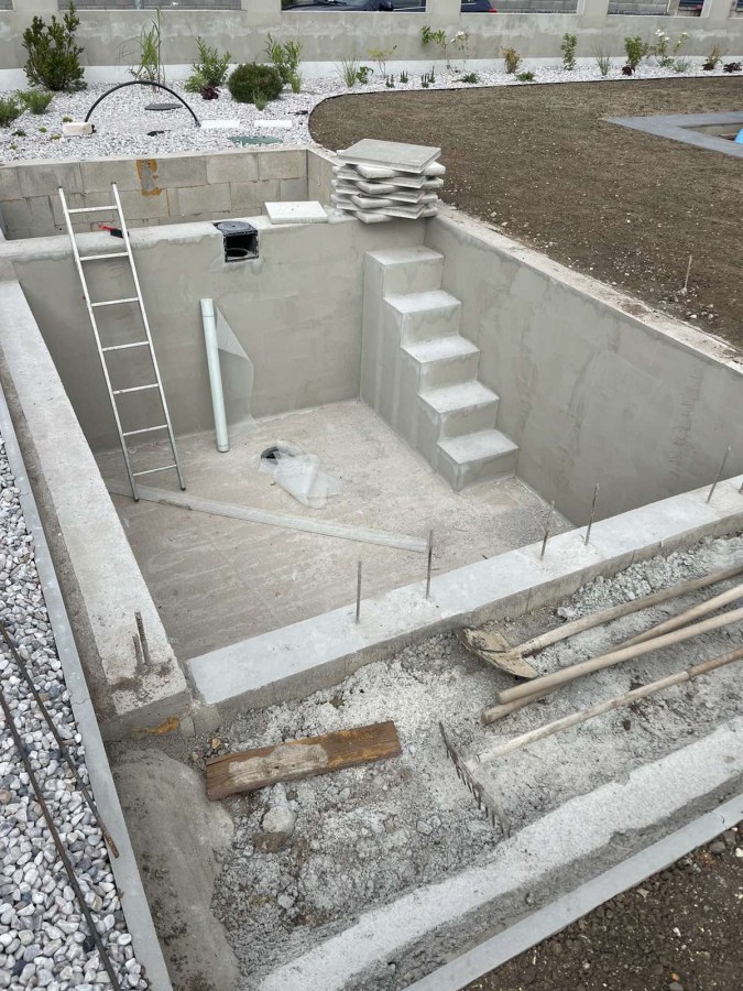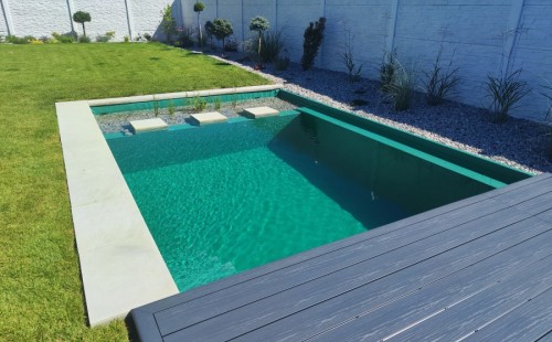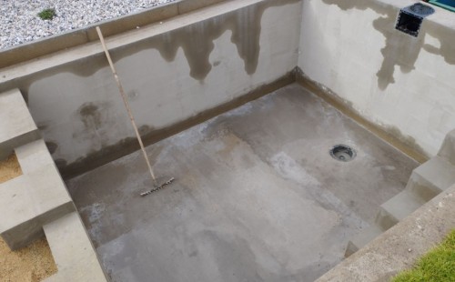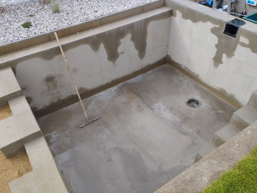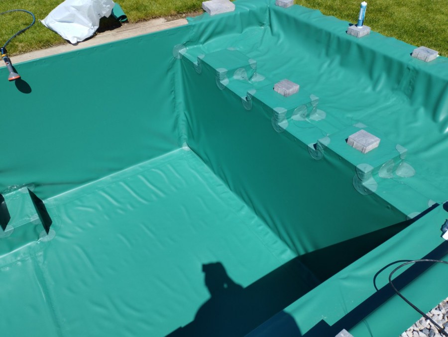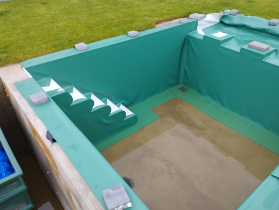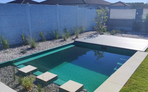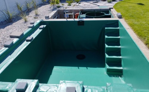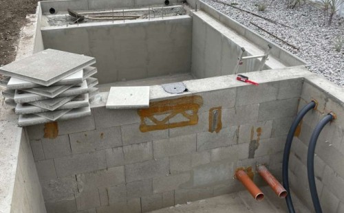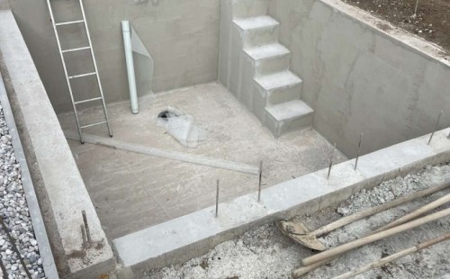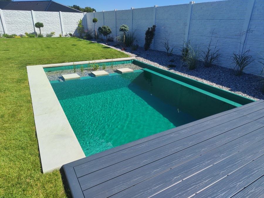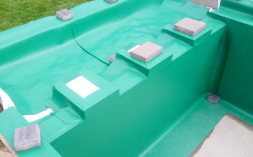 Stavba tohoto koupacího jezírka byla velmi rychlá. Po rychlé schůzce, při které se naplánoval tvar, technologie a postup stavby si klient svépomocí, malým bagříkem, vyhloubil tvar jezírka. Poté postavil ze ztraceného bednění zdi a vylil podlahu betonem. Do podlahy před tím ale zabudoval gulu a potrubí od ní natáhl do technické místnosti. Na hranu zdi u technické místnosti se připevnil jezírkový skimmer Oase ProfiSkim Wall 100. Po těchto úpravách mohli začít naši technici s foliováním. Nejprve natáhli geotextílii 500g, poté na hrany zdí a schodů navrtali speciální fóliové lišty Fatra Fatranyl PP a na ně následně navařili jezírkovou fólii Fatra AquaPlast 805/V světle zelenou.
