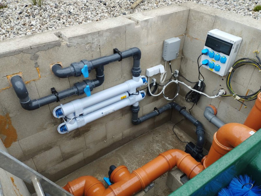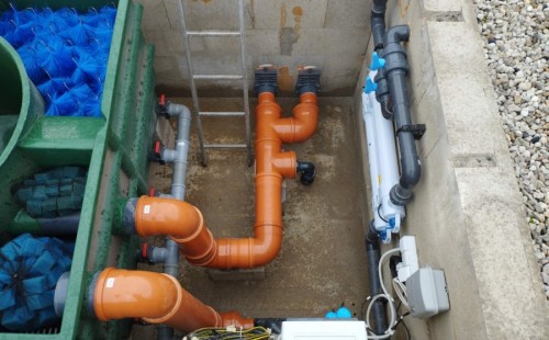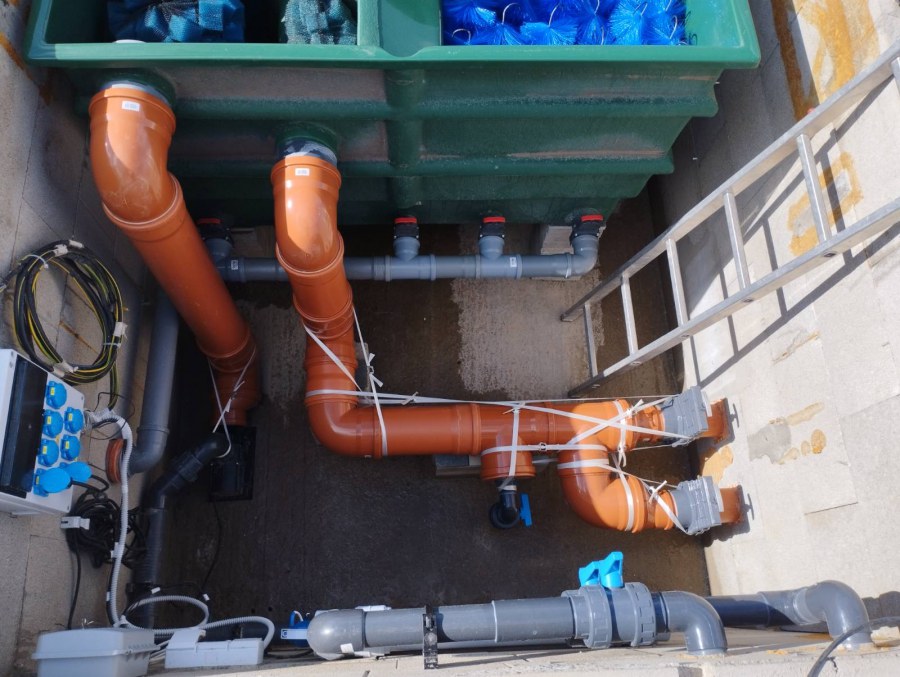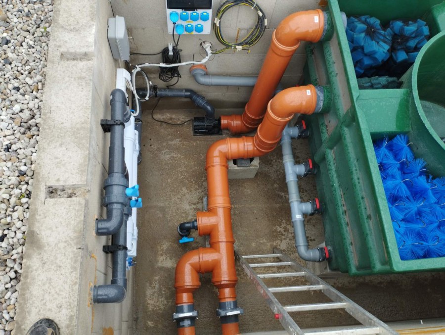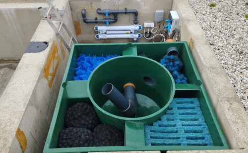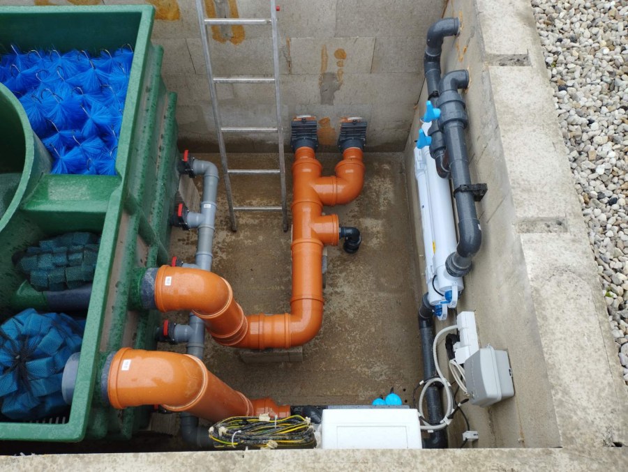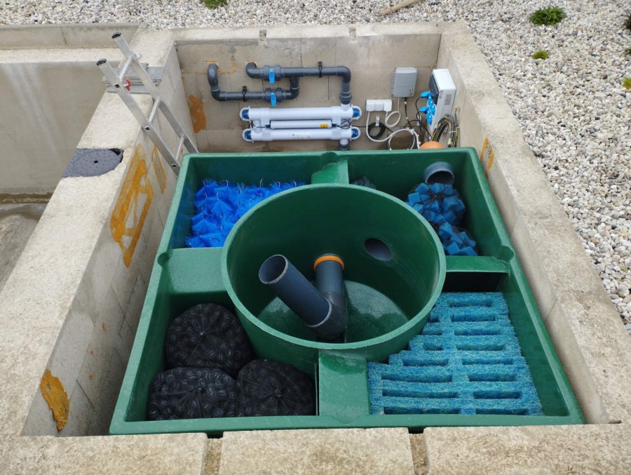 Do technické místnosti jsme zapojili biologicko – mechanický filtr Tripond Vortex Center C-80, systémové čerpadlo Oase AquaMax Gravity Eco 15000 a UV lampa TMC ProClear 110W.