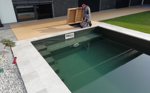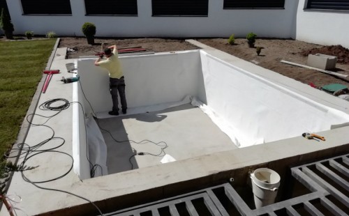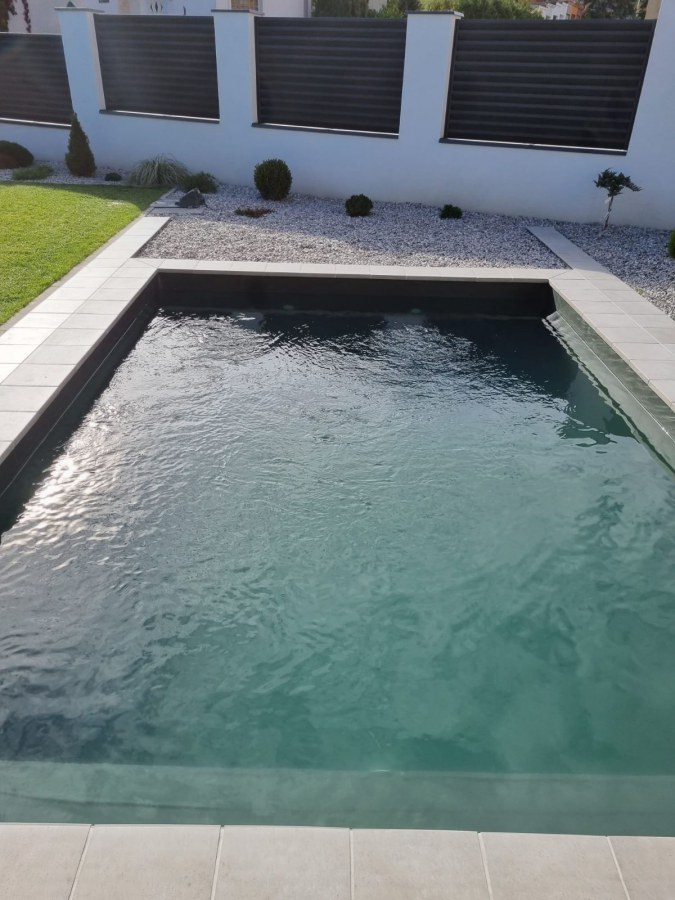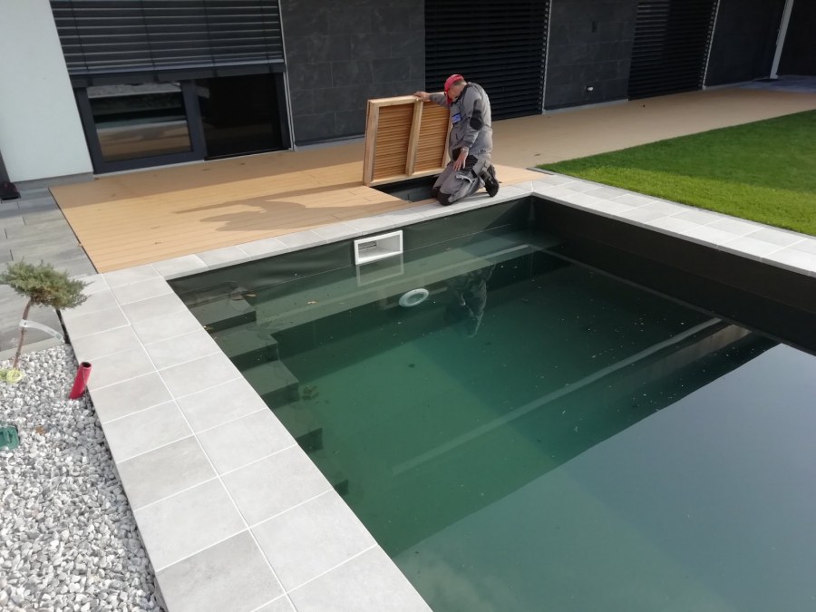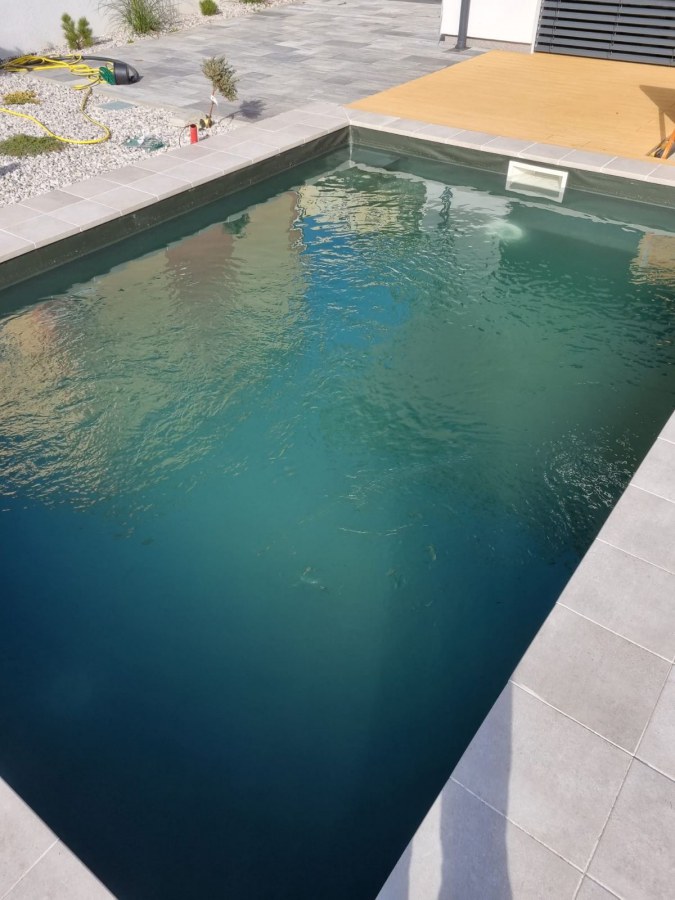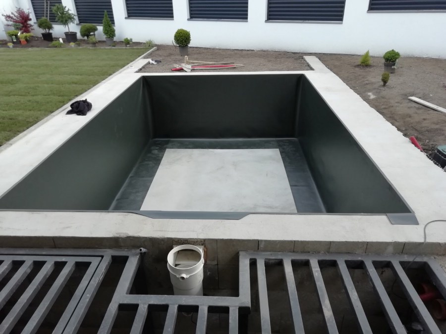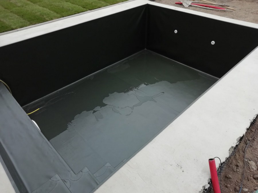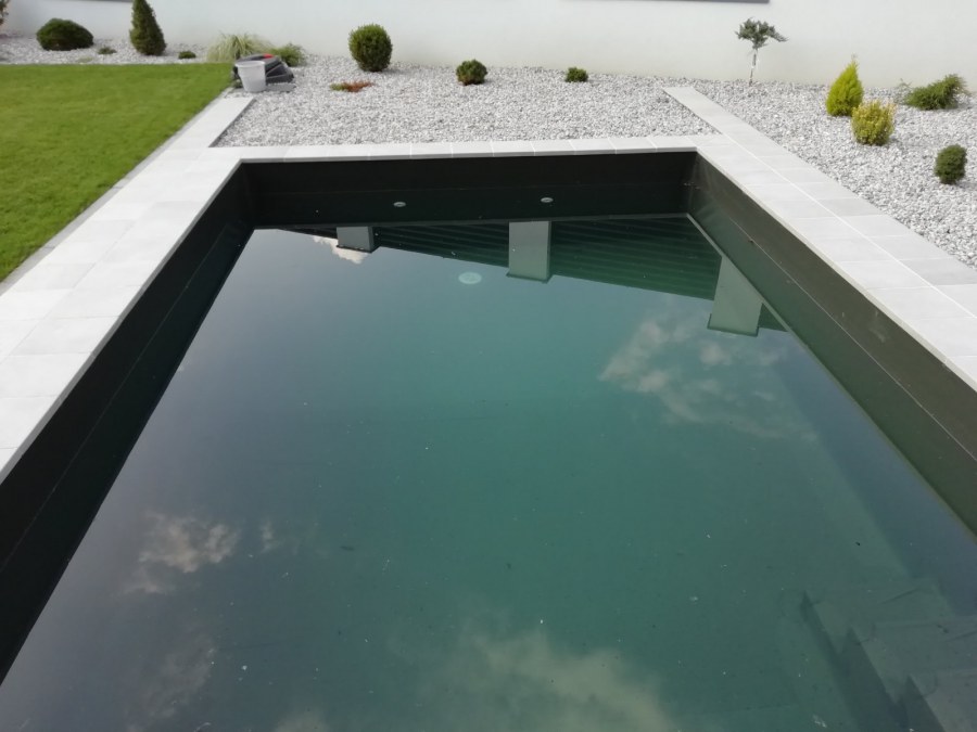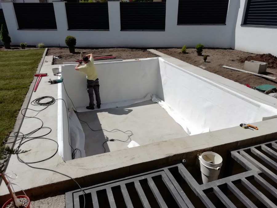 Od loňského roku spolupracujeme na výstavbě koupacího jezírka u rodinného domu v Mostě. Stavba probíhá současně se stavbou domu. Výkopové a zednické práce si zajistil investor sám. Pod naším stavebním dozorem dělníci vykopali jak koupací část, tak prostor pro technologii. Naši technici položili guly, natáhli od nich potrubí do technické místnosti, připravili potrubí pro skimmer V10 ABS, který se zabetonoval do zdi, stejně jako světlo VA 300W. Zdi a dno dělníci vybetonovali. Když se dokončovali práce na domě a nemuseli jsme mít obavy, že se poškodí folie, mohli jsme pomalu začít dokončovat jezírko. Naši technici začali s pokládkou folie na míru. Nejprve položili geotextílii 500g, pak na horní hrany přivrtali koutové lišty, na které začali navařovat jezírkovou folii Fatra Aquaplast 805/V olivově zelenou, přesně dle tvaru jezírka.