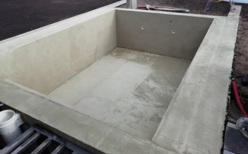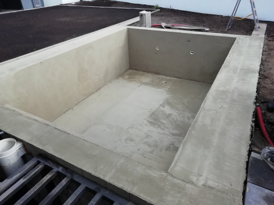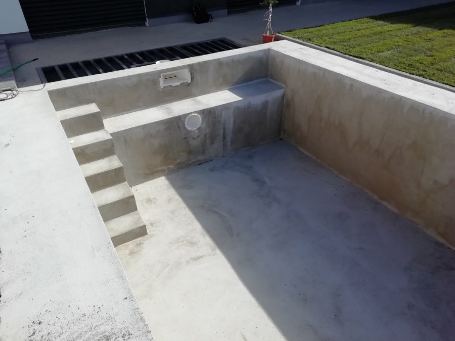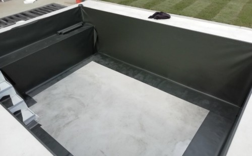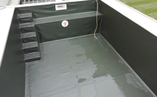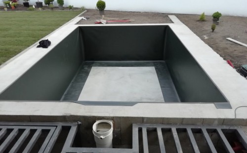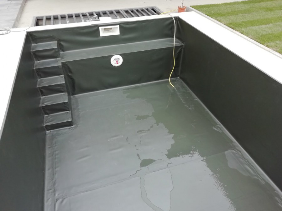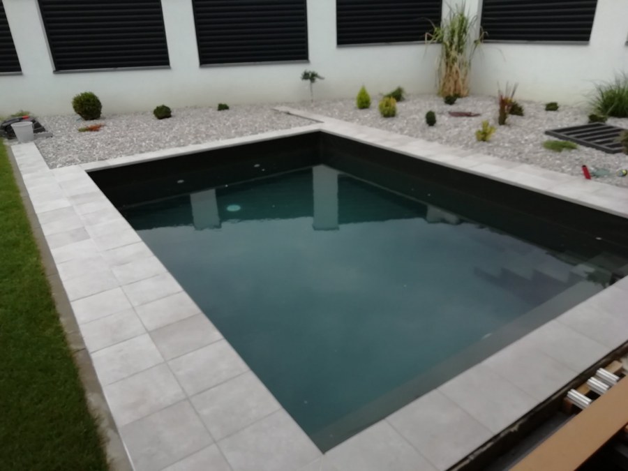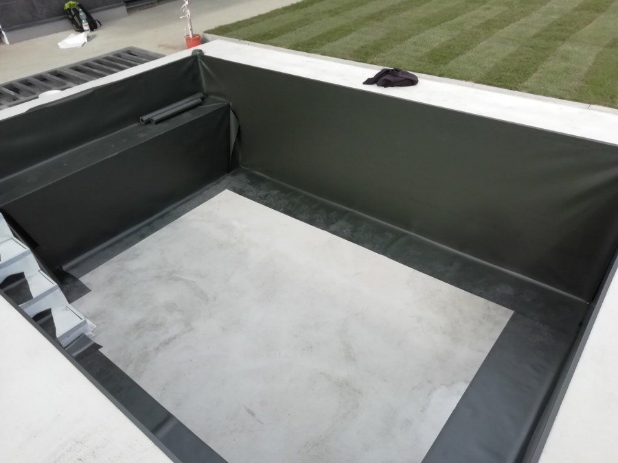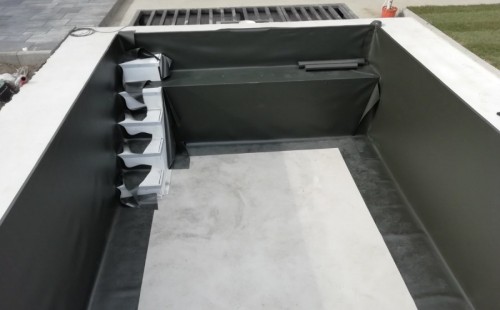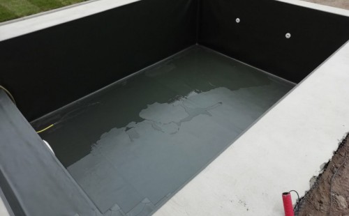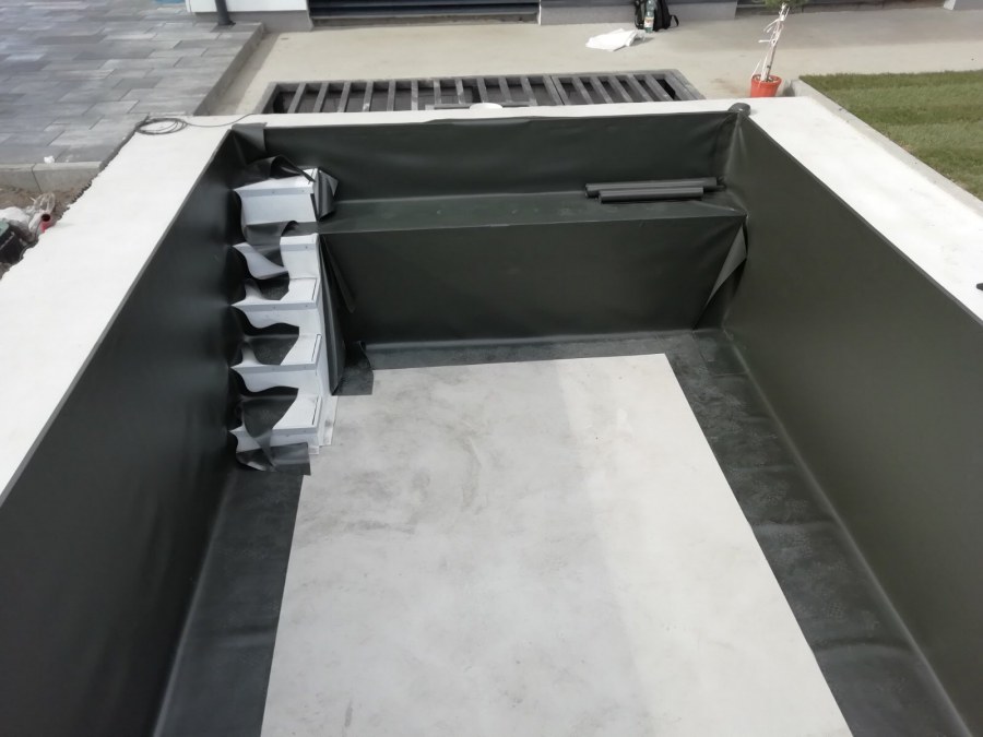 Od loňského roku spolupracujeme na výstavbě koupacího jezírka u rodinného domu v Mostě. Stavba probíhá současně se stavbou domu. Výkopové a zednické práce si zajistil investor sám. Pod naším stavebním dozorem dělníci vykopali jak koupací část, tak prostor pro technologii. Naši technici položili guly, natáhli od nich potrubí do technické místnosti, připravili potrubí pro skimmer V10 ABS, který se zabetonoval do zdi, stejně jako světlo VA 300W. Zdi a dno dělníci vybetonovali. Když se dokončovali práce na domě a nemuseli jsme mít obavy, že se poškodí folie, mohli jsme pomalu začít dokončovat jezírko. Naši technici začali s pokládkou folie na míru. Nejprve položili geotextílii 500g, pak na horní hrany přivrtali koutové lišty, na které začali navařovat jezírkovou folii Fatra Aquaplast 805/V olivově zelenou, přesně dle tvaru jezírka.