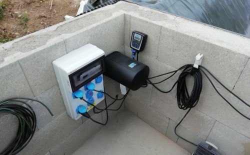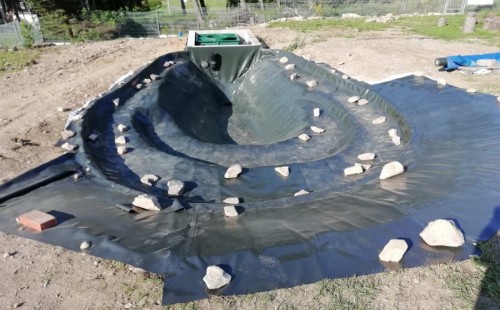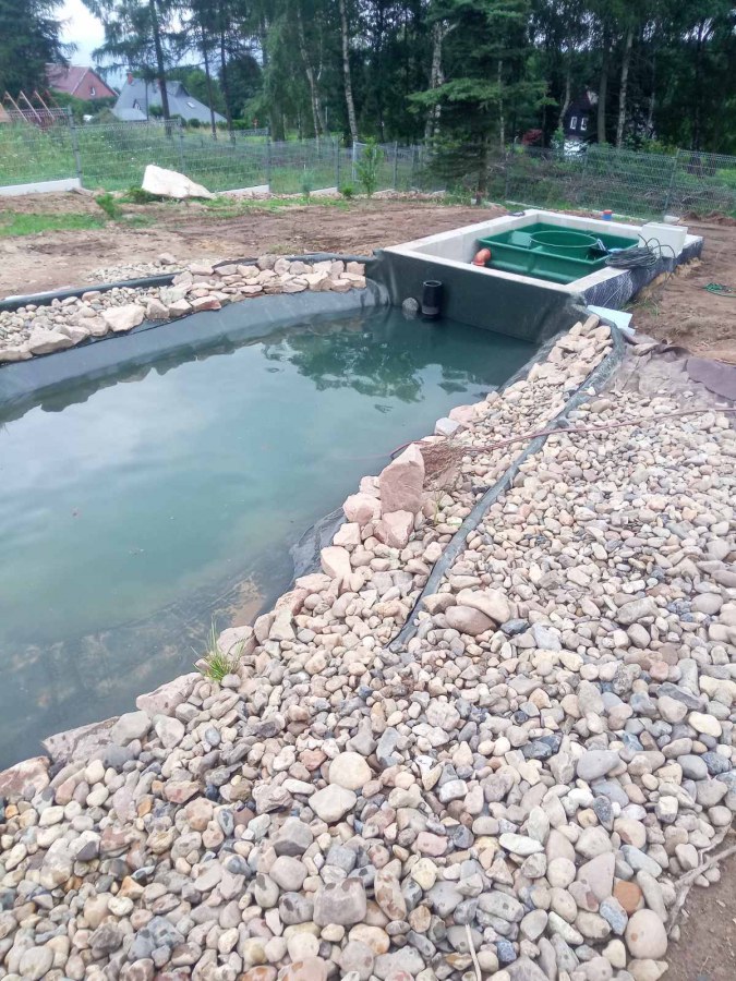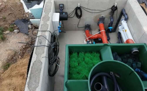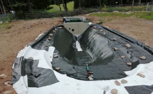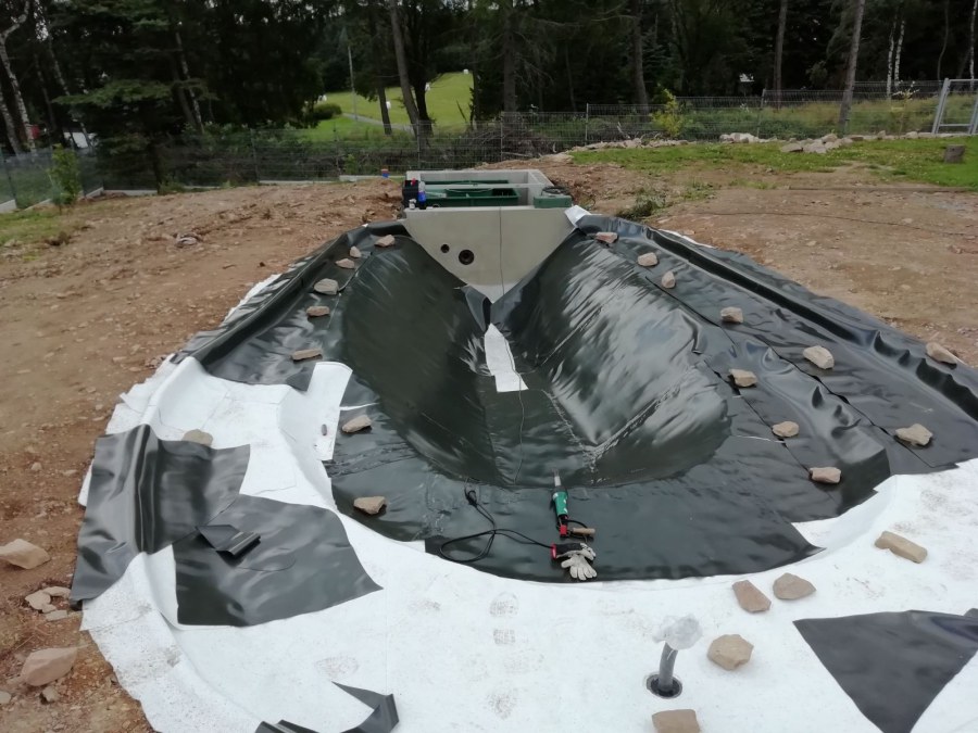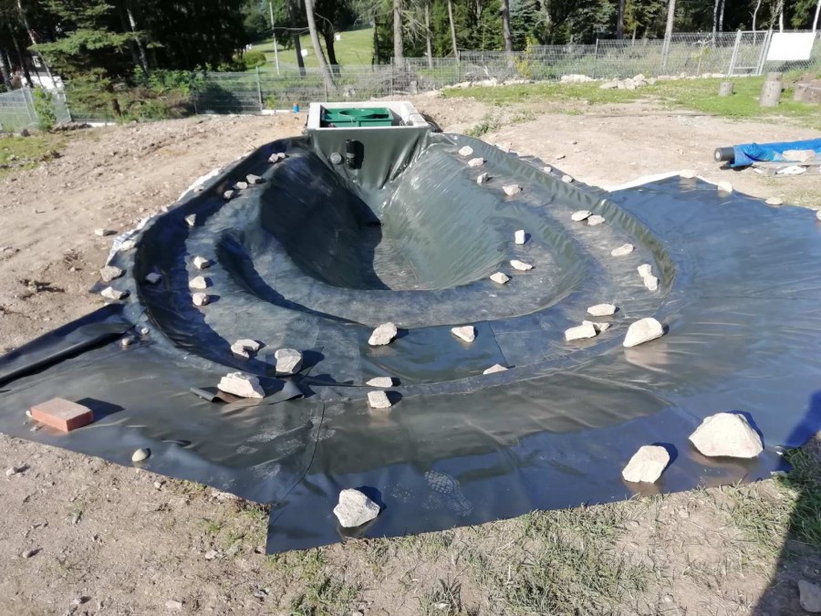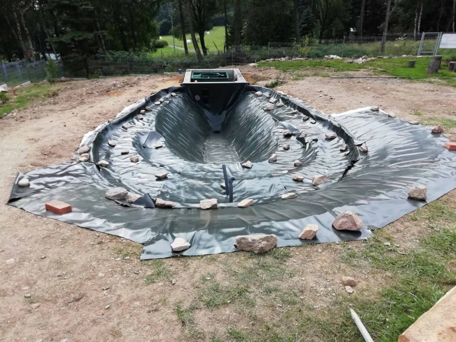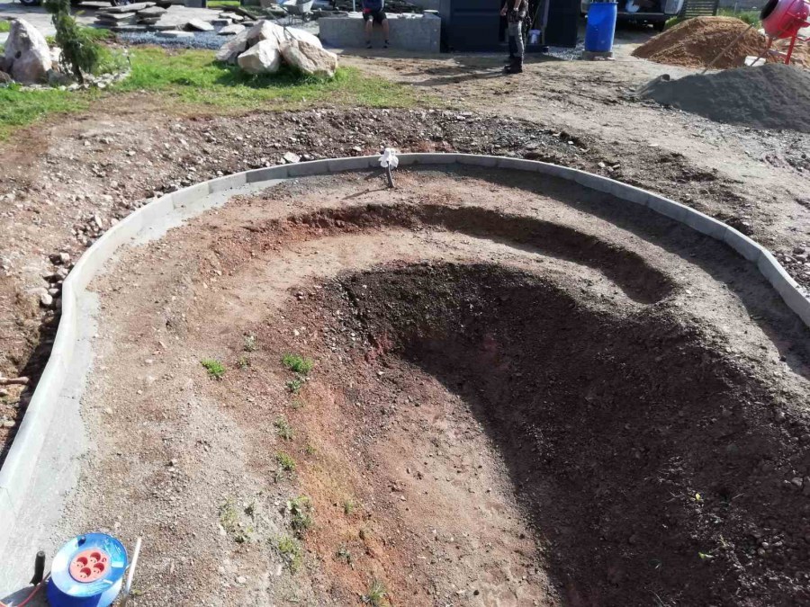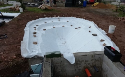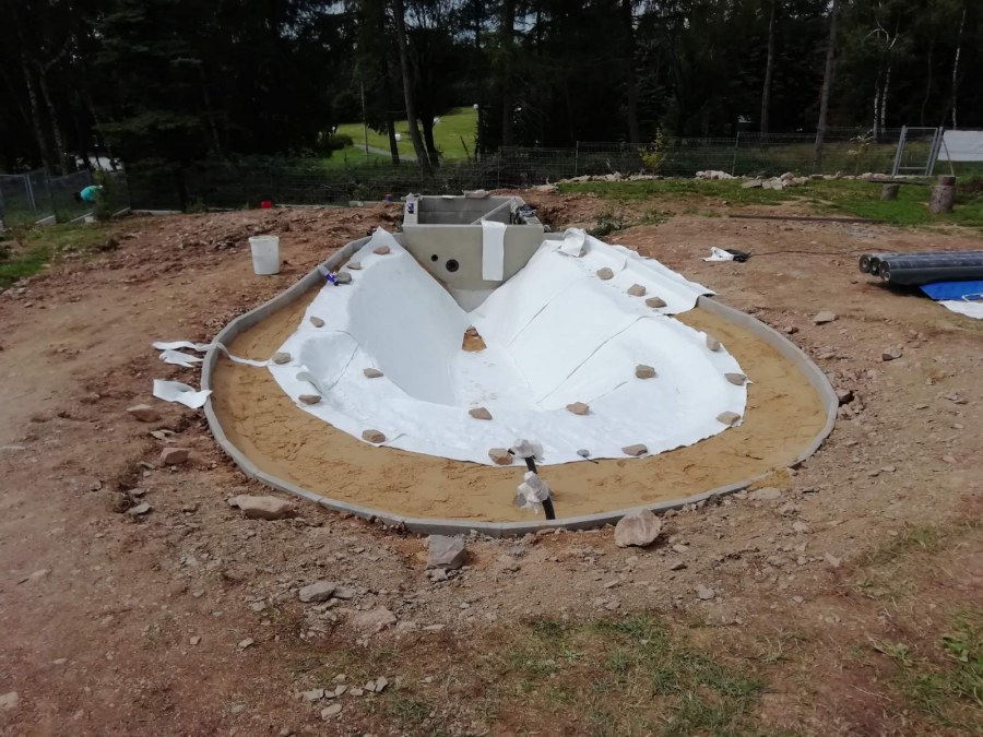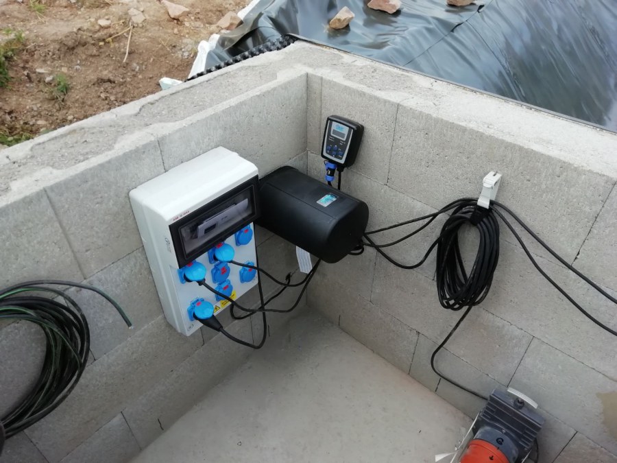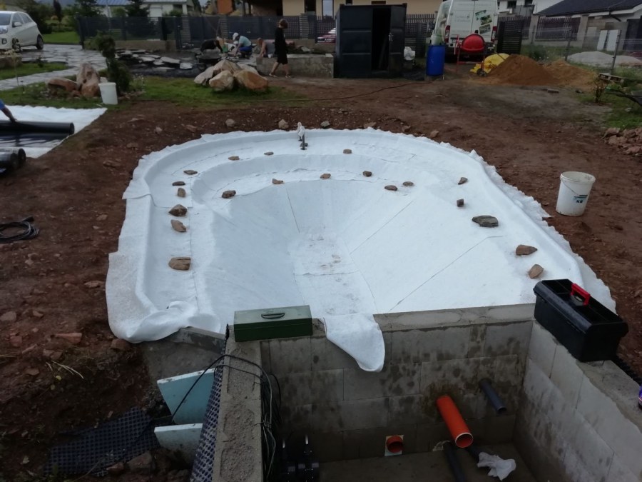 Na začátku léta nás oslovila klientka s přáním o realizaci jezírka na Klínech. Po konzultaci s klientkou na místě realizace jsme navrhli polohu, tvar a technologii. Abychom urychlili průběh prací oslovili jsme externí firmu, která pro nás vykopala hrubý tvar jezírka a postavila technickou místnost ze ztraceného bednění. Poté už naši technici mohli usadit guly, natáhnout potrubí do technické místnosti a připravit vývod pro skimmer Oase AquaSkim Gravity. Pak se dno jezírka vypískovalo kopaným pískem aby se zarovnali nerovnosti, natáhla se geotextílie 500g a začala se svařovat jezírková fólie Fatra Aquaplast 805/V olivově zelená. Jezírko má po napuštění 15m3. Zvolili jsme proto biologicko-mechanický filtr Tripond Center Vortex C50, UV lampu TMC Pro Clear 110W, systémové čerpadlo Oase AquaMax Eco Gravity 10000, na vodopád žene vodu čerpadlo Oase Aquamax Eco 9000C. Vzduchovací motor jak do jezírka, tak do filtru jsme zvolili AquaForte/Hailea V-30. Dokončení břehů a osazení květinami si klientka dodělá sama.