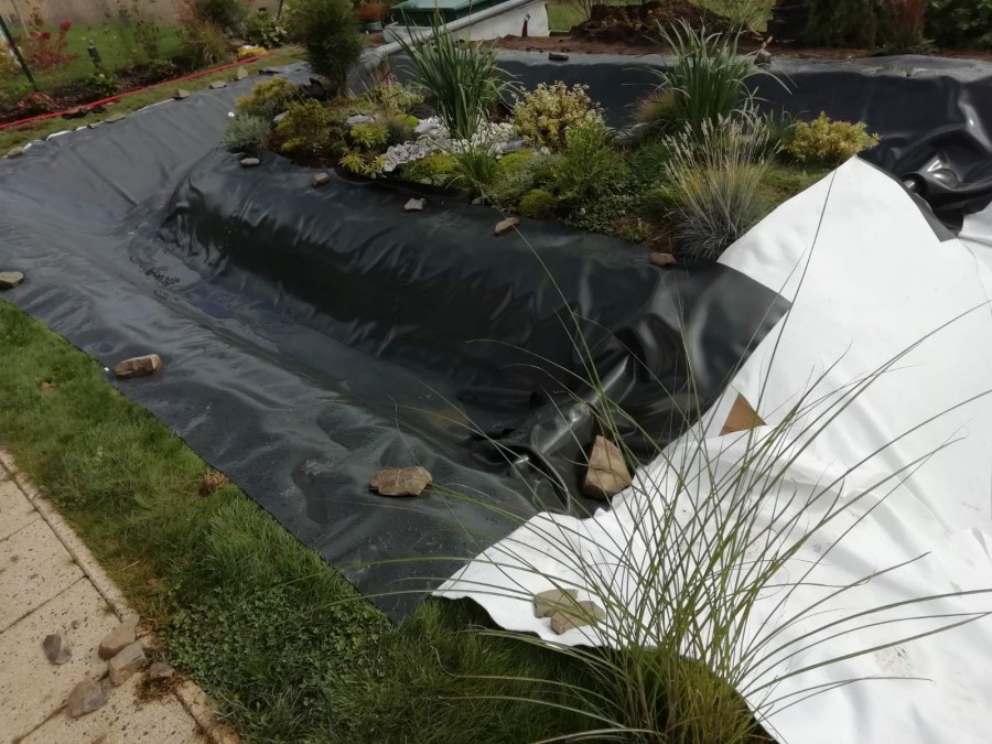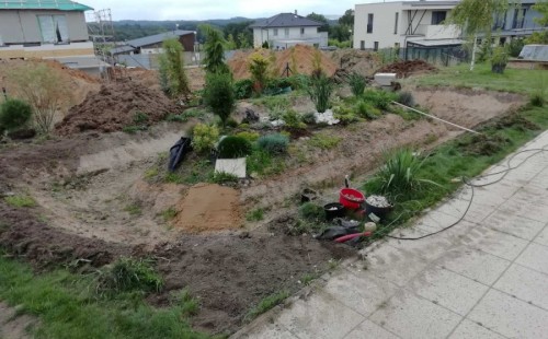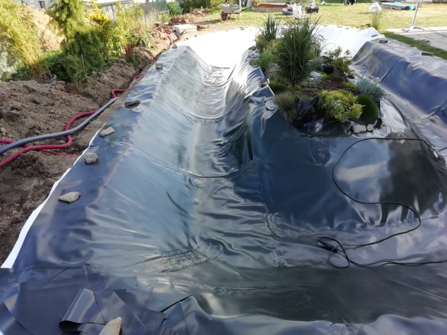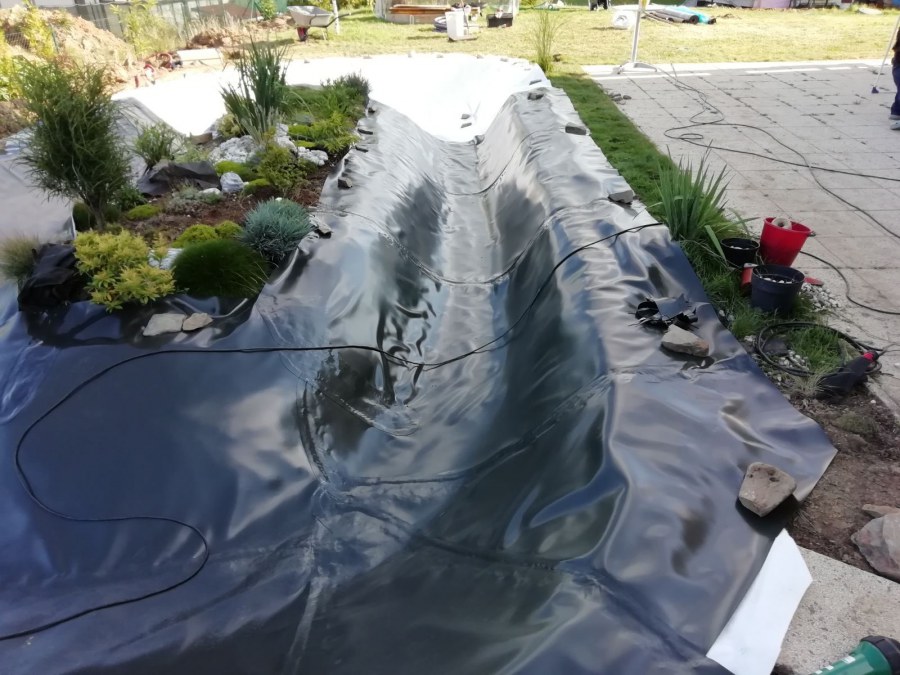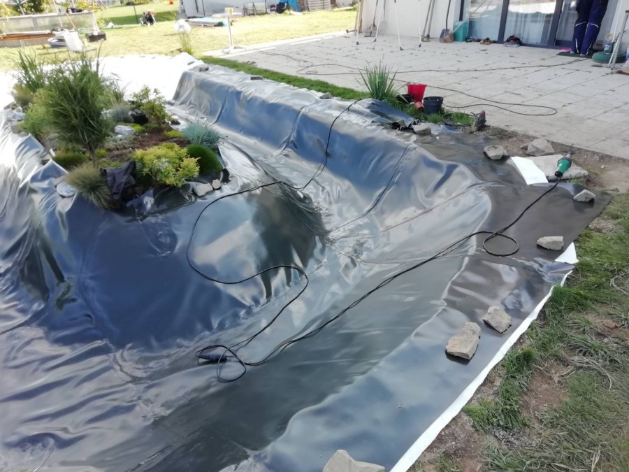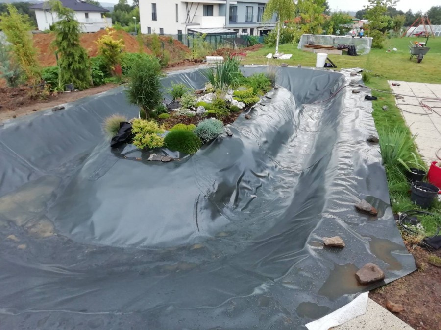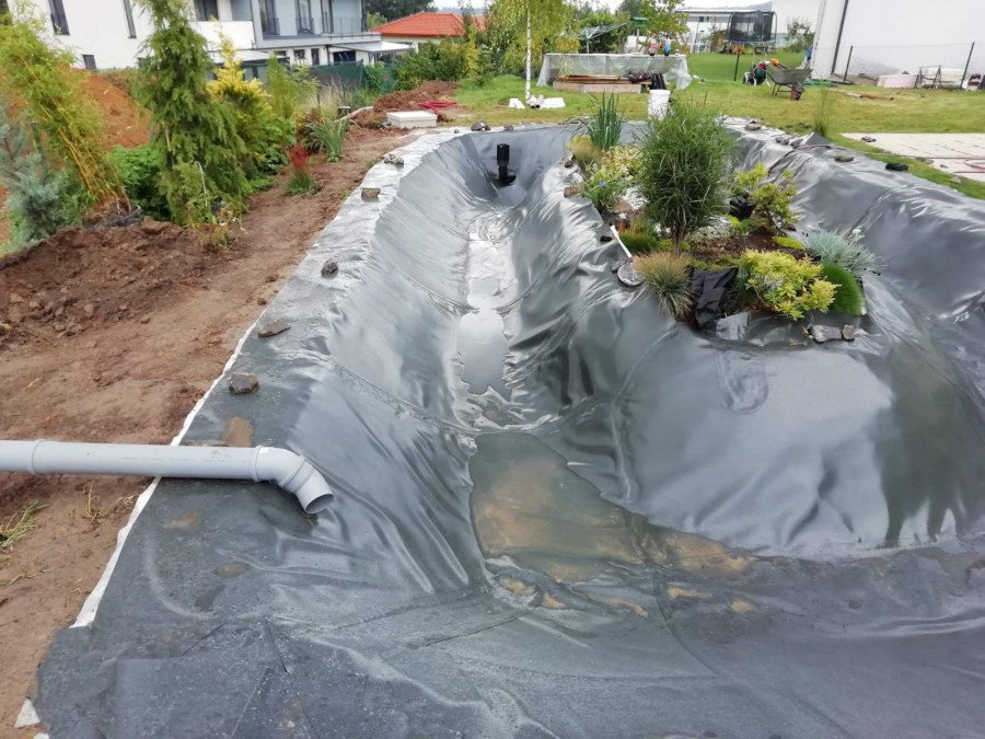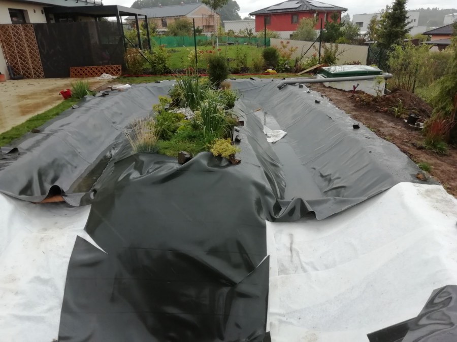 Velmi rádi jsme přijali realizaci tohoto okrasného jezírka. Majitelé nás oslovili s tím, že mají hrubou stavbu připravenou, náš úkol byl jezírko upravit po technické stránce, položit fólii a zapojit technologii. Nejprve bylo nutné upravit povrch, který byl nahrubo vykopaný, usadit guly a potrubí od gule k čerpadlové šachtě a také potrubí pro skimmer Oase AquaSkim Gravity. Čerpadlová šachta se zakopala cca 2m od břehu jezírka, tam se uloží čerpadlo, které požene vodu do filtru. Pro filtr se vystavěla malá technická místnost v rohu zahrady. Po zabetonování gule a fóliové příruby pro skimmer se celé jezírko pokrylo kopaným pískem tak, aby se zarovnali nerovnosti na povrchu. Poté se začalo s pokládkou geotextílie 500g a následně se začala svařovat jezírková fólie Fatra Aquaplast 805/V olivově zelená 1,5mm. Po dokončení fóliování se jezírko začalo napouštět vodou, mezi tím naši technici usadili mechanicko-biologický filtr Tripond Center-Vortex C-50, na něj připojili UV lampu TMC Pro Clear 55W. Vodu k filtru požene čerpadlo Oase AquaMax Eco Classic 11500 uložené v čerpadlové šachtě. Dokončení jezírka jako je usazení kamenů a květin si již klienti udělají sami.