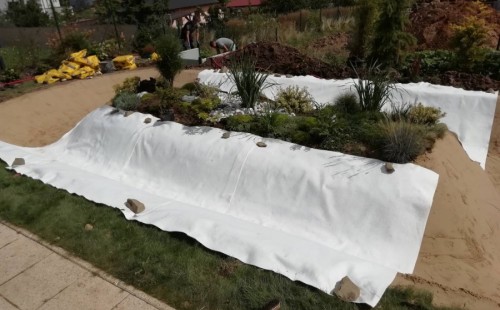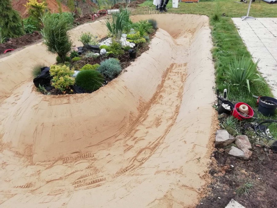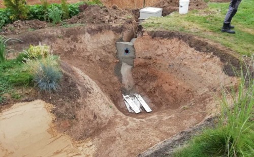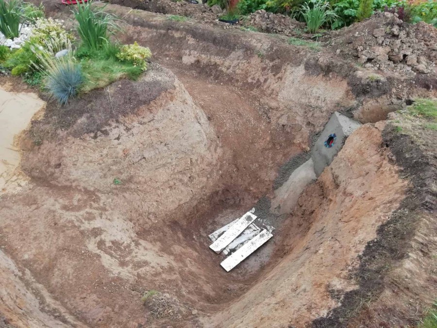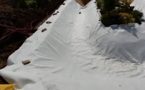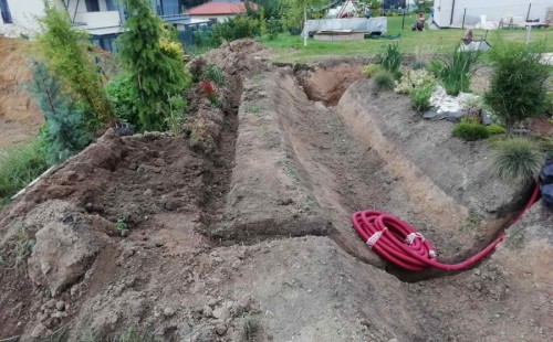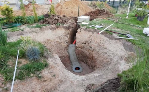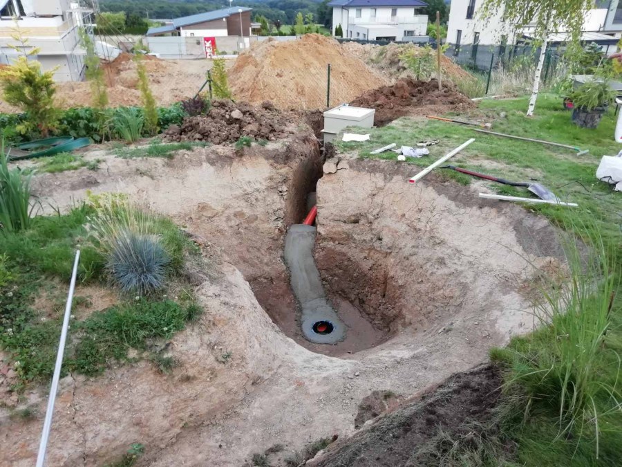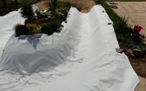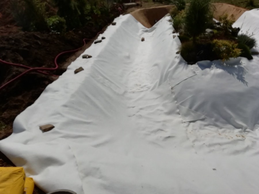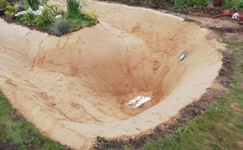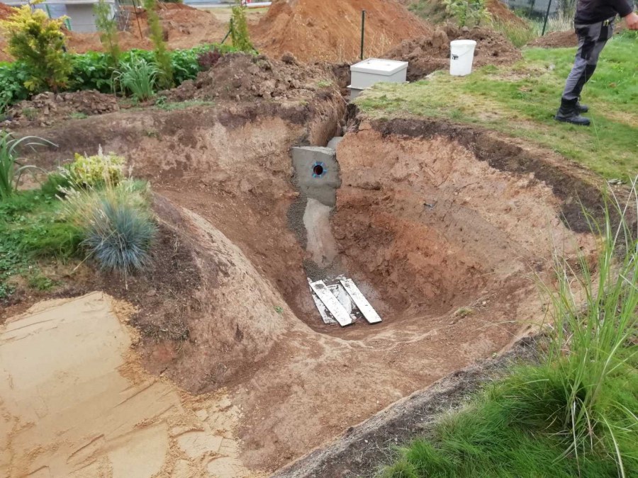 Velmi rádi jsme přijali realizaci tohoto okrasného jezírka. Majitelé nás oslovili s tím, že mají hrubou stavbu připravenou, náš úkol byl jezírko upravit po technické stránce, položit fólii a zapojit technologii. Nejprve bylo nutné upravit povrch, který byl nahrubo vykopaný, usadit guly a potrubí od gule k čerpadlové šachtě a také potrubí pro skimmer Oase AquaSkim Gravity. Čerpadlová šachta se zakopala cca 2m od břehu jezírka, tam se uloží čerpadlo, které požene vodu do filtru. Pro filtr se vystavěla malá technická místnost v rohu zahrady. Po zabetonování gule a fóliové příruby pro skimmer se celé jezírko pokrylo kopaným pískem tak, aby se zarovnali nerovnosti na povrchu. Poté se začalo s pokládkou geotextílie 500g a následně se začala svařovat jezírková fólie Fatra Aquaplast 805/V olivově zelená 1,5mm. Po dokončení fóliování se jezírko začalo napouštět vodou, mezi tím naši technici usadili mechanicko-biologický filtr Tripond Center-Vortex C-50, na něj připojili UV lampu TMC Pro Clear 55W. Vodu k filtru požene čerpadlo Oase AquaMax Eco Classic 11500 uložené v čerpadlové šachtě. Dokončení jezírka jako je usazení kamenů a květin si již klienti udělají sami.