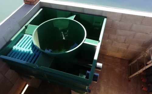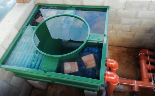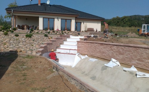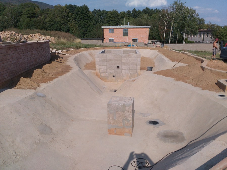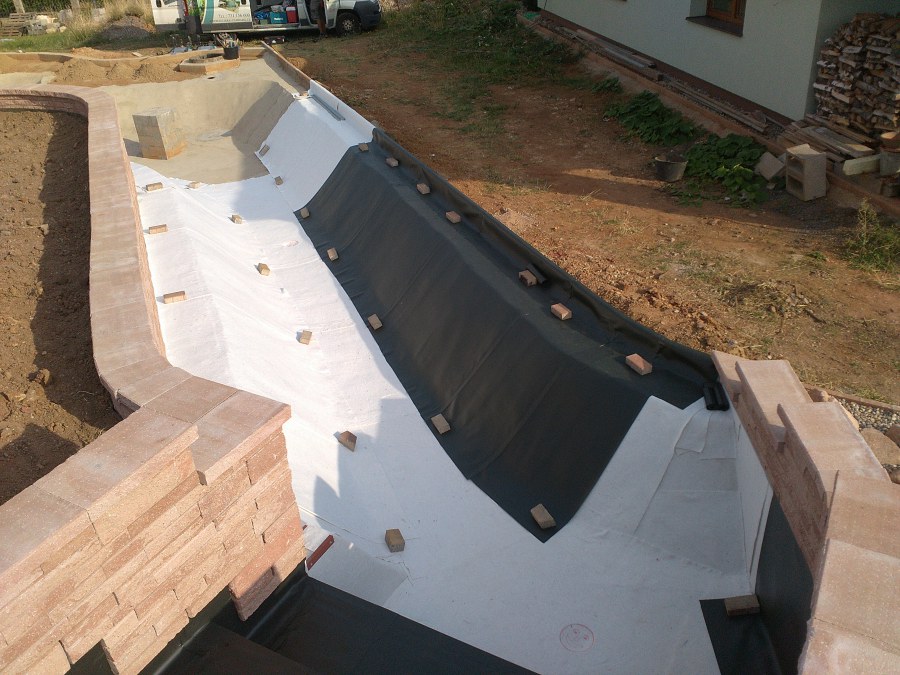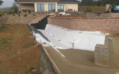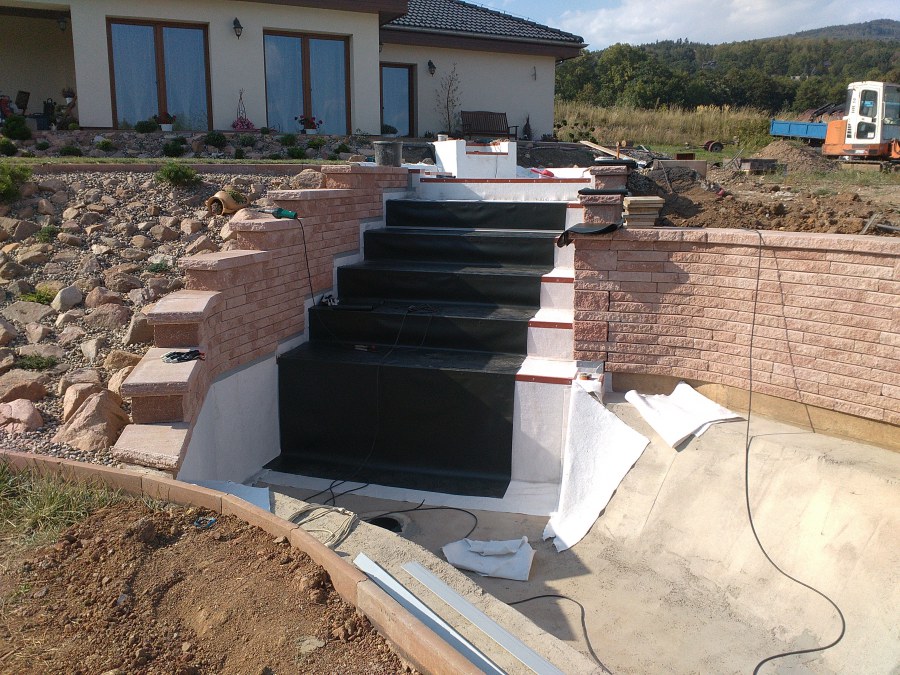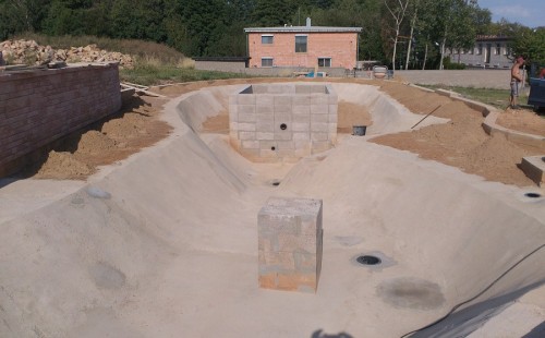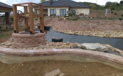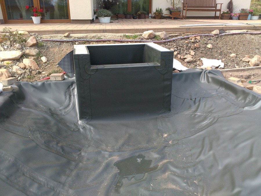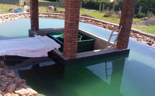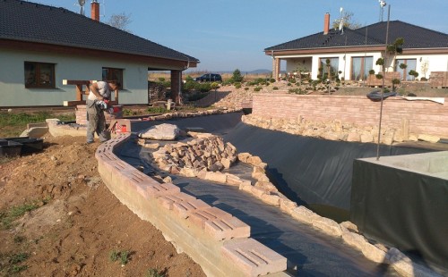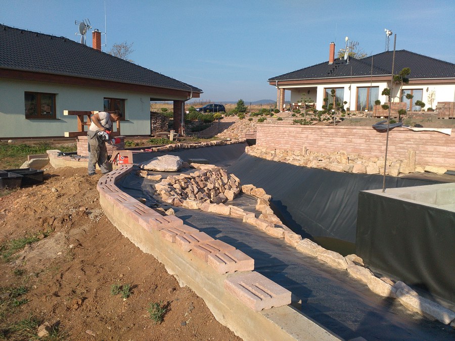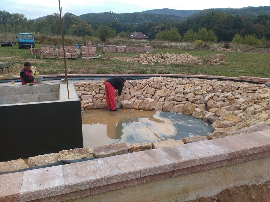 V roce 2018 jsme začali s realizací stavby rozsáhlého komplexu jezírek u Teplic. Opět se začalo zaměřením a přesným rozplánováním prací. Pozemek je kaskádovitý, takže stavba vodopádu byla samozřejmá. V první části prací se zaměřovalo a bagrovalo, dále se postavila technická místnost, zcela netypicky uprostřed jezírka, usadili se gule a udělali se rozvody potrubí k technické místnosti. Po zarovnání nerovných povrchů se jezírko zapískovalo a pokrylo slabou vrstvou betonu. Poté se začala pokládat geotextílie 500g a svařovat jezírková folie Fatra Aquaplast 805/V olivově zelená dle tvaru jezírka. Nakonec se začali na okraje skládat kameny. Dále si klient sám dolaďoval detaily jako dostavbu technické místnosti, stavbu mol, osazování květinami apod. Nakonec jsme dodali technologii, celý komplex má cca 70m3, vhodný filtr necháme vyrobit na míru, prozatím byl nainstalován biologicko-mechanický filtr Tripond Vortex C115, 2x UV lampa TMC Pro Pond Advantage 110W a systémové čerpadlo Oase AquaMax Eco Expert 44000 a efektové čerpadlo Oase AquaMax Eco Titanium 51000.