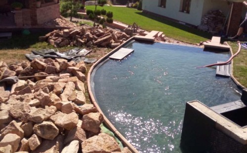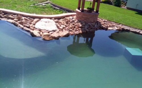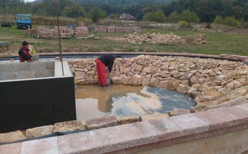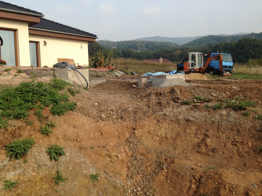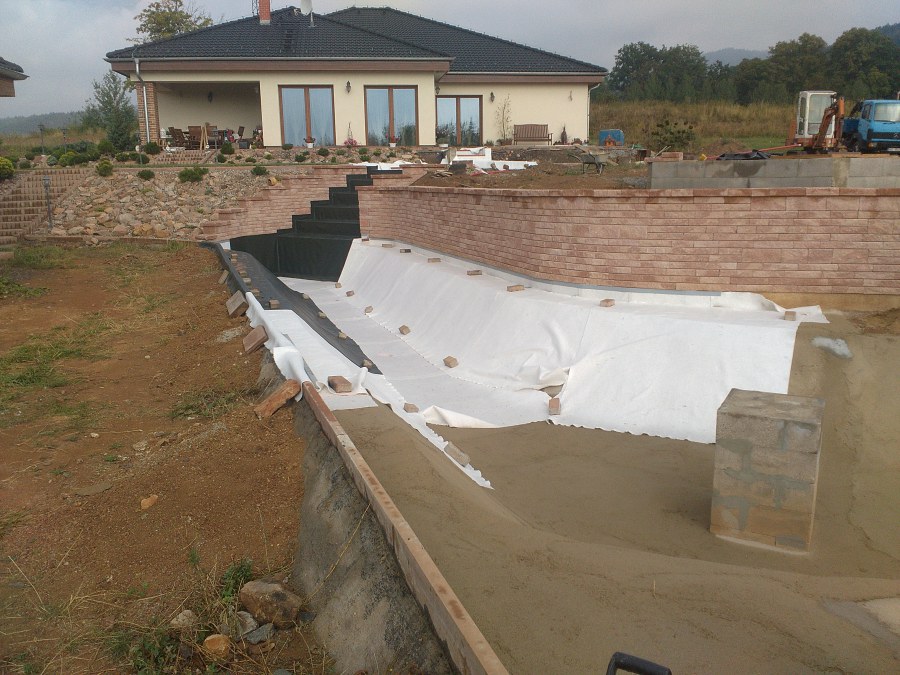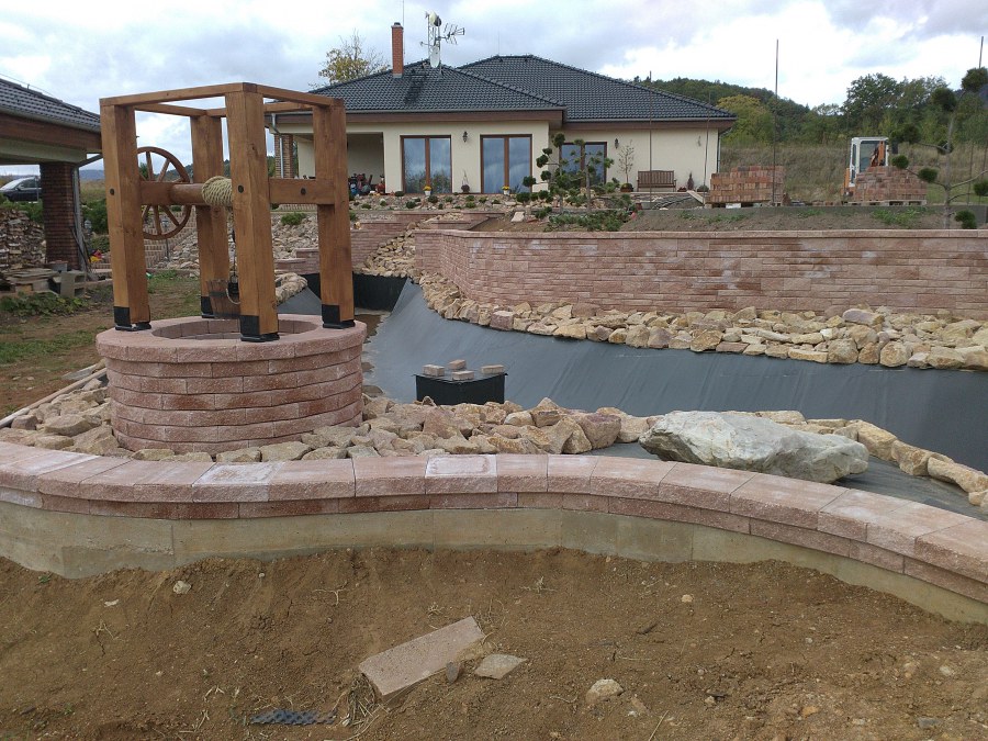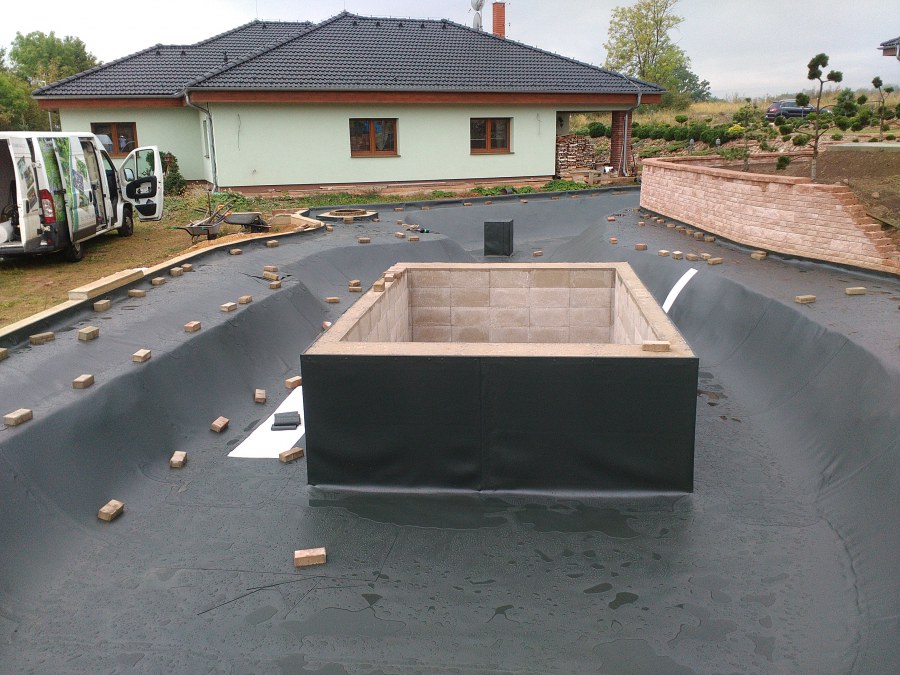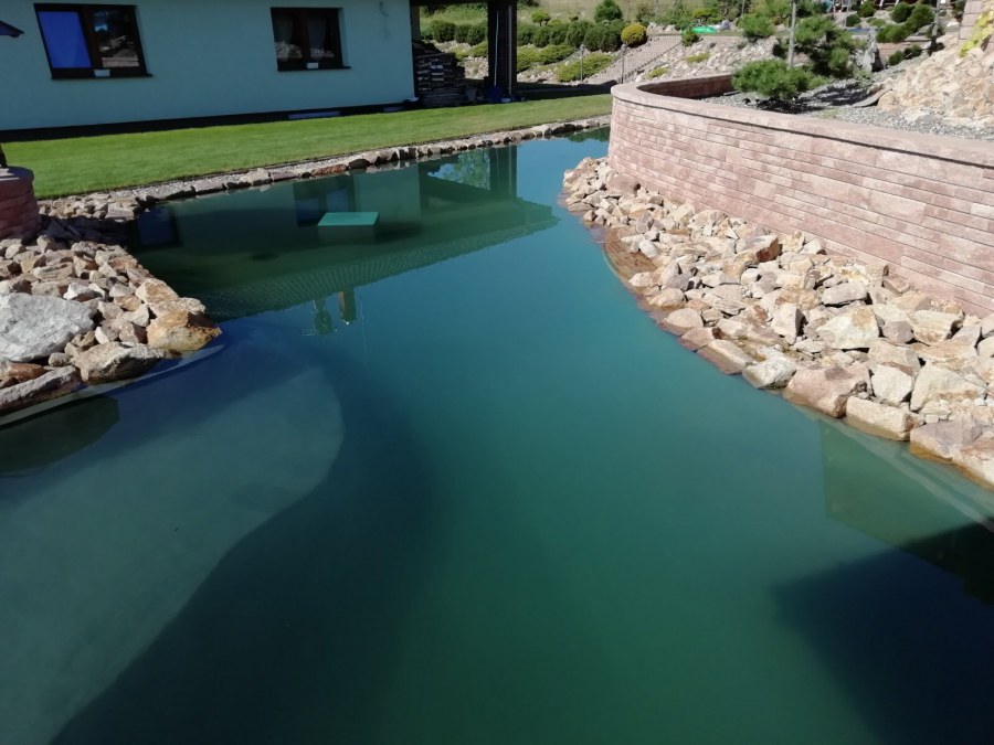 V roce 2018 jsme začali s realizací stavby rozsáhlého komplexu jezírek u Teplic. Opět se začalo zaměřením a přesným rozplánováním prací. Pozemek je kaskádovitý, takže stavba vodopádu byla samozřejmá. V první části prací se zaměřovalo a bagrovalo, dále se postavila technická místnost, zcela netypicky uprostřed jezírka, usadili se gule a udělali se rozvody potrubí k technické místnosti. Po zarovnání nerovných povrchů se jezírko zapískovalo a pokrylo slabou vrstvou betonu. Poté se začala pokládat geotextílie 500g a svařovat jezírková folie Fatra Aquaplast 805/V olivově zelená dle tvaru jezírka. Nakonec se začali na okraje skládat kameny. Dále si klient sám dolaďoval detaily jako dostavbu technické místnosti, stavbu mol, osazování květinami apod. Nakonec jsme dodali technologii, celý komplex má cca 70m3, vhodný filtr necháme vyrobit na míru, prozatím byl nainstalován biologicko-mechanický filtr Tripond Vortex C115, 2x UV lampa TMC Pro Pond Advantage 110W a systémové čerpadlo Oase AquaMax Eco Expert 44000 a efektové čerpadlo Oase AquaMax Eco Titanium 51000.