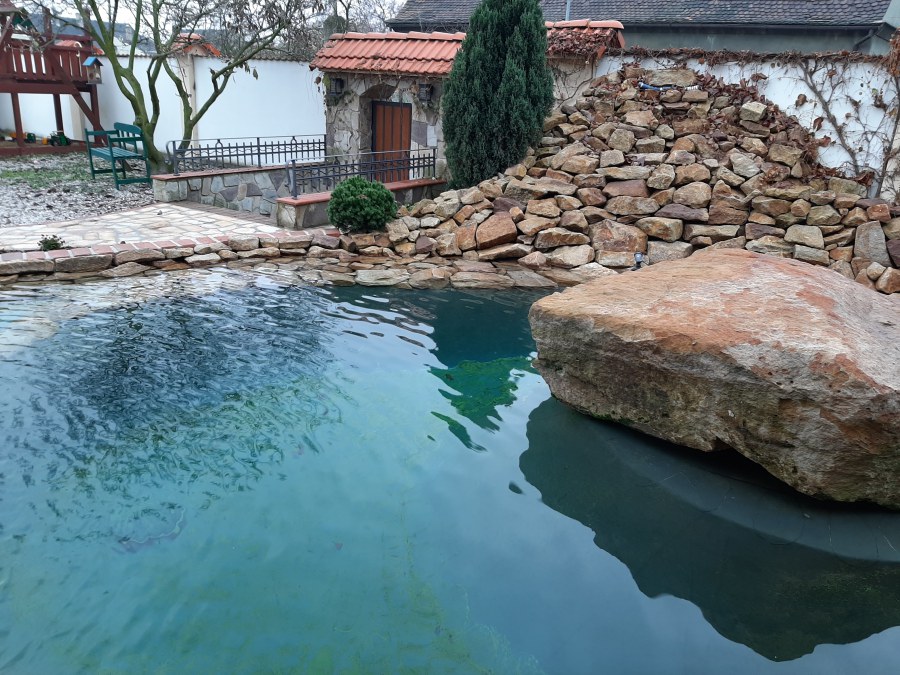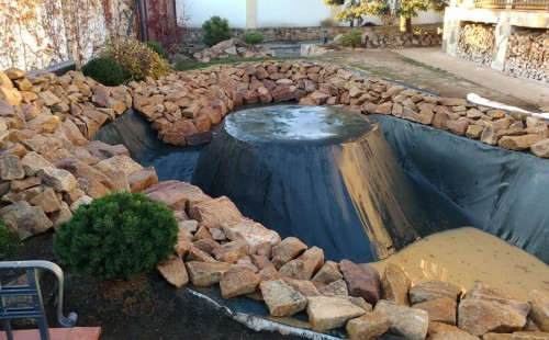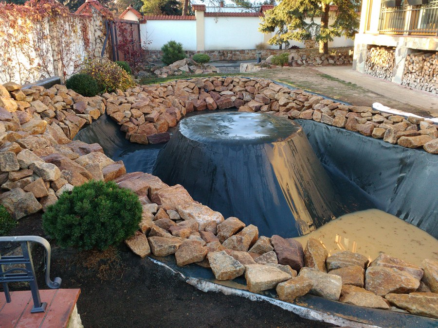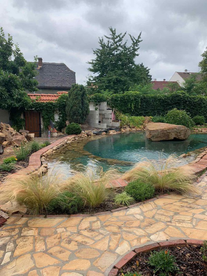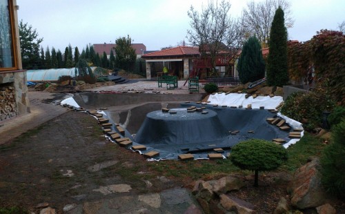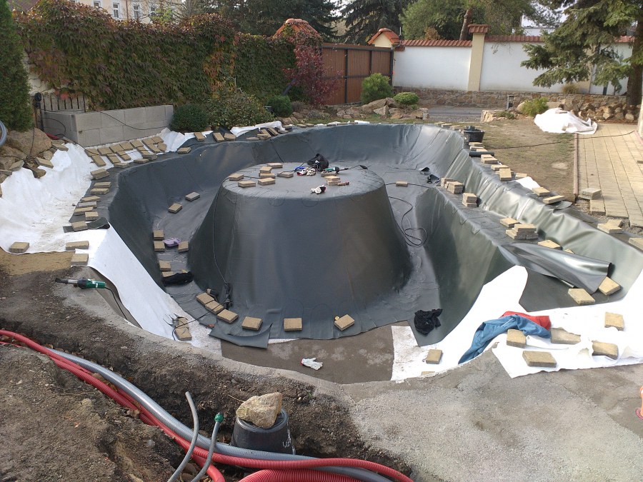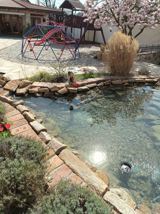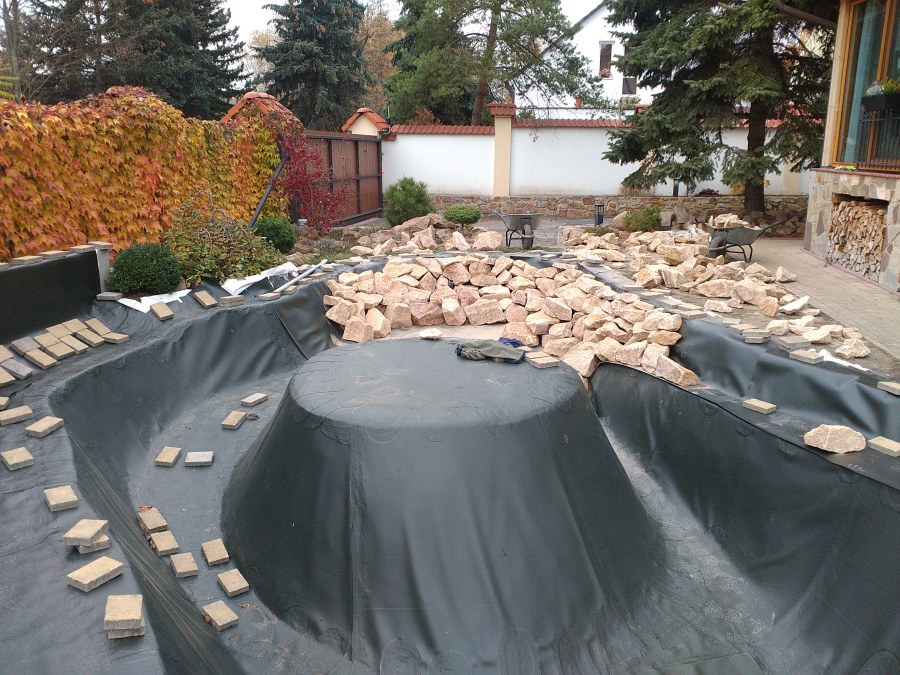 V roce 2018  nás oslovil velmi náročný klient s žádostí o výstavbu okrasného jezírka o velikosti 30m3, potůčku a vodopádu. Po vymezení a zakreslení tvaru jezírka, potůčku a technické místnosti začali výkopové práce. Na dno se položila gule a na bok jezírka se připevnila fóliová příruba pro skimmer Oase AquaSkim Gravity a natáhlo se potrubí a hadice z jezírka do technické místnosti, která se začala stavět ze ztraceného bednění. Uprostřed jezírka jsme nechali ostrůvek na který se později položí velký kámen. Dno a boky jezírka jsme zapískovali kopaným pískem a zabetonovali, následně se položila geotextílie 500g a svařila folie Fatra Aquaplast 805/V olivově zelená dle tvaru jezírka. Zároveň se pracovalo na potůčku a vodopádu. Potůček začíná u technické místnosti a táhne se cca 5m k jezírku, vodu do něj žene zvláštní čerpadlo Oase AquaMax Eco Premium 16000 ,které se dá dle potřeby vypnout. Pro toto jezírko byla navržena technologie mechanicko-biologického filtru Tripond Vortex C115, UV lampa TMC Pro Pond Advanage 110W a systémové čerpadlo Oase AquaMax Gravity Eco 20000. Vzduchování do filtru i do jezírka jsme zvolili Hailea HAP-60. Pro ulehčení údržby jsme klientovi doporučili automatické dopouštění Oase ProfiClear Guard.
