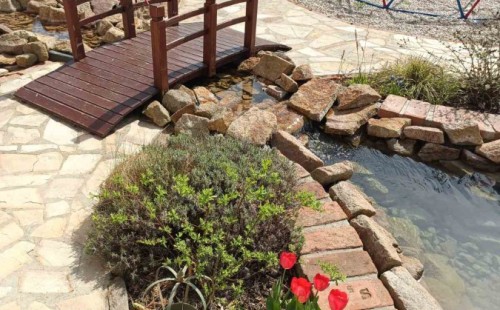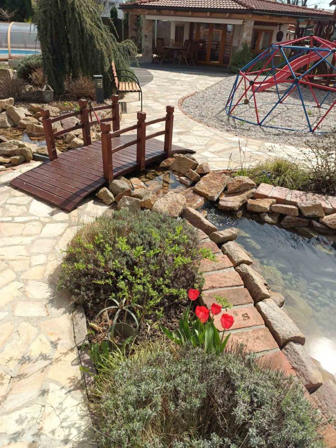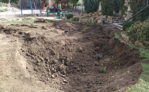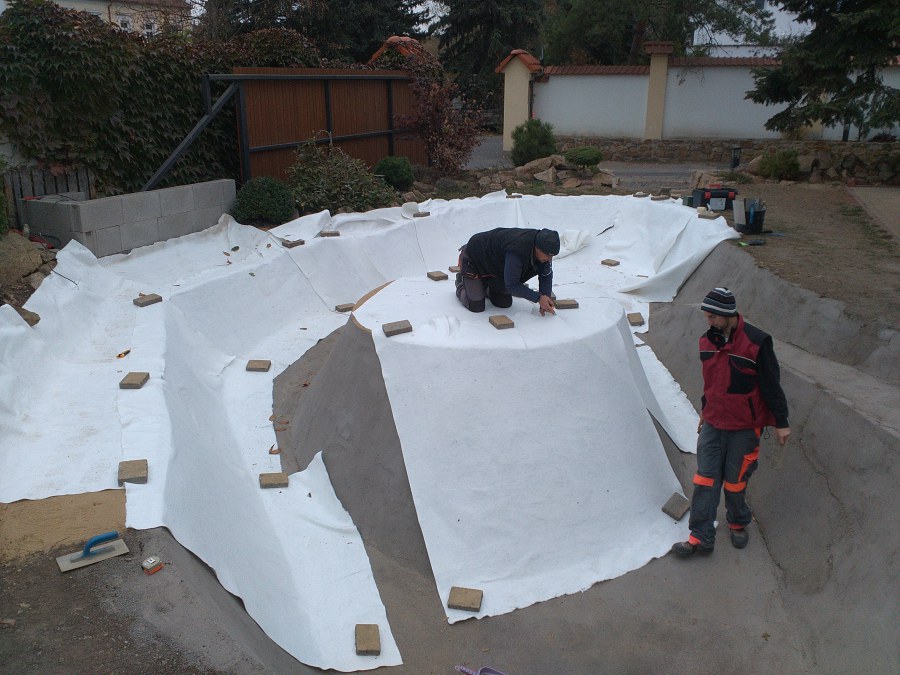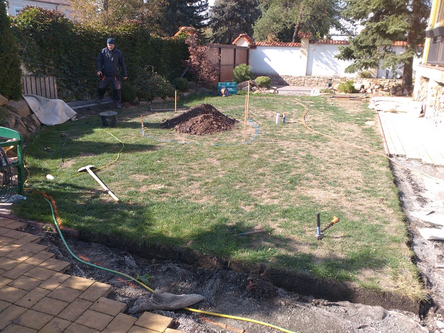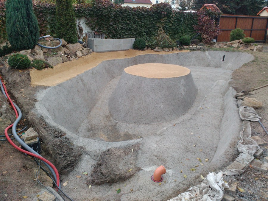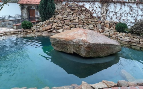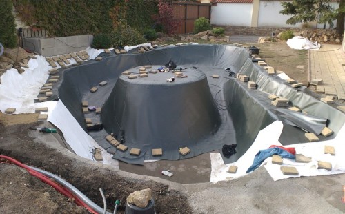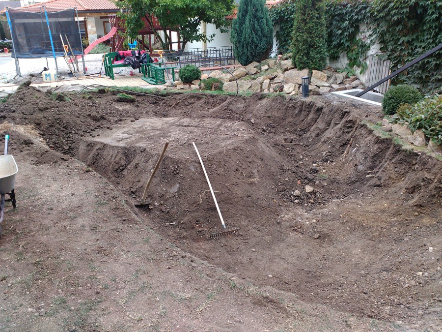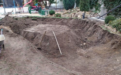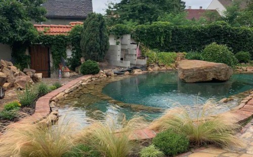 V roce 2018  nás oslovil velmi náročný klient s žádostí o výstavbu okrasného jezírka o velikosti 30m3, potůčku a vodopádu. Po vymezení a zakreslení tvaru jezírka, potůčku a technické místnosti začali výkopové práce. Na dno se položila gule a na bok jezírka se připevnila fóliová příruba pro skimmer Oase AquaSkim Gravity a natáhlo se potrubí a hadice z jezírka do technické místnosti, která se začala stavět ze ztraceného bednění. Uprostřed jezírka jsme nechali ostrůvek na který se později položí velký kámen. Dno a boky jezírka jsme zapískovali kopaným pískem a zabetonovali, následně se položila geotextílie 500g a svařila folie Fatra Aquaplast 805/V olivově zelená dle tvaru jezírka. Zároveň se pracovalo na potůčku a vodopádu. Potůček začíná u technické místnosti a táhne se cca 5m k jezírku, vodu do něj žene zvláštní čerpadlo Oase AquaMax Eco Premium 16000 ,které se dá dle potřeby vypnout. Pro toto jezírko byla navržena technologie mechanicko-biologického filtru Tripond Vortex C115, UV lampa TMC Pro Pond Advanage 110W a systémové čerpadlo Oase AquaMax Gravity Eco 20000. Vzduchování do filtru i do jezírka jsme zvolili Hailea HAP-60. Pro ulehčení údržby jsme klientovi doporučili automatické dopouštění Oase ProfiClear Guard.