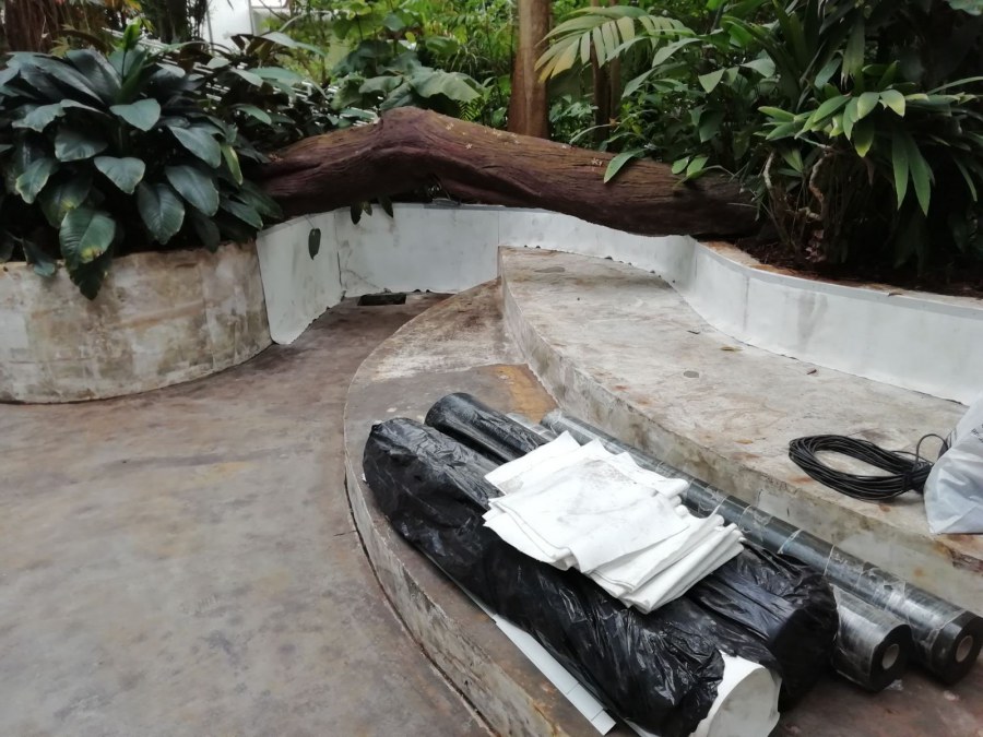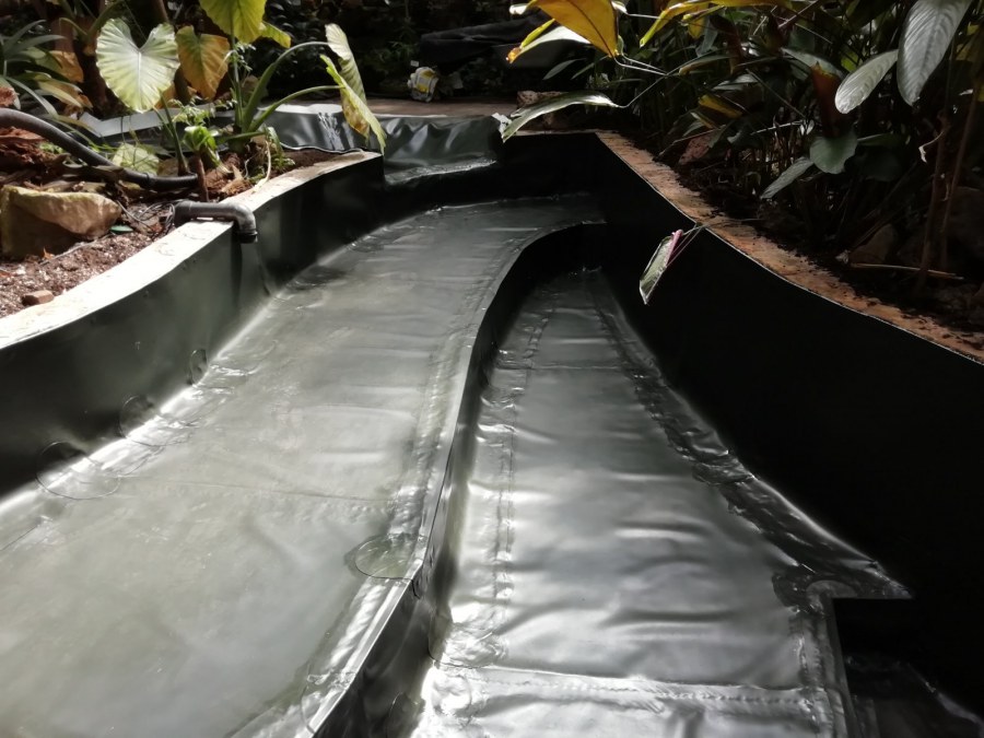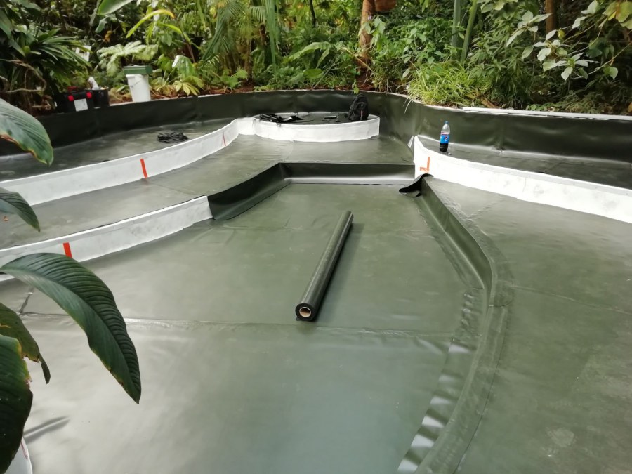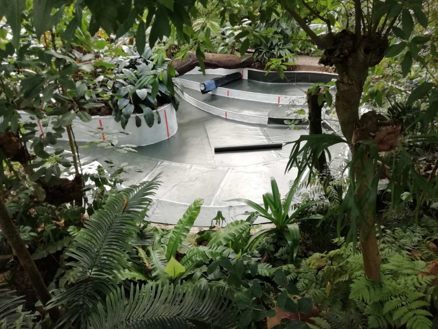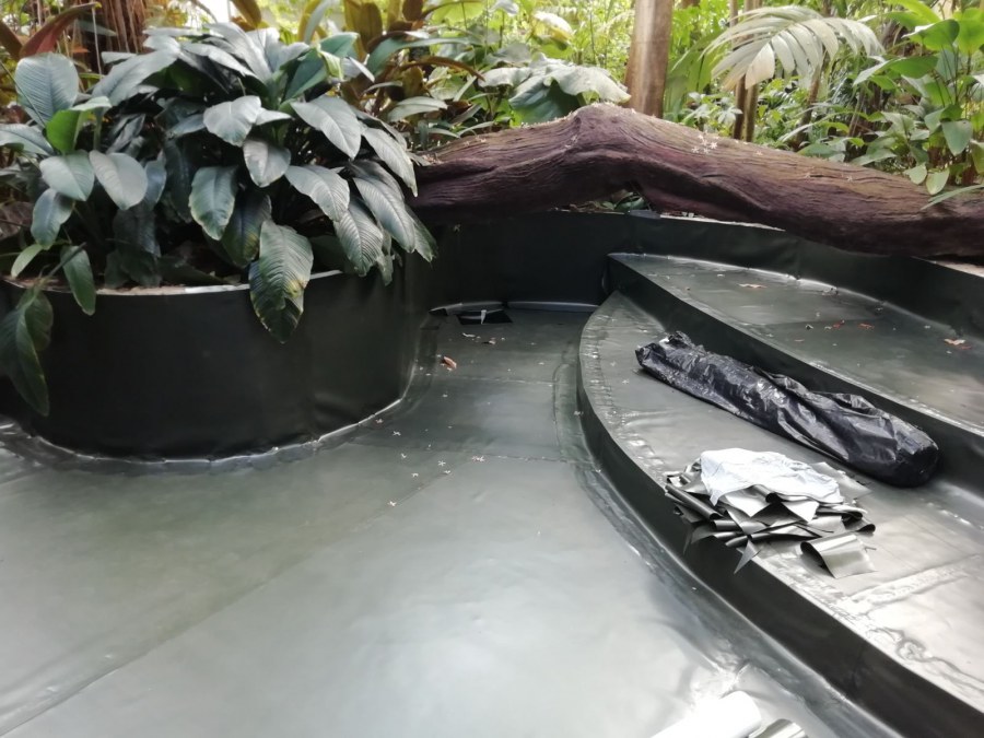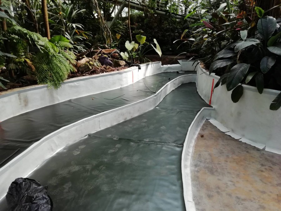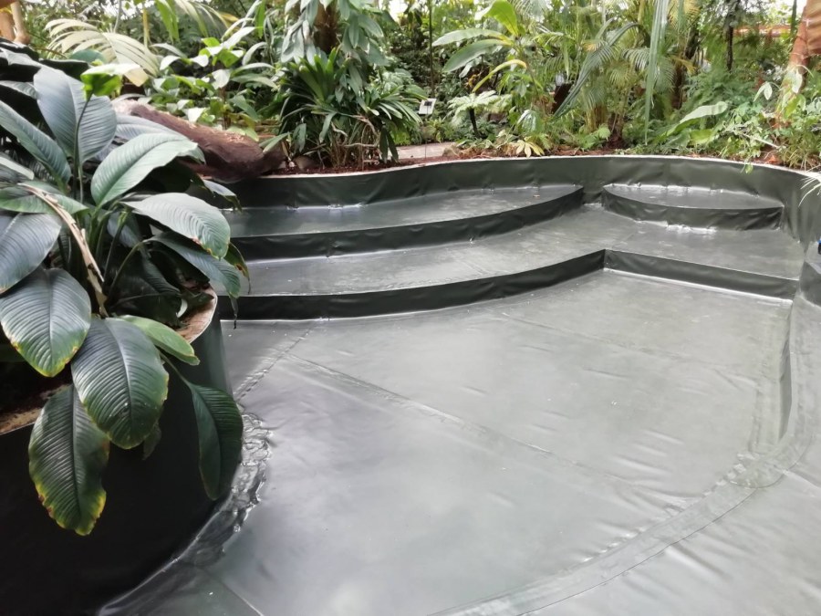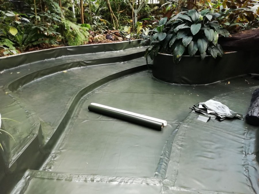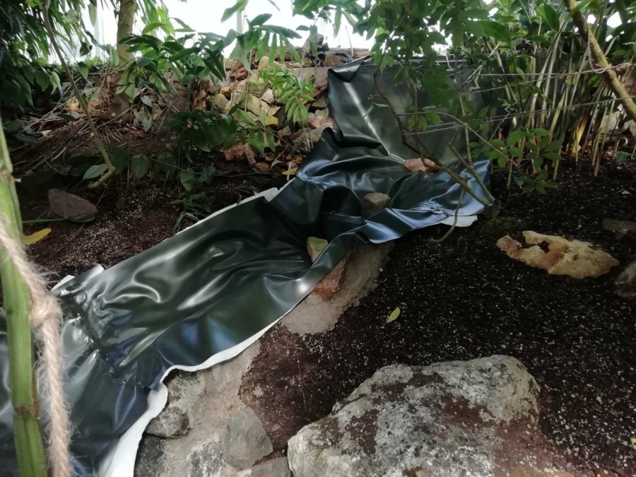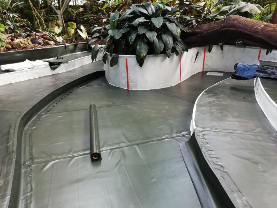 Velice rádi jsme přijali tuto zakázku opravy a vyfóliování jezírka v Botanické zahradě v Teplicích. Při konzultaci na místě jsme domluvili, že zaměstnanci sami zlikvidují starou fólii a vyčistí dno jezírka a potoky. Poté mohli začít naši technici s pokládkou fólie. Nejprve se položila fólie do potoků a pak se začalo s pokládkou fólie do jezírka. Jako první se položila geotextílie 500g, na hrany se přivrtali fóliové lišty a na ně se navařila fólie Fatra Aquaplast 805/V olivově zelená, přesně dle tvaru jezírka. Jezírko je zatím bez technologie.
