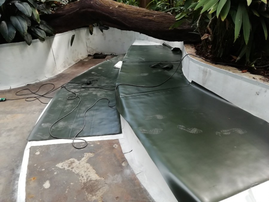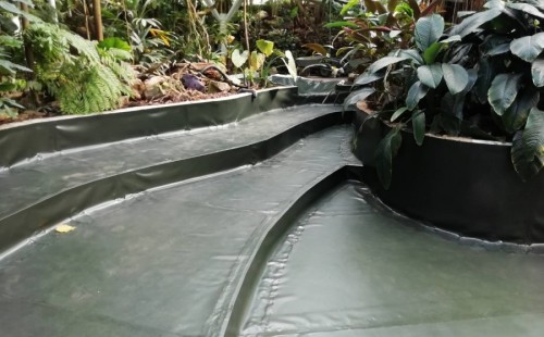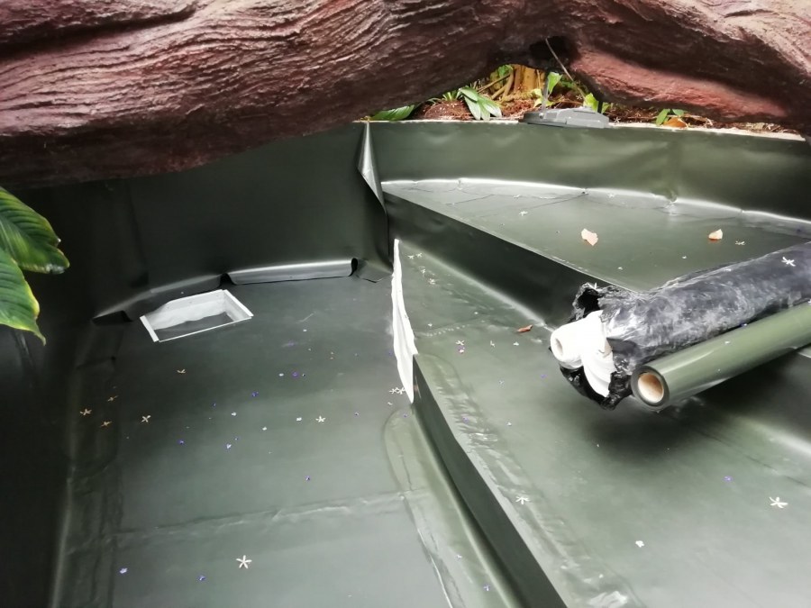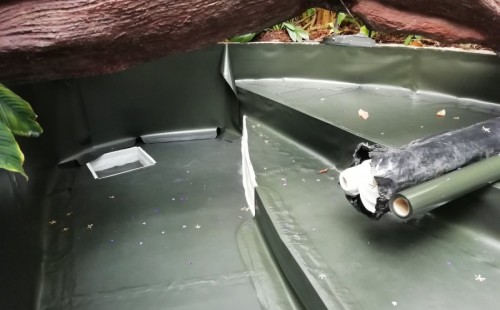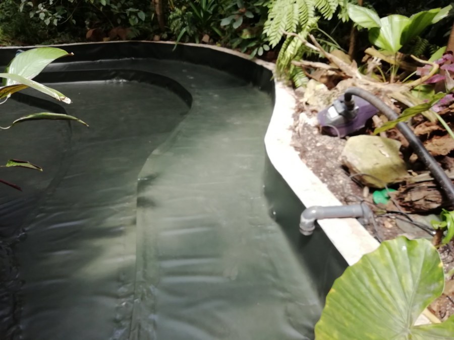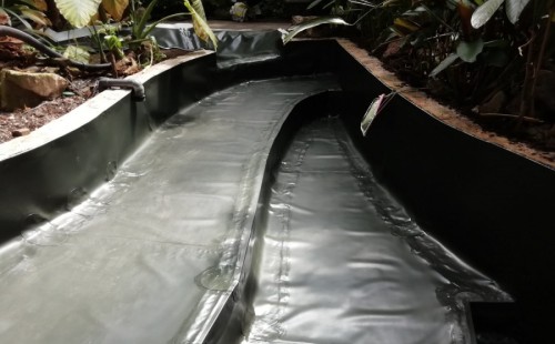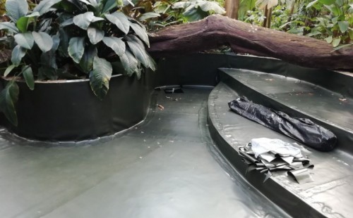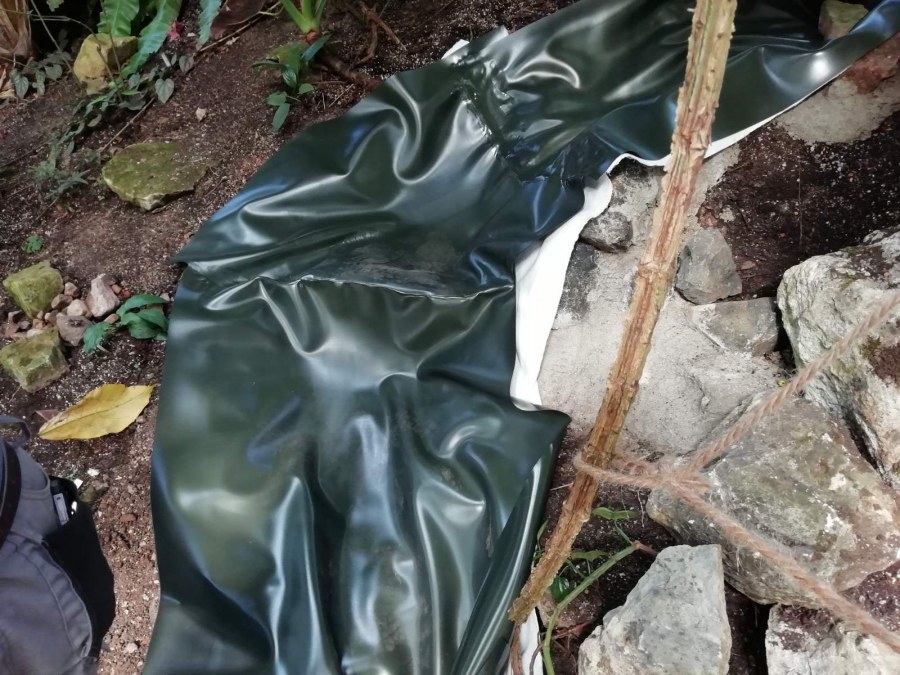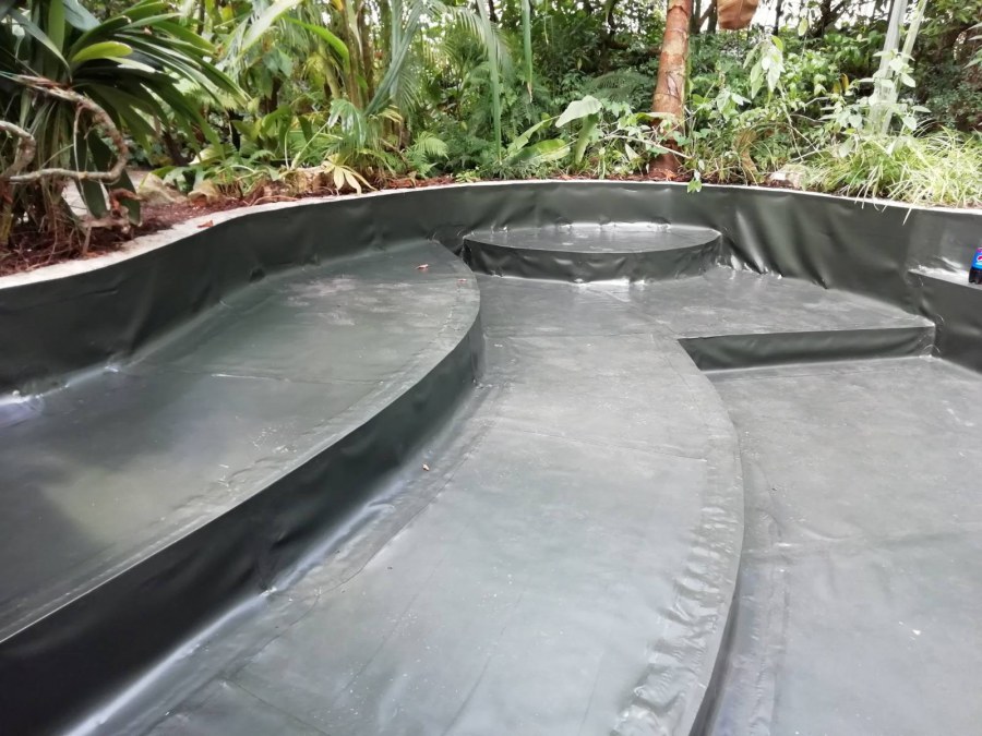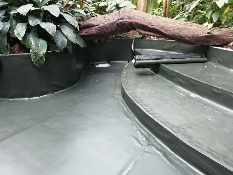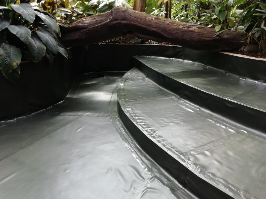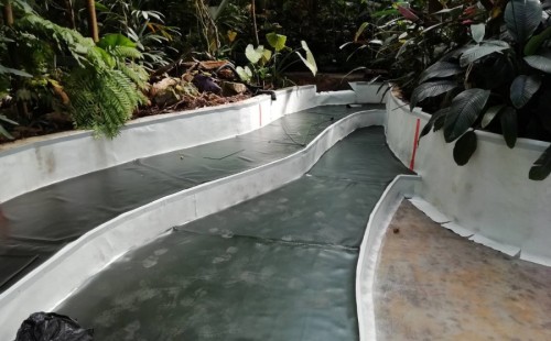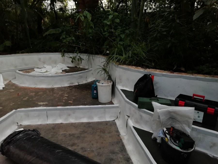 Velice rádi jsme přijali tuto zakázku opravy a vyfóliování jezírka v Botanické zahradě v Teplicích. Při konzultaci na místě jsme domluvili, že zaměstnanci sami zlikvidují starou fólii a vyčistí dno jezírka a potoky. Poté mohli začít naši technici s pokládkou fólie. Nejprve se položila fólie do potoků a pak se začalo s pokládkou fólie do jezírka. Jako první se položila geotextílie 500g, na hrany se přivrtali fóliové lišty a na ně se navařila fólie Fatra Aquaplast 805/V olivově zelená, přesně dle tvaru jezírka. Jezírko je zatím bez technologie.