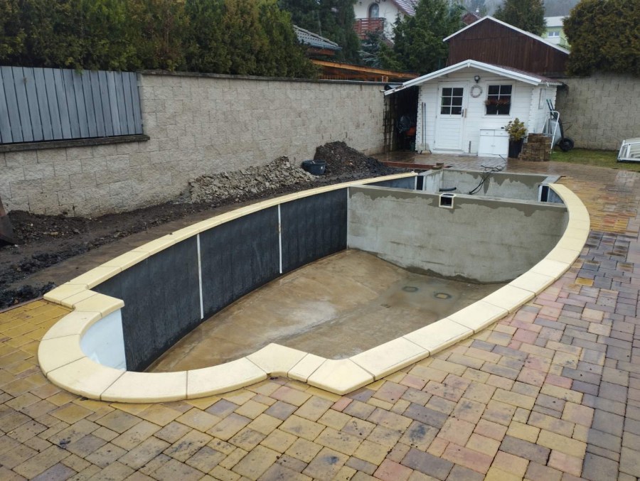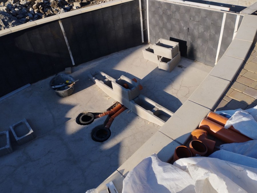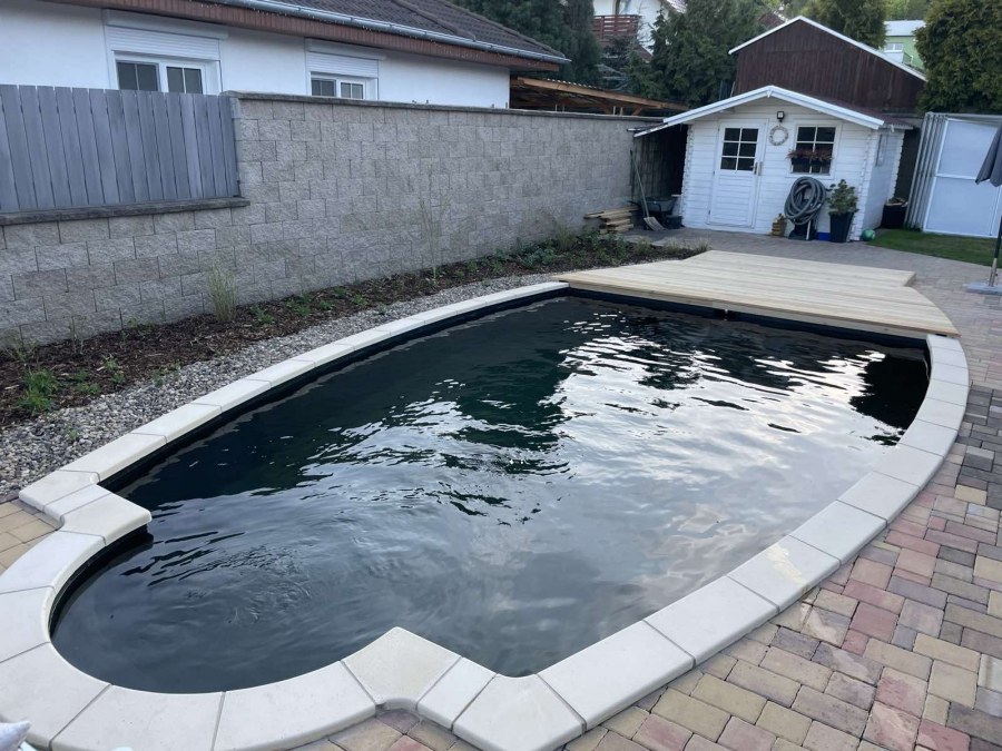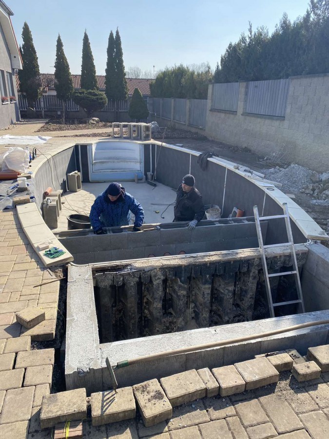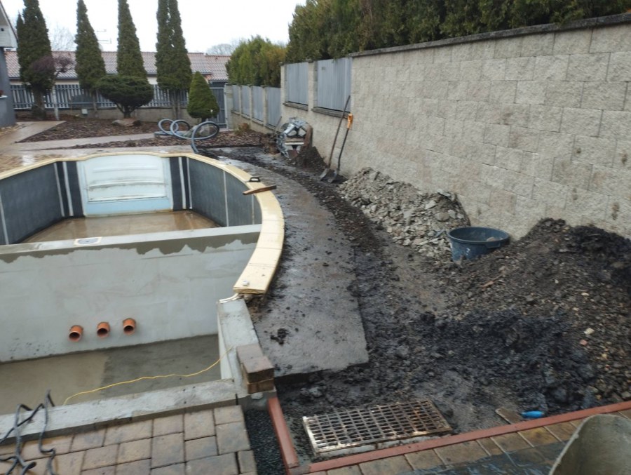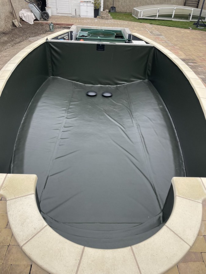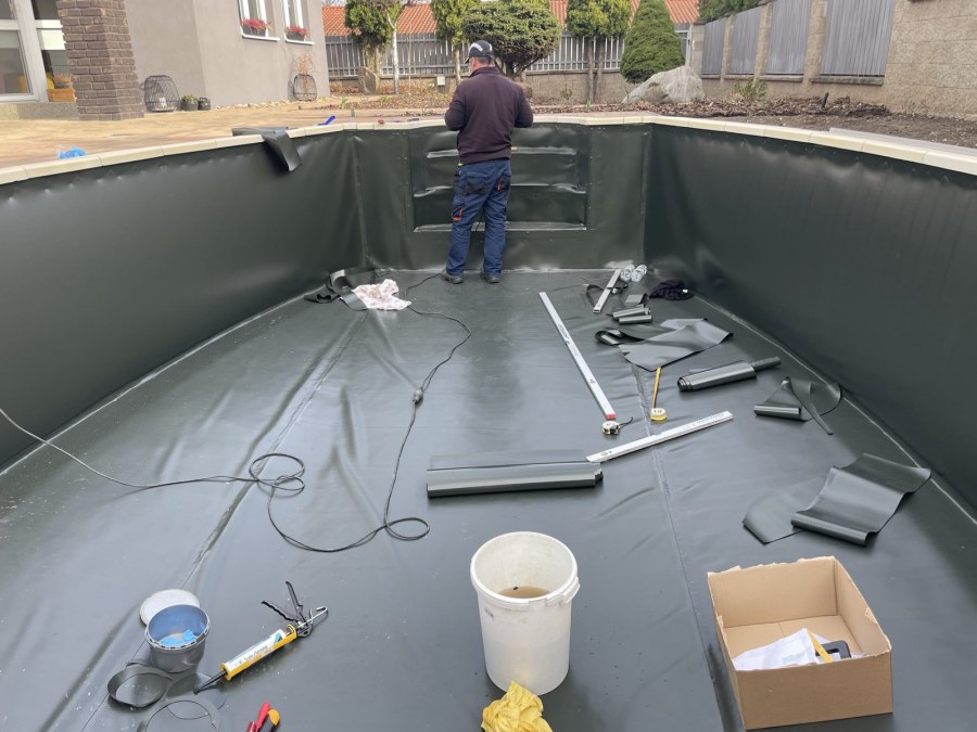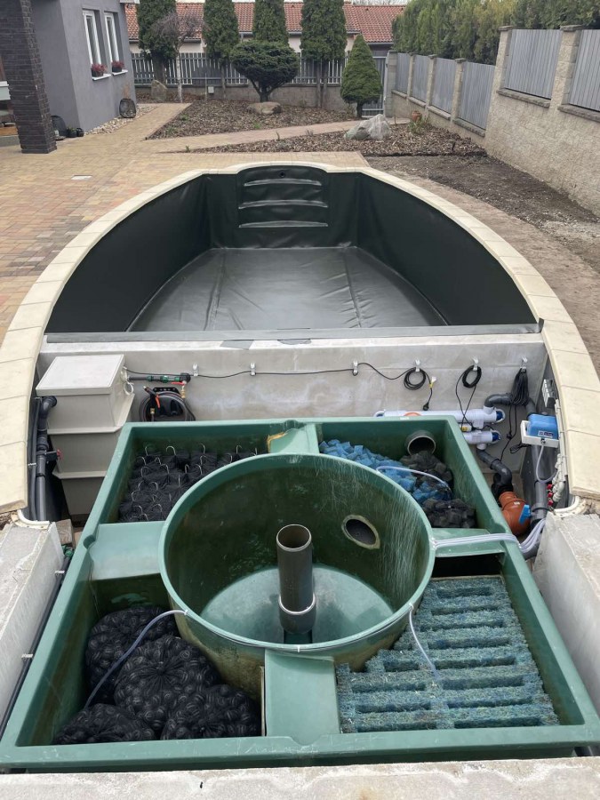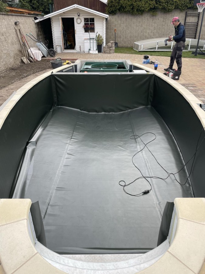 V první fázi se likvidovalo…..vyndala se stará modrá fólie, technologie a zastřešení. Bazén se v cca ¼ přepažil ztraceným bedněním, takže vznikla dost velká technická místnost na odpovídající filtr. Do země se zabetonovali 2 spodní vpusti – gule a do zdi technické místnosti hladinový sběrač- skimmer Oase ProfiSkim Wall 100, od nich se natáhlo potrubí do technické místnosti, které se uzavřelo šoupaty 100mm. Po těchto stavebních úpravách se mohlo začít s foliováním. Nejprve se položila geotextílie 500g, na hrany se navrtali speciální fóliové lišty Fatra Fatranyl PP a pak se začala svařovat jezírková fólie Fatra AquaPlast 805/V olivově zelená přesně dle tvaru jezírka. Po vyfóliování se začala do jezírka napouštět voda a mezi tím naši technici nainstalovali a zapojili technologii. Biologicko-mechanický filtr Tripond Vortex Center C115, na něj se napojila UV lampa TMC Pro Clear 110W a čerpadlo Oase AquaMax Gravity Eco 20000. Vzduchovací motor pro vzduchování jak do jezírka, tak do filtru pro podporu práce bakterií jsme zvolili AquaForte V-60.