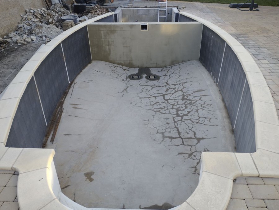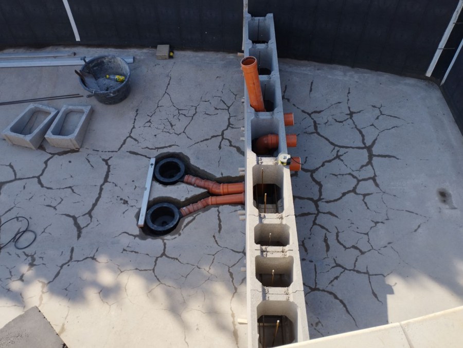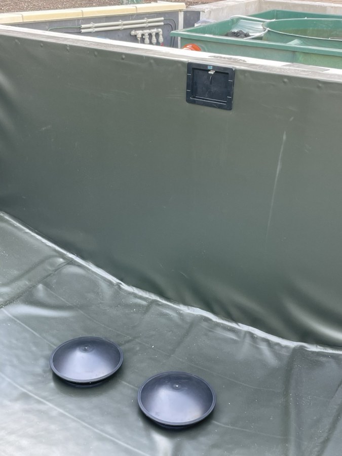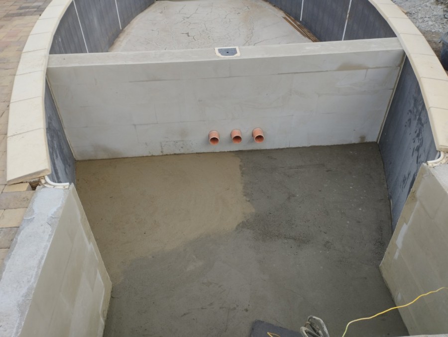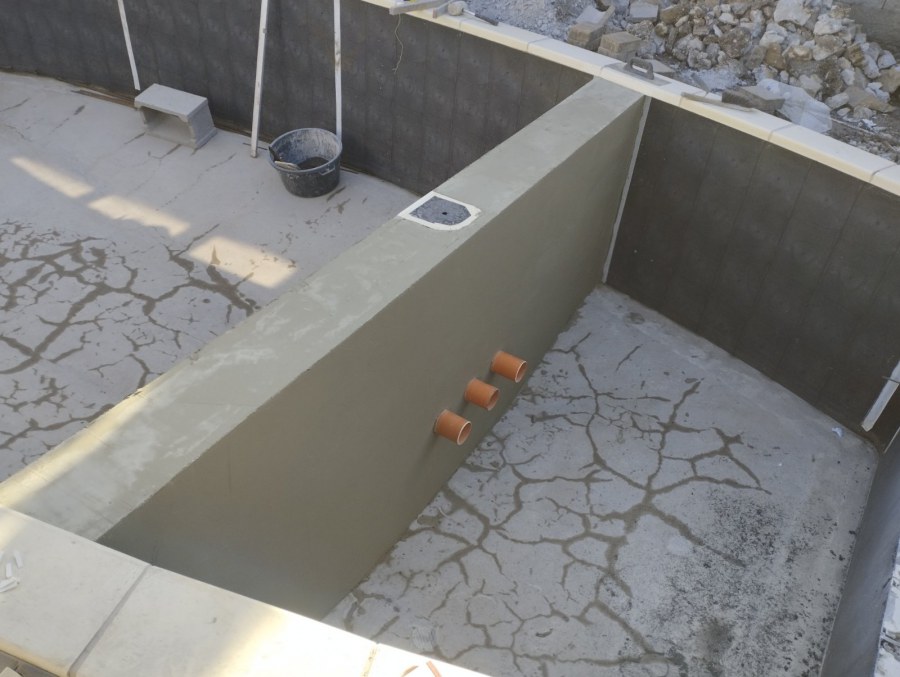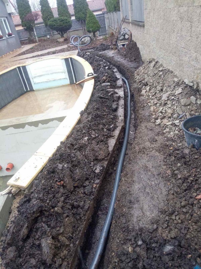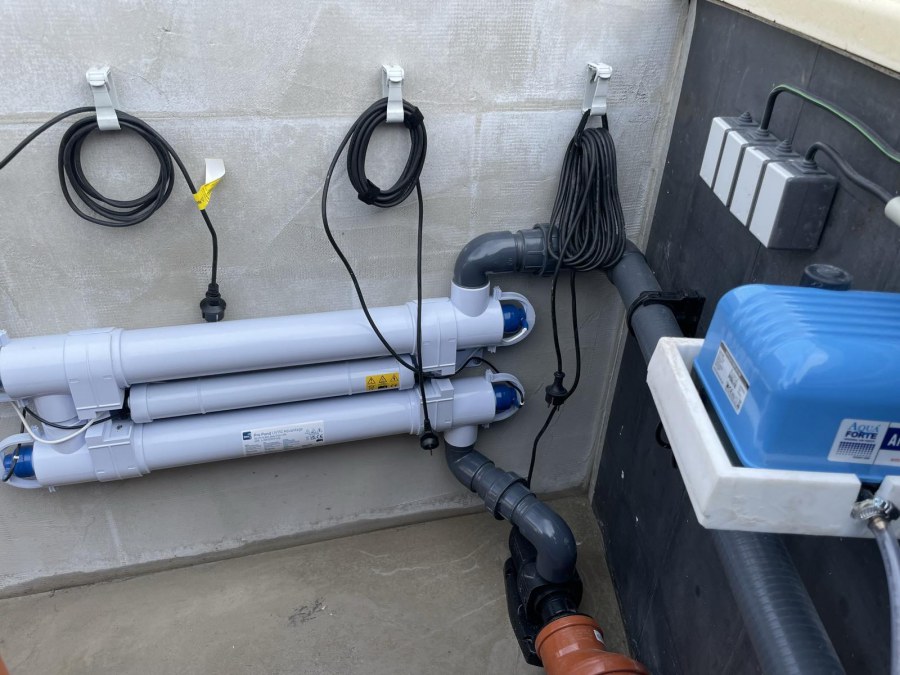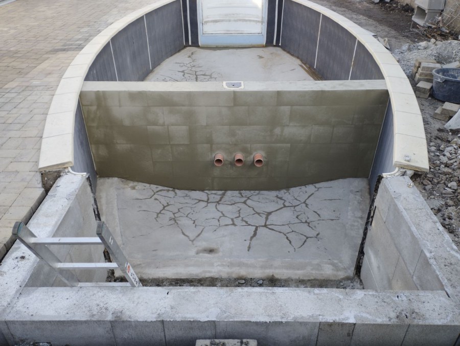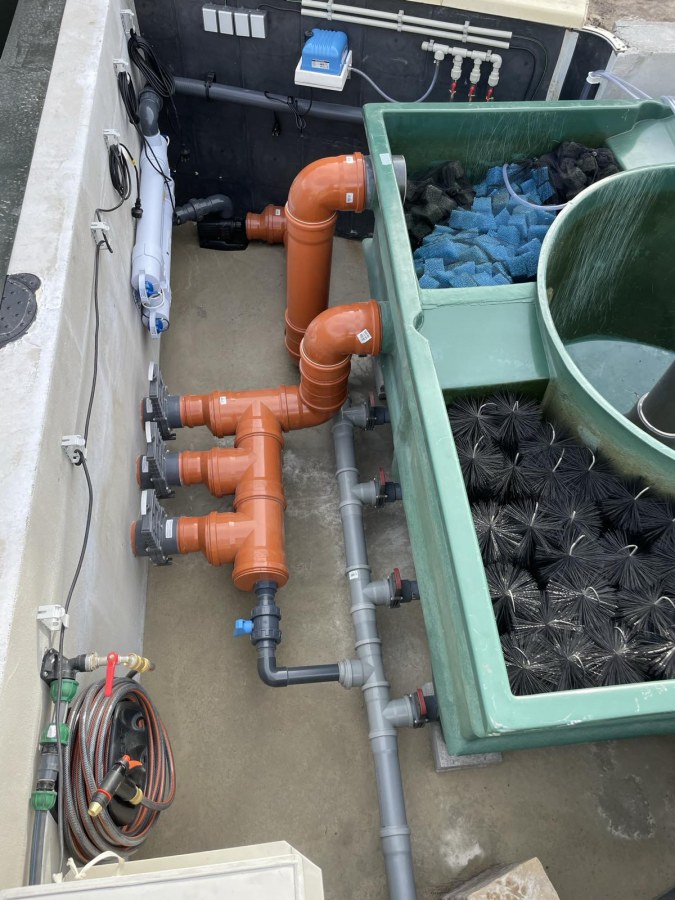 V první fázi se likvidovalo…..vyndala se stará modrá fólie, technologie a zastřešení. Bazén se v cca ¼ přepažil ztraceným bedněním, takže vznikla dost velká technická místnost na odpovídající filtr. Do země se zabetonovali 2 spodní vpusti – gule a do zdi technické místnosti hladinový sběrač- skimmer Oase ProfiSkim Wall 100, od nich se natáhlo potrubí do technické místnosti, které se uzavřelo šoupaty 100mm. Po těchto stavebních úpravách se mohlo začít s foliováním. Nejprve se položila geotextílie 500g, na hrany se navrtali speciální fóliové lišty Fatra Fatranyl PP a pak se začala svařovat jezírková fólie Fatra AquaPlast 805/V olivově zelená přesně dle tvaru jezírka. Po vyfóliování se začala do jezírka napouštět voda a mezi tím naši technici nainstalovali a zapojili technologii. Biologicko-mechanický filtr Tripond Vortex Center C115, na něj se napojila UV lampa TMC Pro Clear 110W a čerpadlo Oase AquaMax Gravity Eco 20000. Vzduchovací motor pro vzduchování jak do jezírka, tak do filtru pro podporu práce bakterií jsme zvolili AquaForte V-60.