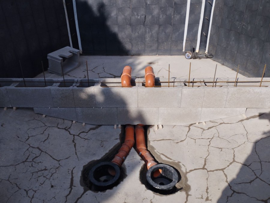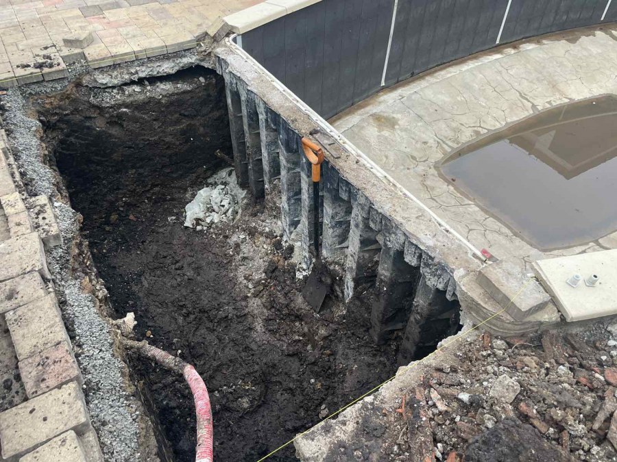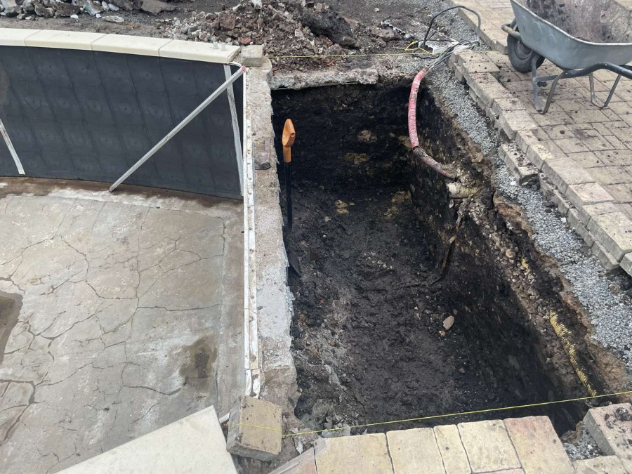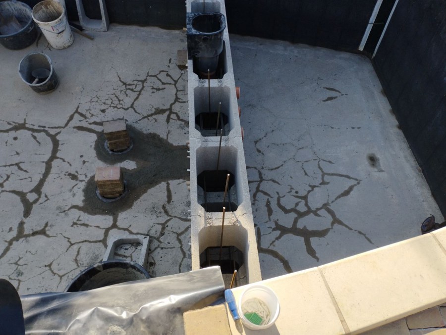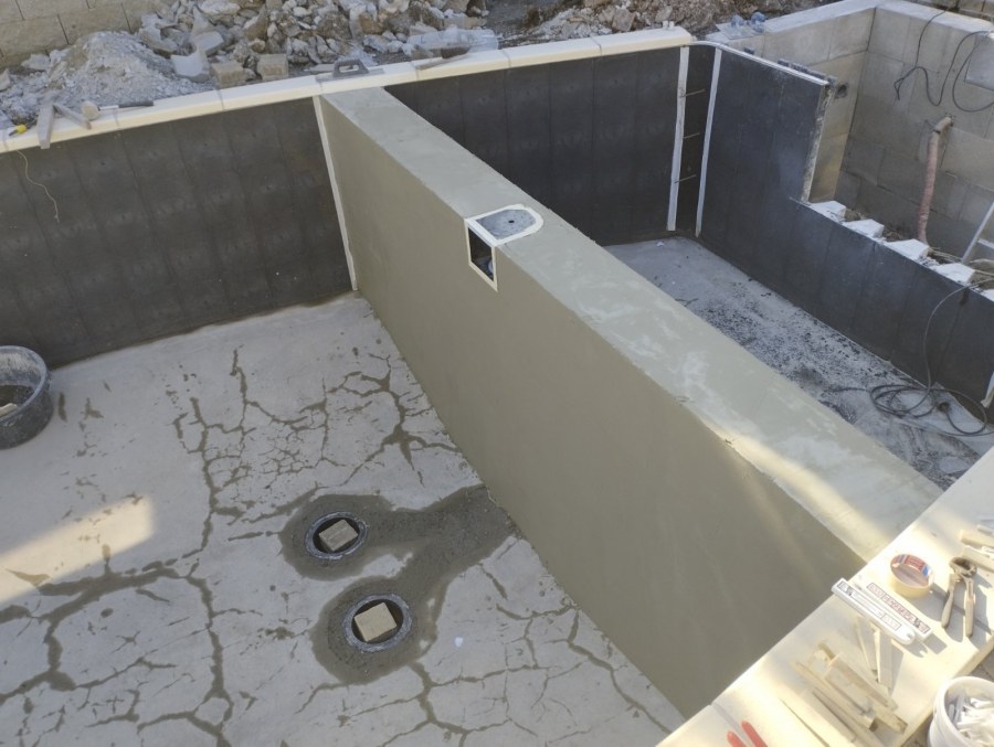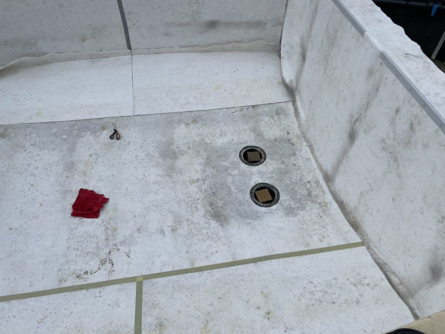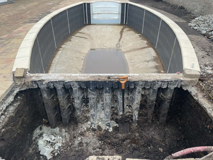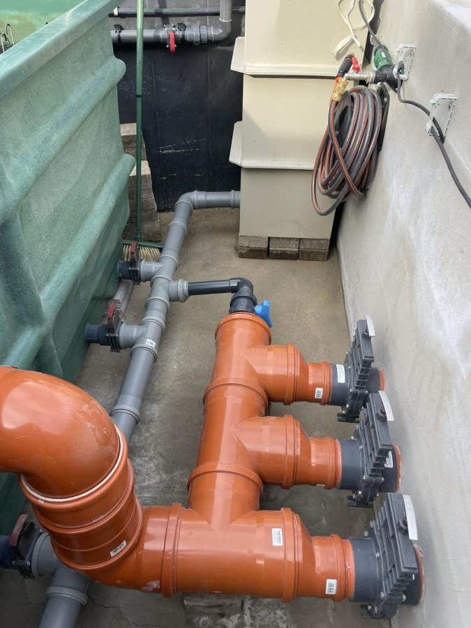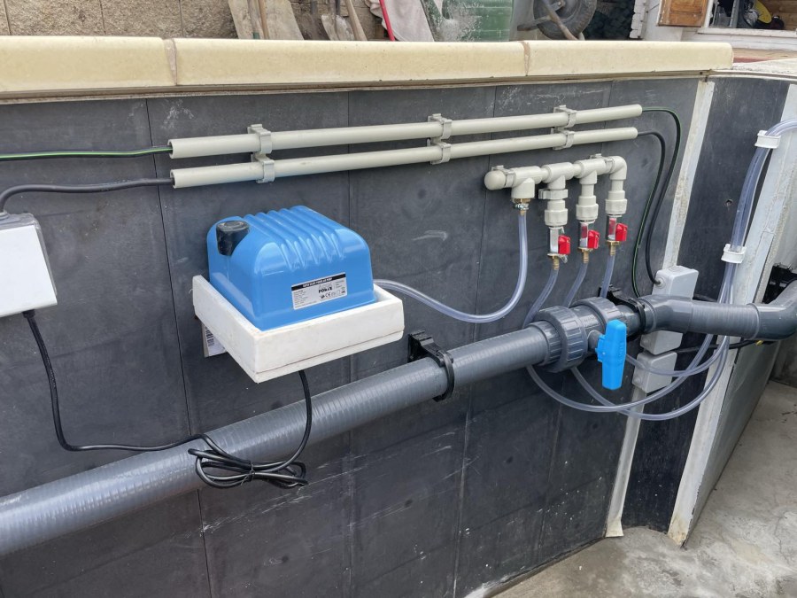 V první fázi se likvidovalo…..vyndala se stará modrá fólie, technologie a zastřešení. Bazén se v cca ¼ přepažil ztraceným bedněním, takže vznikla dost velká technická místnost na odpovídající filtr. Do země se zabetonovali 2 spodní vpusti – gule a do zdi technické místnosti hladinový sběrač- skimmer Oase ProfiSkim Wall 100, od nich se natáhlo potrubí do technické místnosti, které se uzavřelo šoupaty 100mm. Po těchto stavebních úpravách se mohlo začít s foliováním. Nejprve se položila geotextílie 500g, na hrany se navrtali speciální fóliové lišty Fatra Fatranyl PP a pak se začala svařovat jezírková fólie Fatra AquaPlast 805/V olivově zelená přesně dle tvaru jezírka. Po vyfóliování se začala do jezírka napouštět voda a mezi tím naši technici nainstalovali a zapojili technologii. Biologicko-mechanický filtr Tripond Vortex Center C115, na něj se napojila UV lampa TMC Pro Clear 110W a čerpadlo Oase AquaMax Gravity Eco 20000. Vzduchovací motor pro vzduchování jak do jezírka, tak do filtru pro podporu práce bakterií jsme zvolili AquaForte V-60.