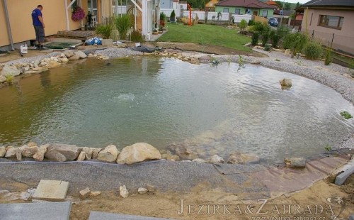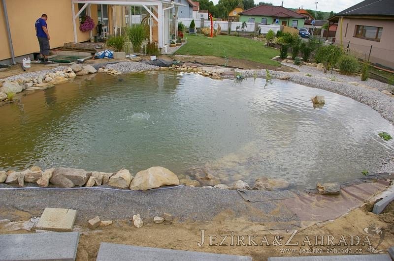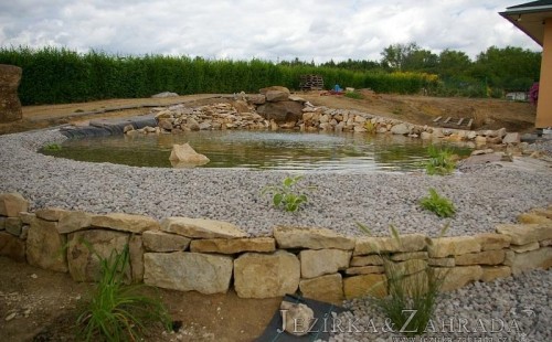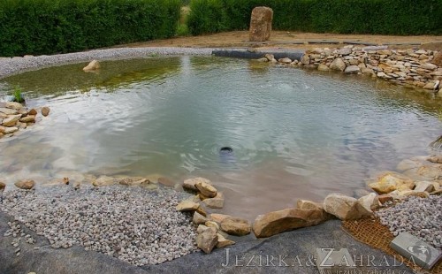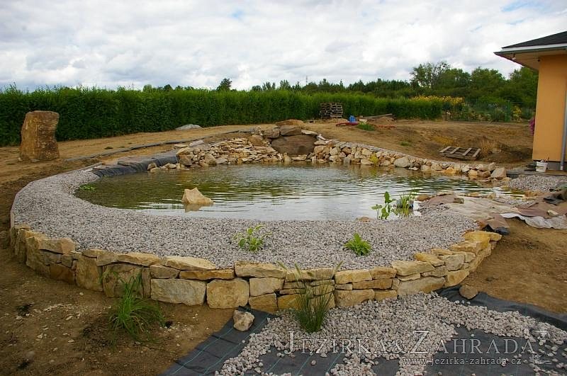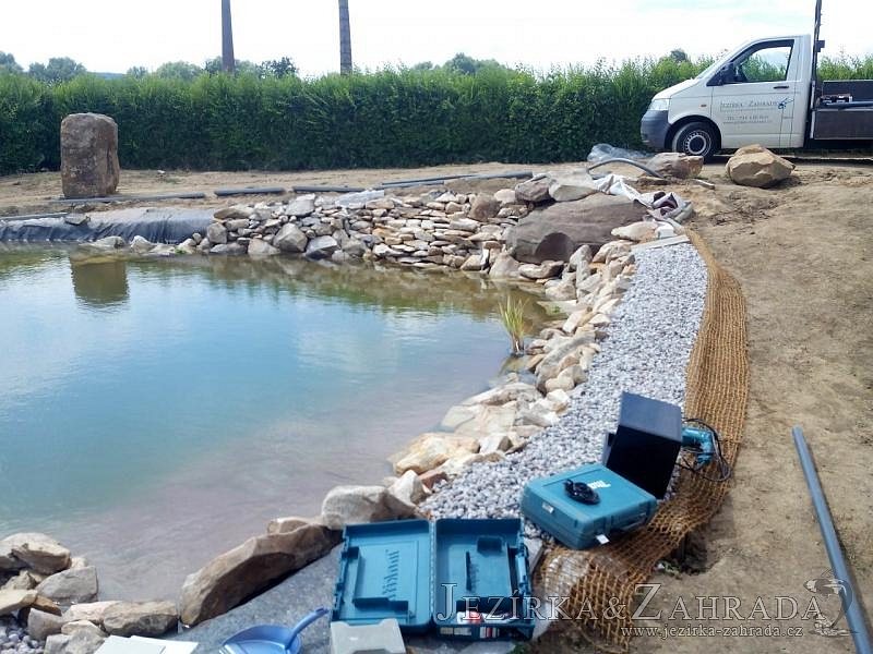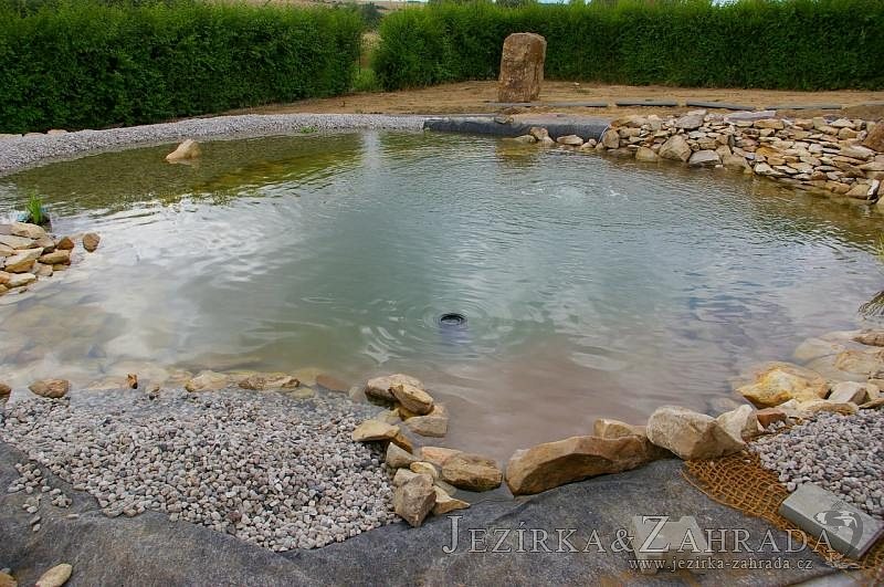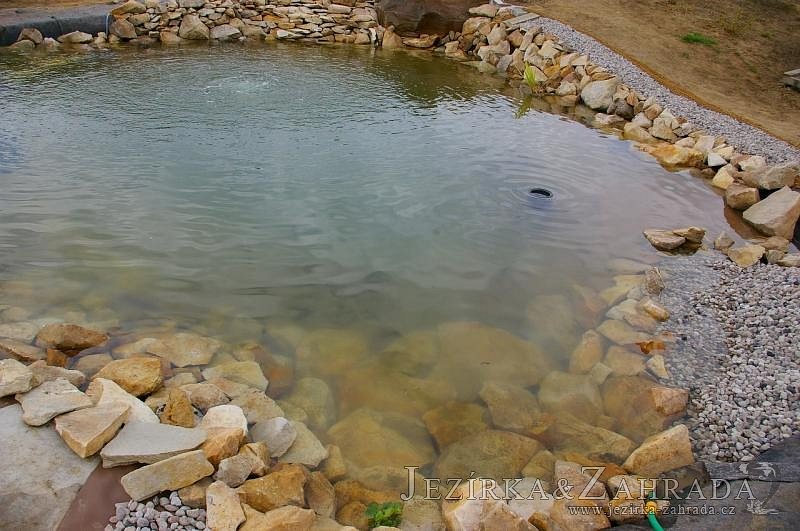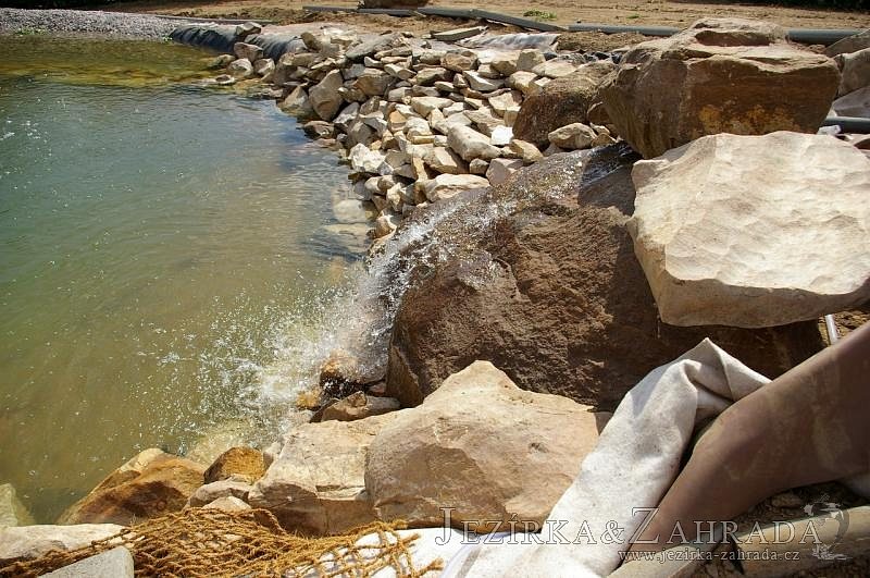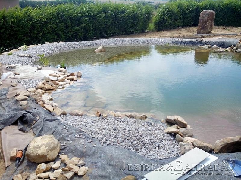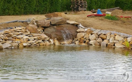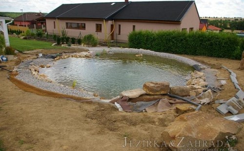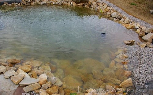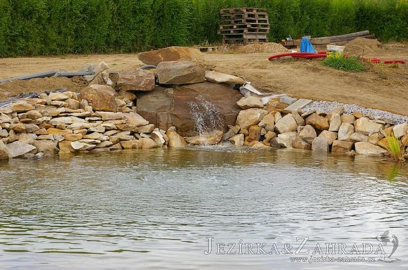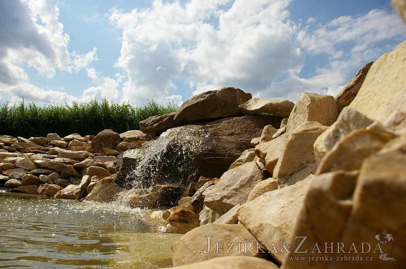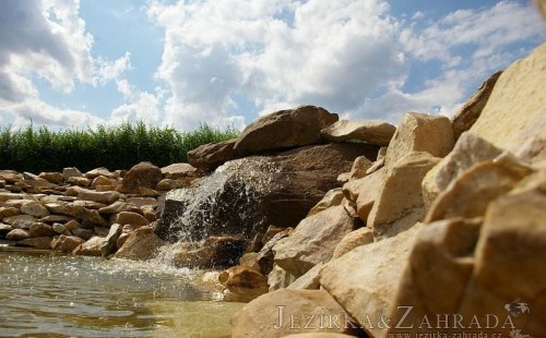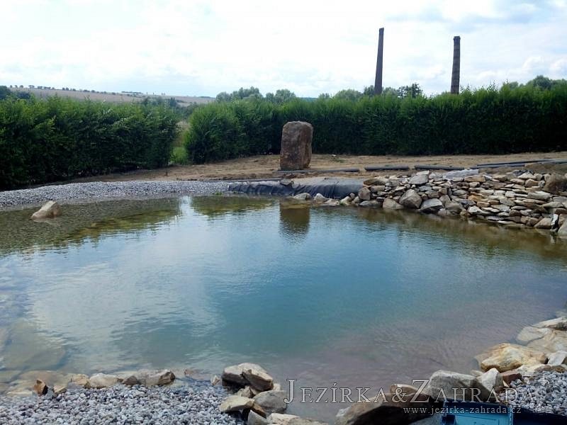 U této realizace koupacího jezírka ve Strupčicích jsme se podíleli: stavebním dozorem, položením potrubí k technologii, zapískováním, položením geotextílie 500g a svařením jezírkové fólie Fatra Aquaplast 805 1,5mm. Na zákazníkovo přání zde byla použita hnědá fólie Aquaplast. Pro tento gravitační systém bylo navrženo: filtr Tripond Center Vortex C50, UV lampa TMC Pro Pond Advantage 110W, čerpadlo pro systém Aquaking ECO-FTP 13000 a na vodopád Aquaking ECO-FTP 16000 a vzduchovací motor Hailea HAP-100. Jezírko se dotvářelo okrasnými kameny a dosypal se okrasný kačírek. Klient si následně dosázel okrasné stromky a traviny.