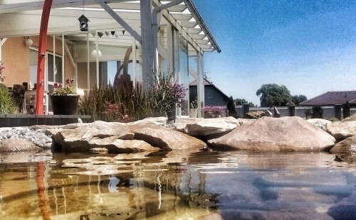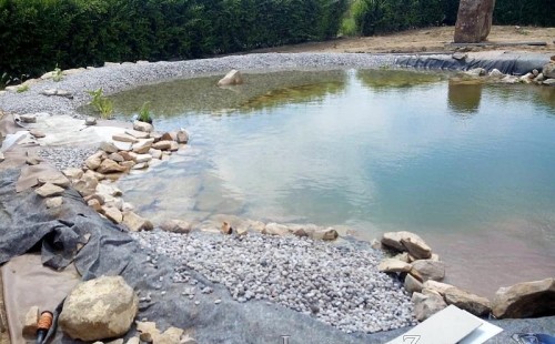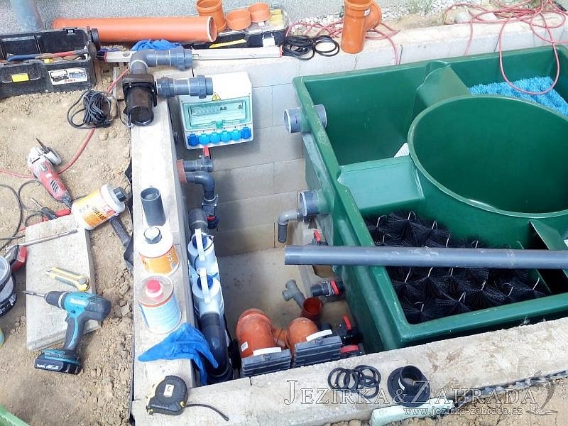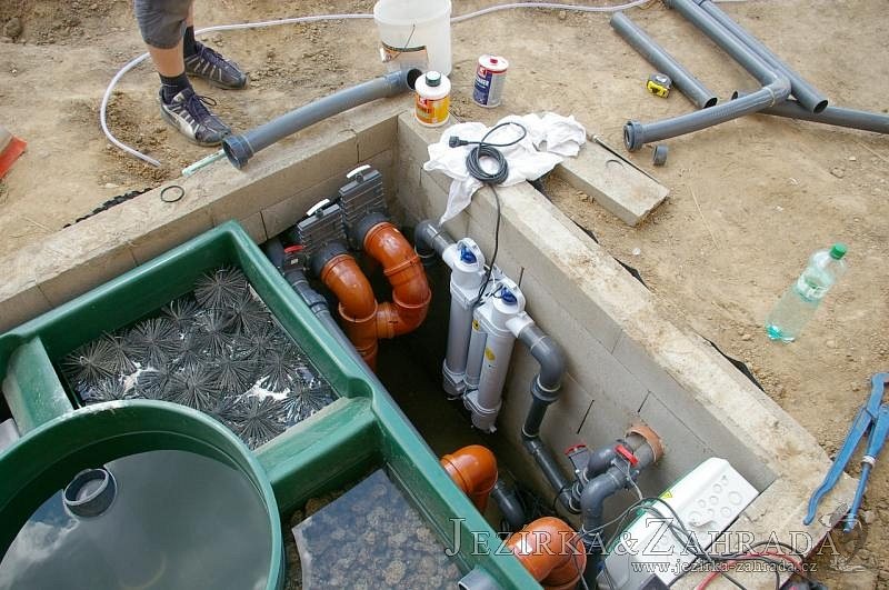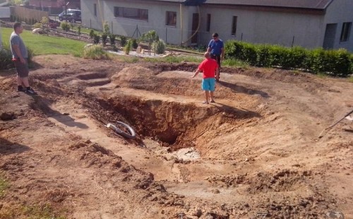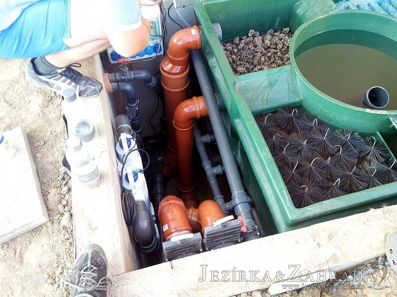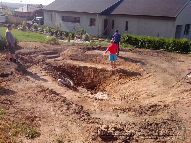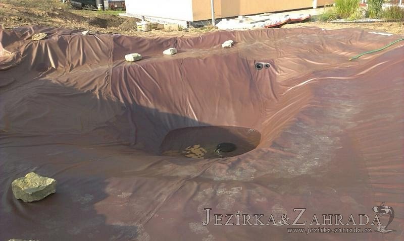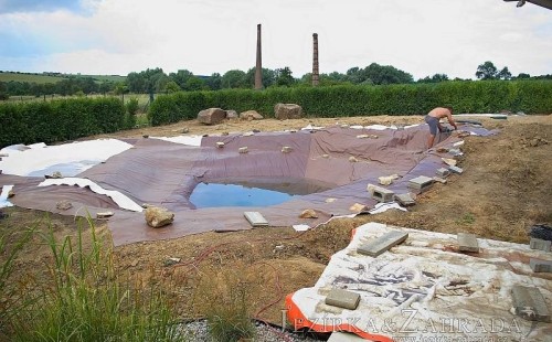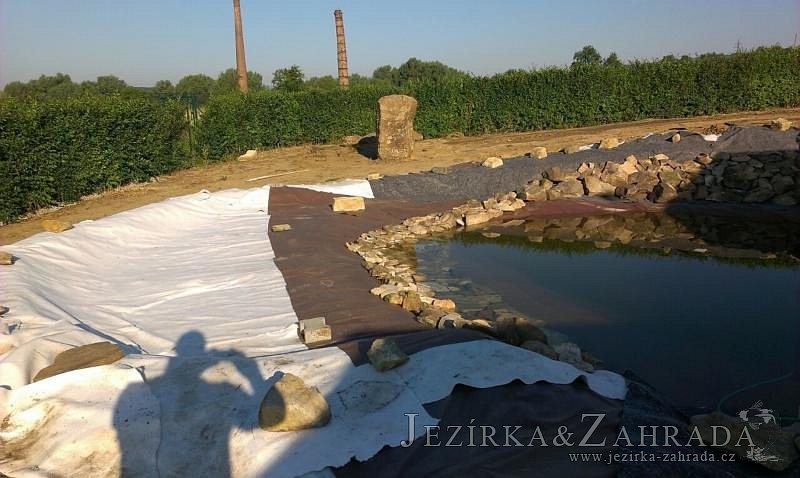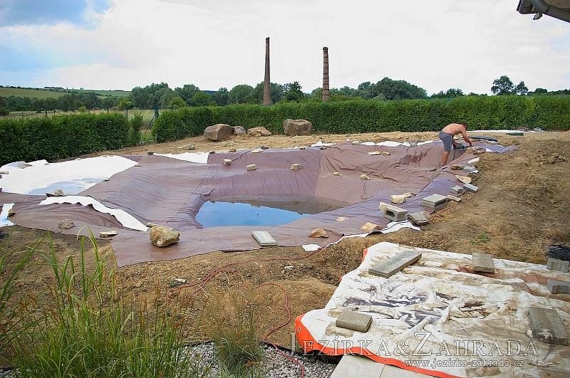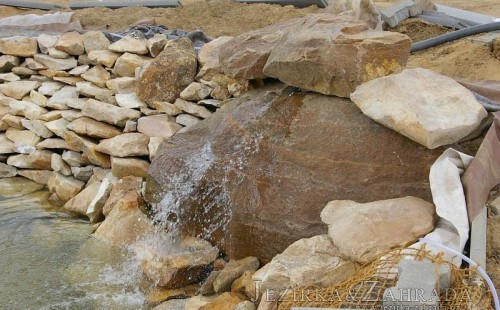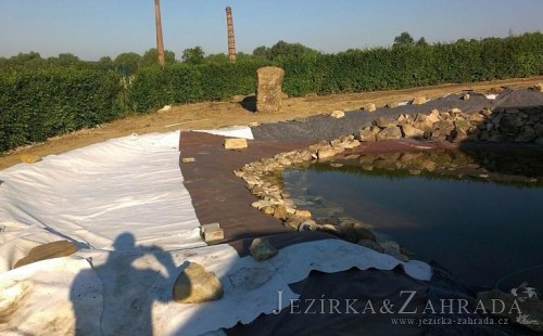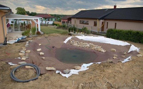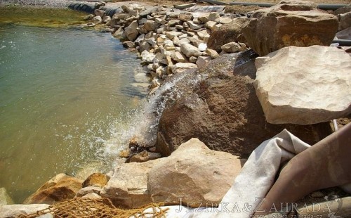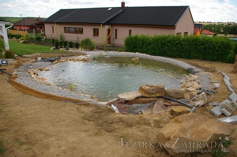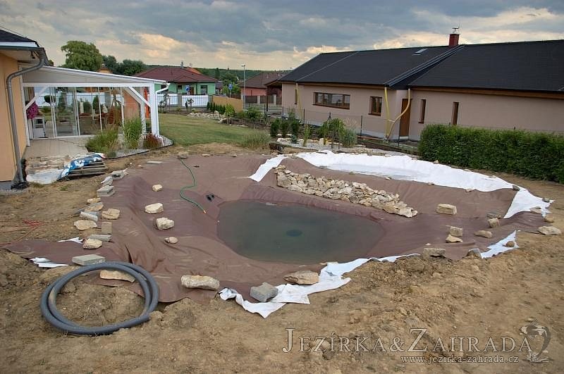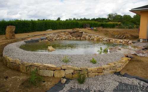 U této realizace koupacího jezírka ve Strupčicích jsme se podíleli: stavebním dozorem, položením potrubí k technologii, zapískováním, položením geotextílie 500g a svařením jezírkové fólie Fatra Aquaplast 805 1,5mm. Na zákazníkovo přání zde byla použita hnědá fólie Aquaplast. Pro tento gravitační systém bylo navrženo: filtr Tripond Center Vortex C50, UV lampa TMC Pro Pond Advantage 110W, čerpadlo pro systém Aquaking ECO-FTP 13000 a na vodopád Aquaking ECO-FTP 16000 a vzduchovací motor Hailea HAP-100. Jezírko se dotvářelo okrasnými kameny a dosypal se okrasný kačírek. Klient si následně dosázel okrasné stromky a traviny.