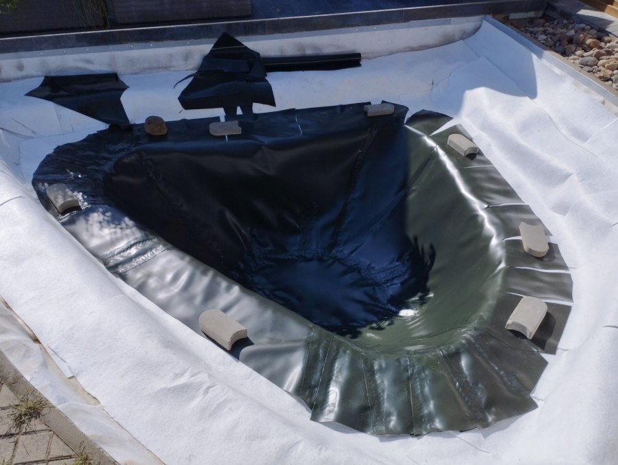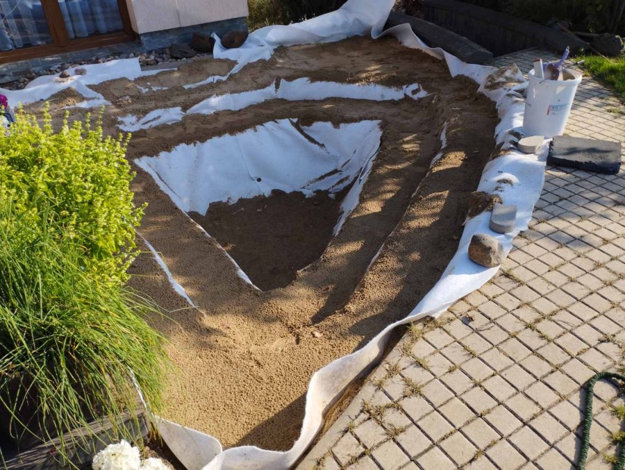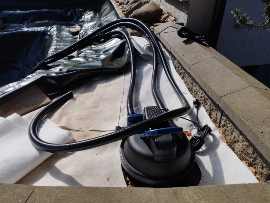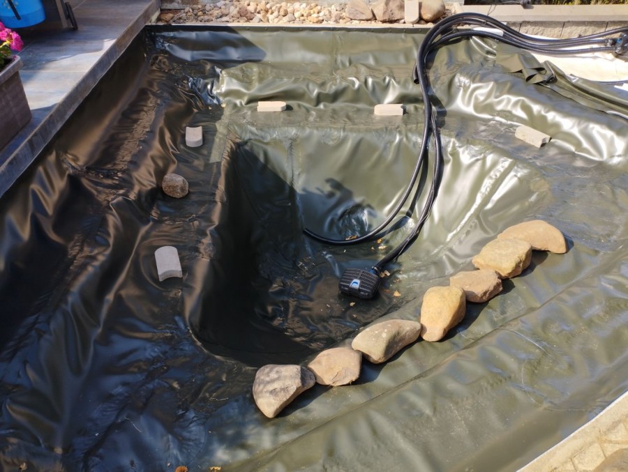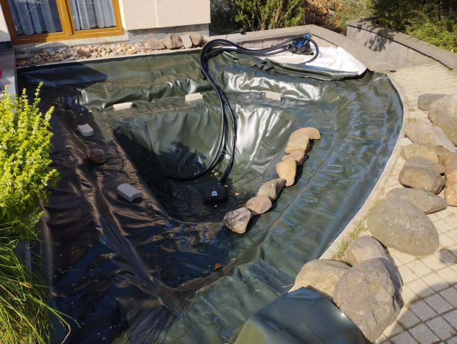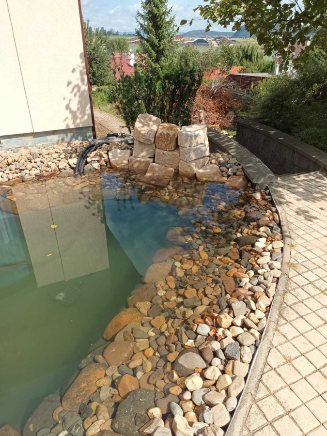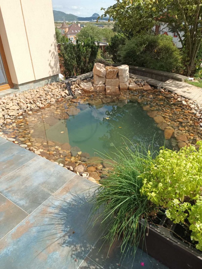 Toto jezírko je krásná ukázka toho, jak pěkné může být malé jezírko s hobby technologií. Klient nás oslovil s tím, že má u terasy prázdné rohové místo, kde by se mu líbilo malé okrasné jezírko. Dle návrhu se ručně vykopal tvar jezírka, vytvarovali se menší pobřežní zóny, dno se pokrylo kopaným pískem a na písek se pak položila geotextílie 500g a na ní se začala pokládat jezírková fólie Fatra Aquaplast 805/V olivově zelená. Po položení fólie se na dno jezírka položilo čerpadlo Oase AquaMax Eco Classic 14500, to se napojilo na tlakový filtr Oase FiltoClear 31000. Tento typ filtrace lze ze 2/3 zakopat a vrchní díl schovat krycím kamenem Oase FiltoCap. Zakončení jezírka jako položení kamenů osazení květinami si již klienti udělali sami.