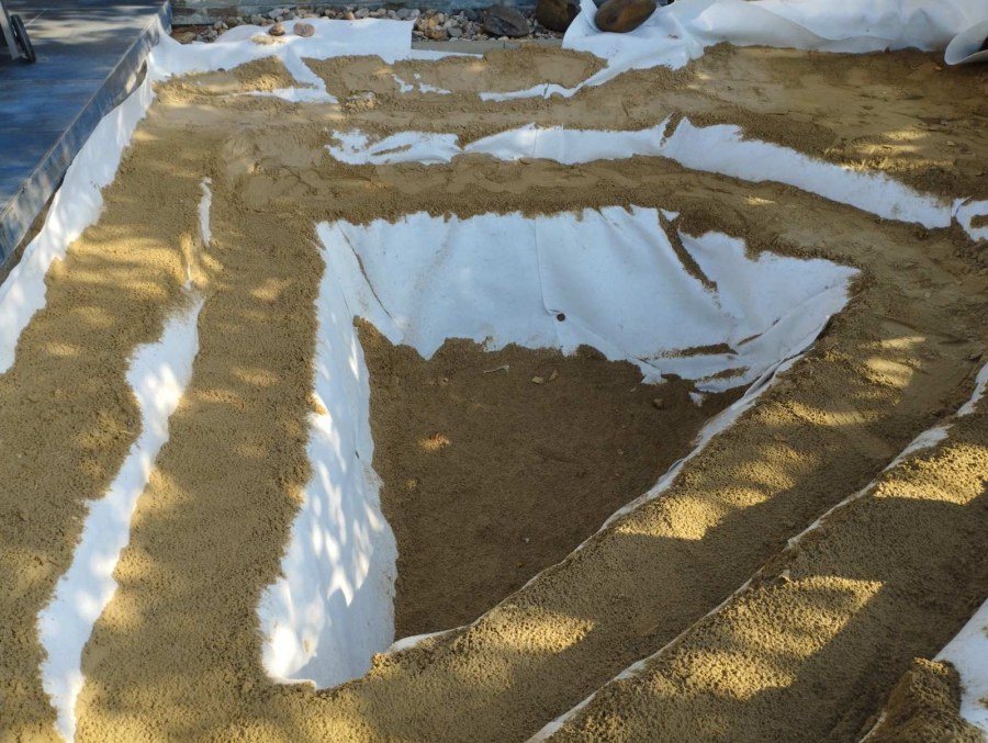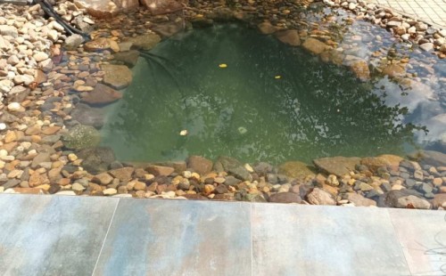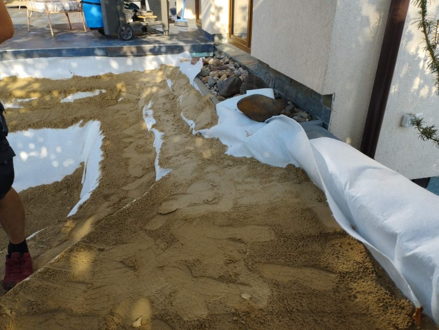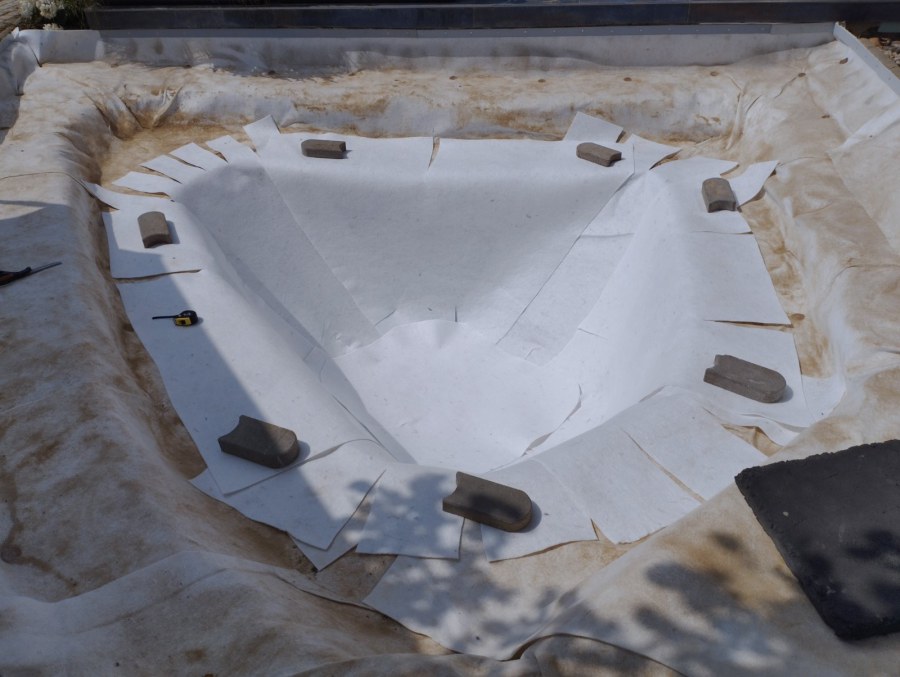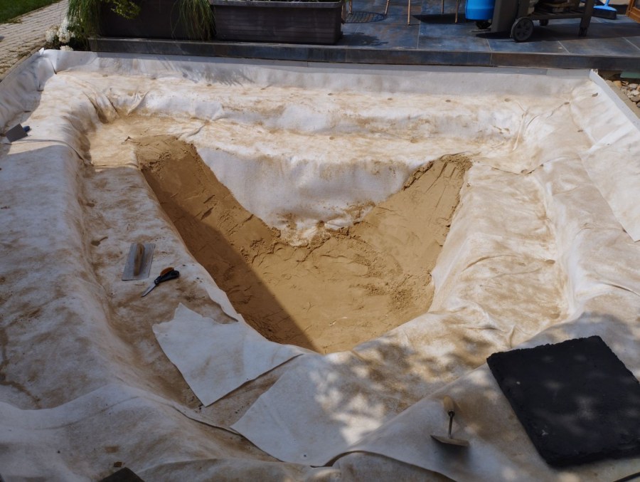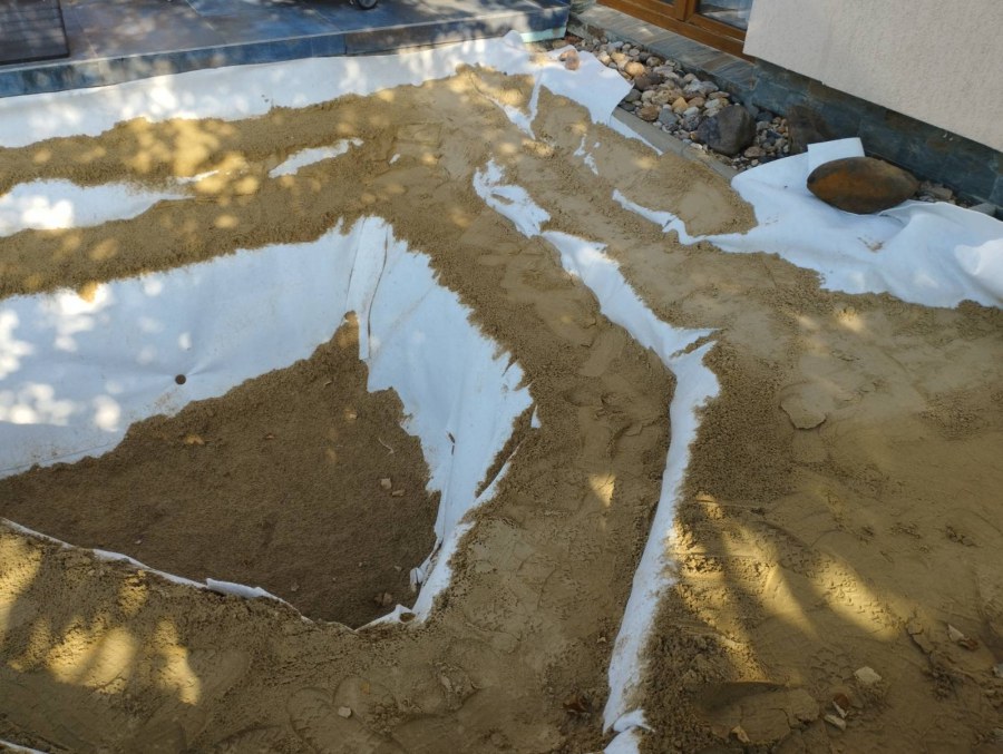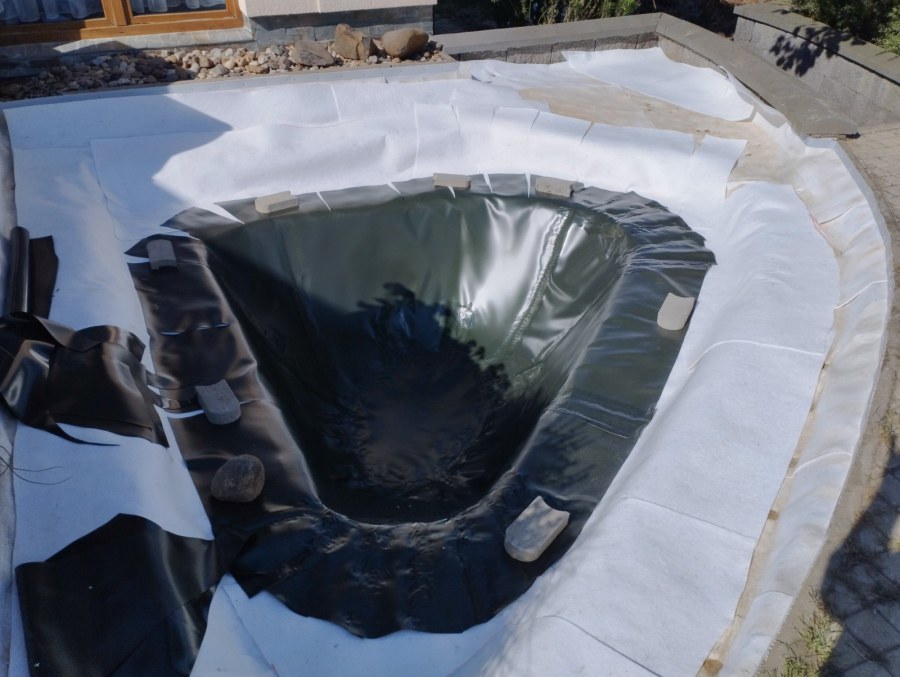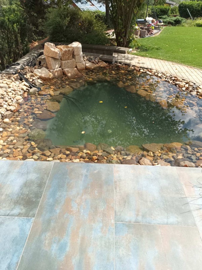 Toto jezírko je krásná ukázka toho, jak pěkné může být malé jezírko s hobby technologií. Klient nás oslovil s tím, že má u terasy prázdné rohové místo, kde by se mu líbilo malé okrasné jezírko. Dle návrhu se ručně vykopal tvar jezírka, vytvarovali se menší pobřežní zóny, dno se pokrylo kopaným pískem a na písek se pak položila geotextílie 500g a na ní se začala pokládat jezírková fólie Fatra Aquaplast 805/V olivově zelená. Po položení fólie se na dno jezírka položilo čerpadlo Oase AquaMax Eco Classic 14500, to se napojilo na tlakový filtr Oase FiltoClear 31000. Tento typ filtrace lze ze 2/3 zakopat a vrchní díl schovat krycím kamenem Oase FiltoCap. Zakončení jezírka jako položení kamenů osazení květinami si již klienti udělali sami.