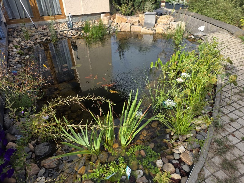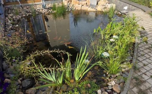 Toto jezírko je krásná ukázka toho, jak pěkné může být malé jezírko s hobby technologií. Klient nás oslovil s tím, že má u terasy prázdné rohové místo, kde by se mu líbilo malé okrasné jezírko. Dle návrhu se ručně vykopal tvar jezírka, vytvarovali se menší pobřežní zóny, dno se pokrylo kopaným pískem a na písek se pak položila geotextílie 500g a na ní se začala pokládat jezírková fólie Fatra Aquaplast 805/V olivově zelená. Po položení fólie se na dno jezírka položilo čerpadlo Oase AquaMax Eco Classic 14500, to se napojilo na tlakový filtr Oase FiltoClear 31000. Tento typ filtrace lze ze 2/3 zakopat a vrchní díl schovat krycím kamenem Oase FiltoCap. Zakončení jezírka jako položení kamenů osazení květinami si již klienti udělali sami. Později ještě připojili do rohu jezírka malý nerezový efekt Oase WaterFall Kit 30 a k němu čerpadlo Oase AquaMax Eco Classic 3500. Po dokončení všech prací osadili jezírko Koi kapry.