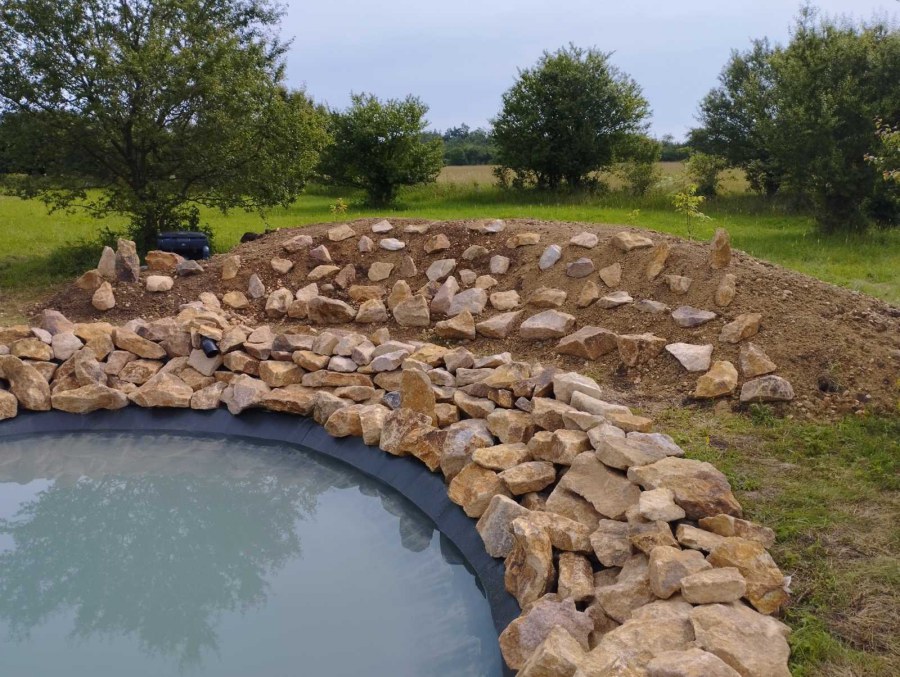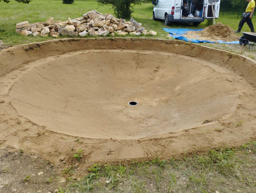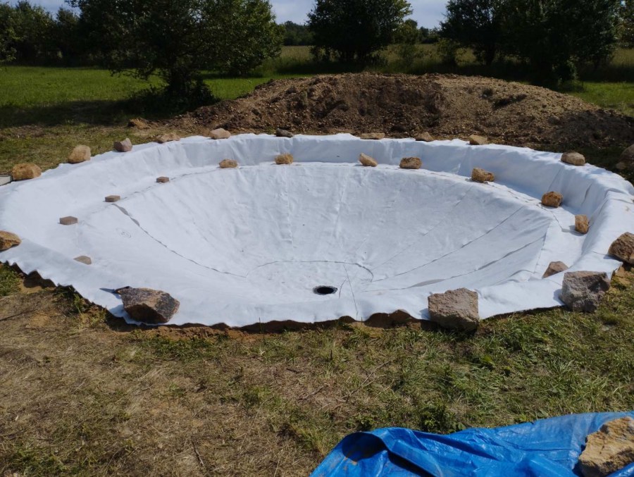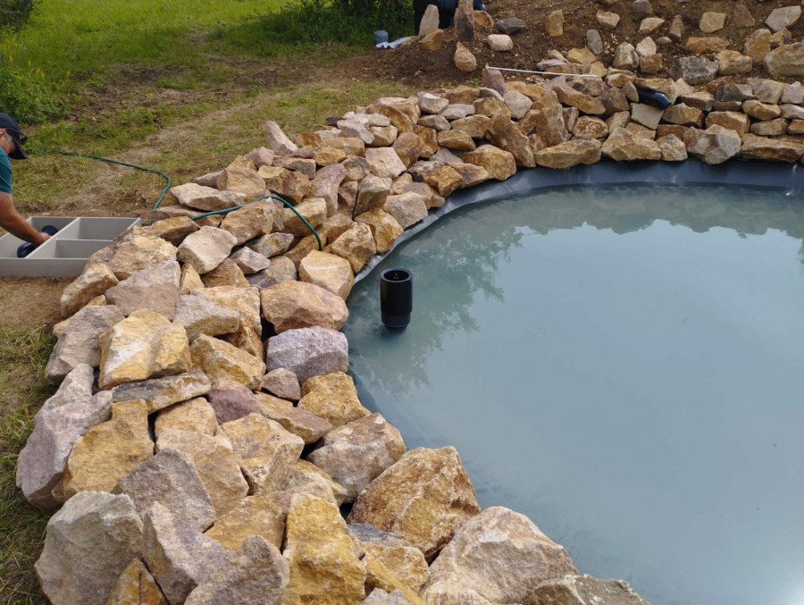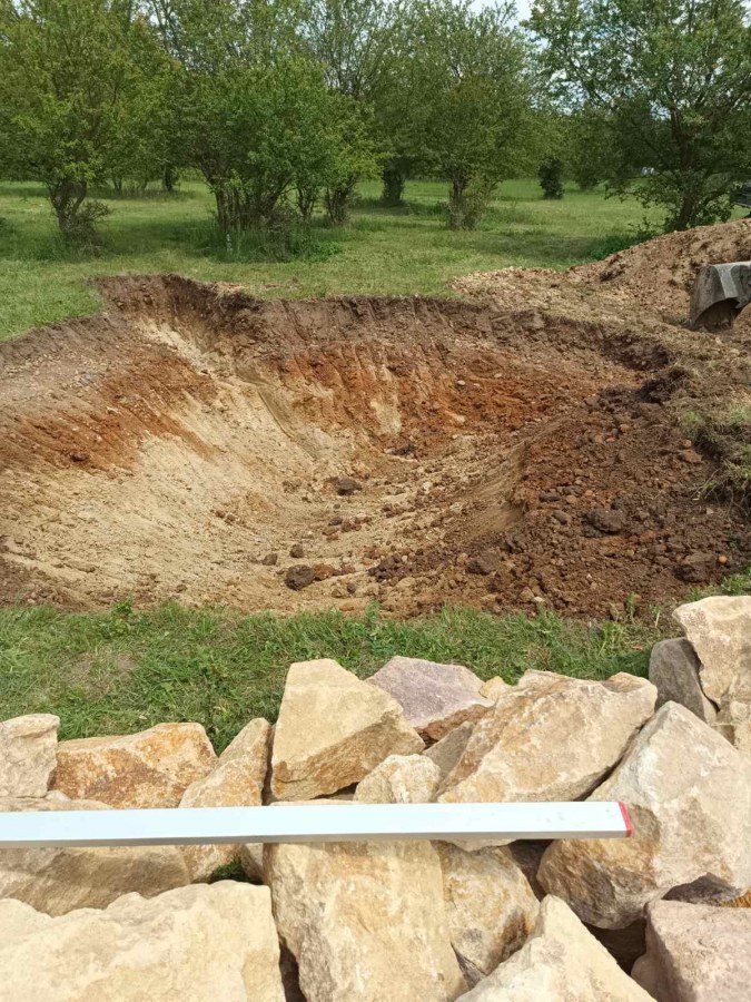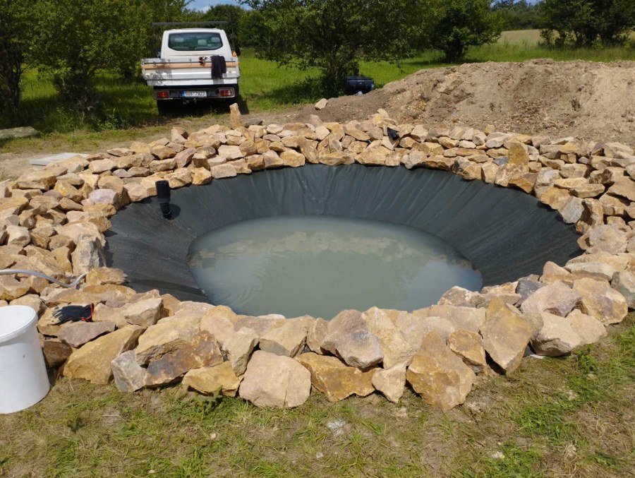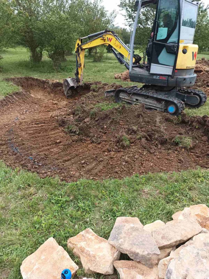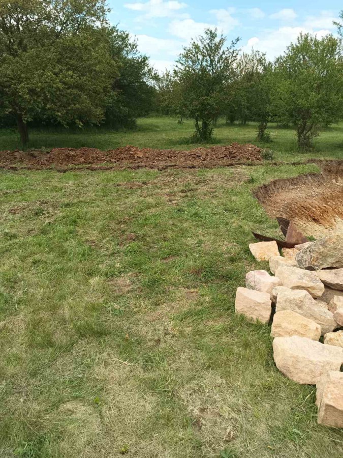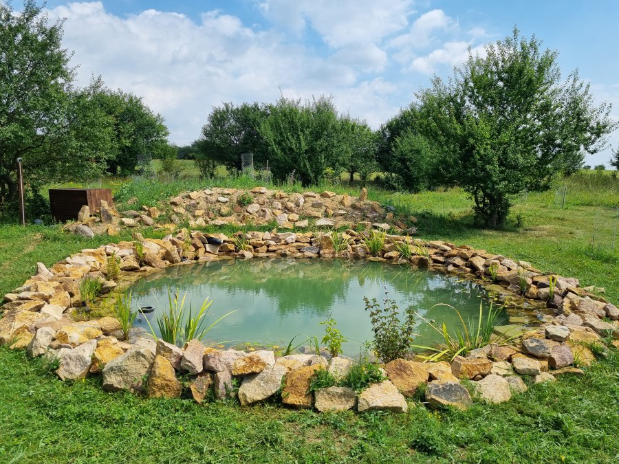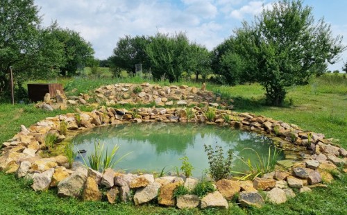 Toto jezírko uprostřed sadu jsme stavili na klíč jako překvapení pro partnerku. Začali jsme vytyčením tvaru jezírka a následně vybagrováním. Poté se ručně dotvarovali pobřežní zóny a dočistili hrany. Vykopal se základ pro čerpadlovou šachtu, vybetonoval se podklad, aby se šachta pod tíhou vody nepropadala. Na dno jezírka se položila gule, od ní se natáhlo potrubí k čerpadlové šachtě, stejně se postupovalo se skimmerem Oase Aquaskim Gravity, tam se připravila na stěnu fóliová příruba 63mm a od ní se opět vedlo potrubí k čerpadlové šachtě. Po těchto úpravách se celé jezírko pokrylo kopaným pískem, na něj se položila geotextílie 500g a pak se začala pokládat jezírková fólie Fatra Aquaplast 805/V olivově zelená. Když bylo vyfóliováno, položili se na pobřežní zóny kameny Kubo a zasadili květiny. Zatím co se napouštěla voda, technici zapojovali technologii. Vzhledem k místu a požadavkům na nenáročnost obsluhy jsme zvolili filtr Oase BioTec ScreenMatic2 90000 na něj jsme pověsili UV lampu Oase Bitron C 55W. Do čerpadlové šachty jsme zapojili čerpadlo AquaForte O-series 16000 které čerpá vodu z čerpadlové šachty do filtrace odkud následně vytéká čistá voda zpět do jezírka samospádem.